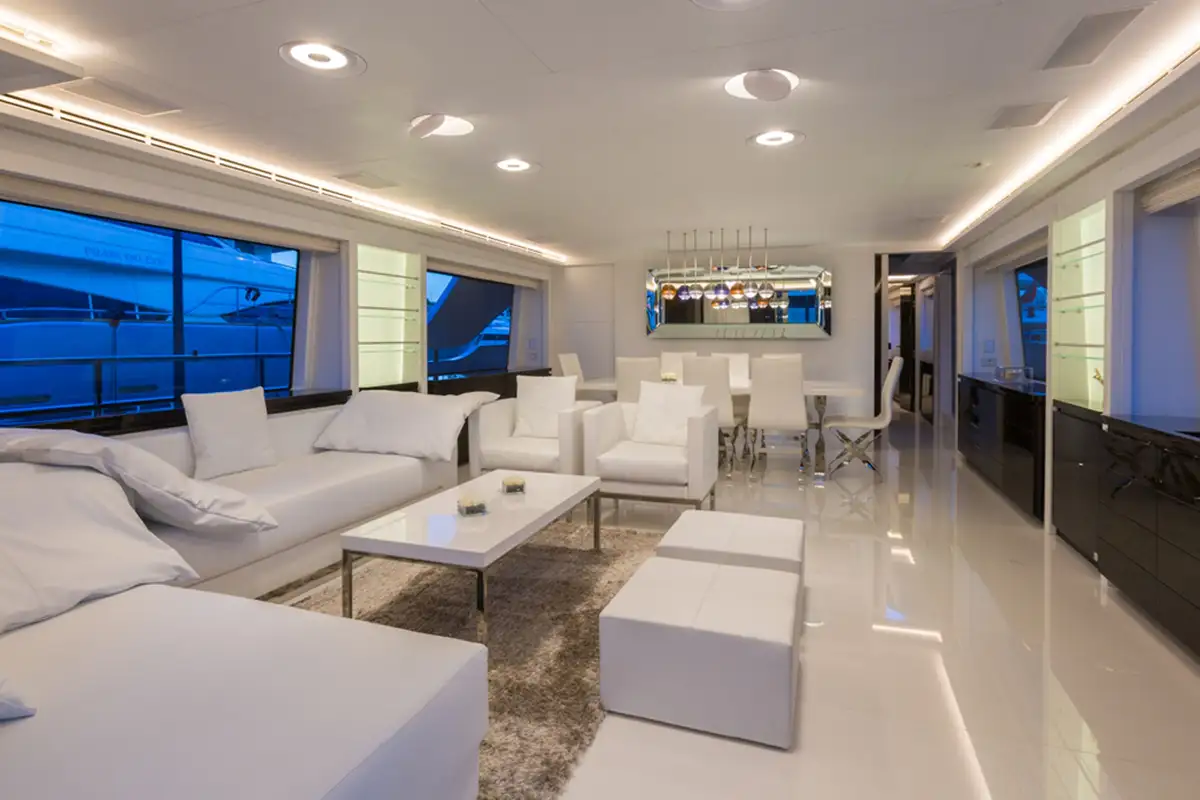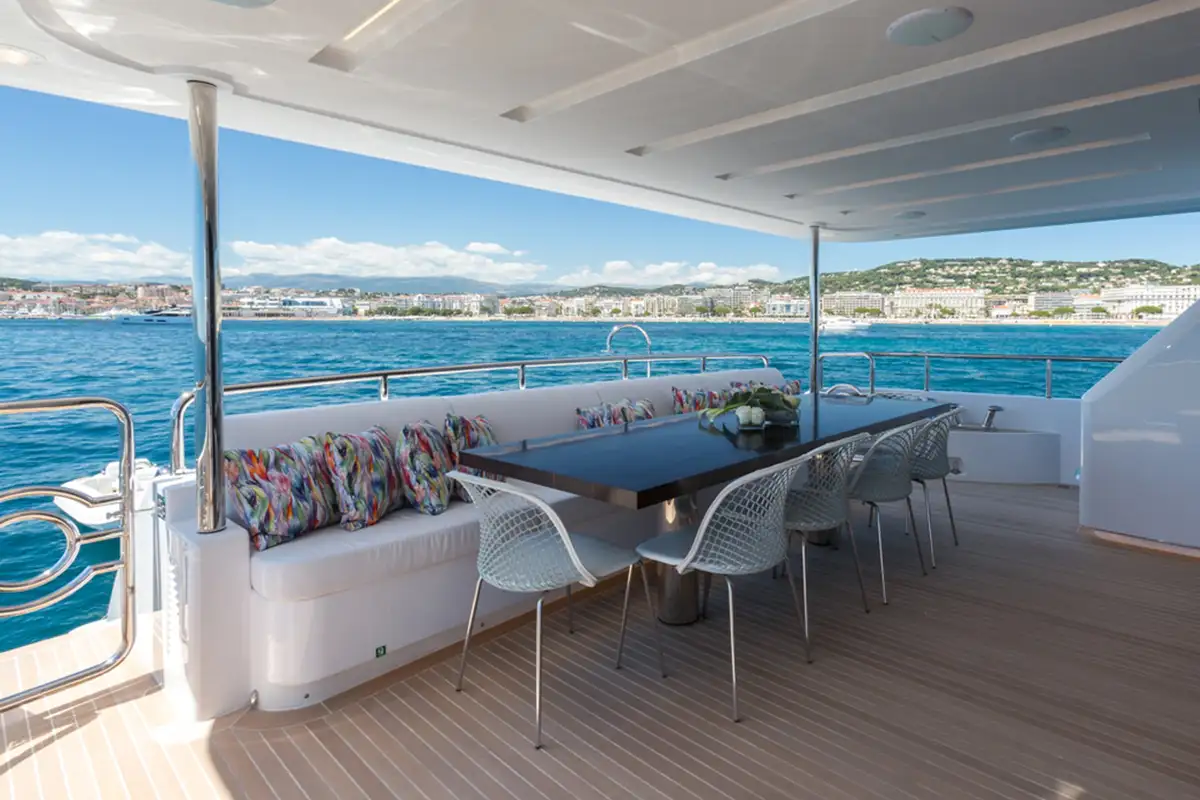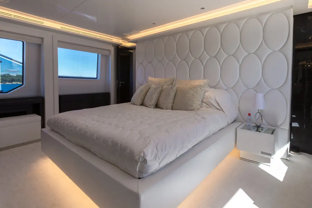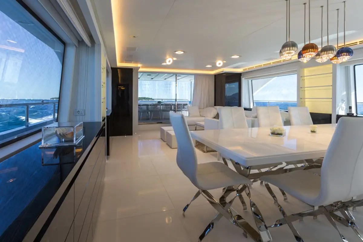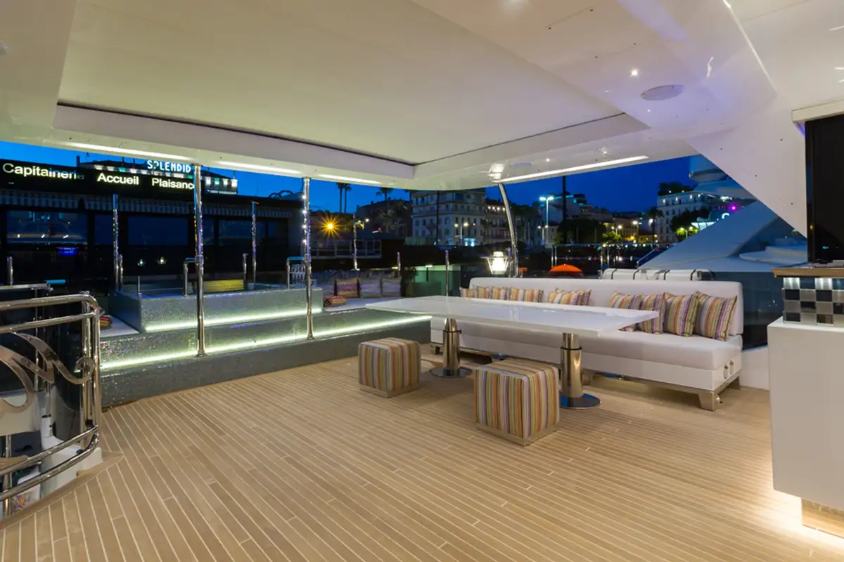 Her exterior spaces are thoughtfully arranged to embrace open-air living at its finest. The expansive flybridge features ample sun loungers, a wet bar, and a shaded dining area, creating the perfect setting for long lunches or sunset cocktails. Aft, the main deck offers al fresco dining with panoramic views, while forward, a private bow lounge invites guests to sunbathe in complete tranquillity.