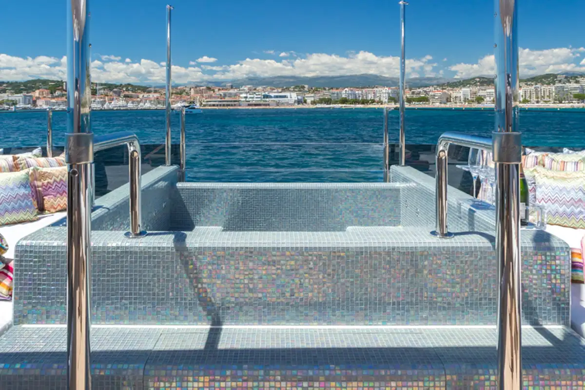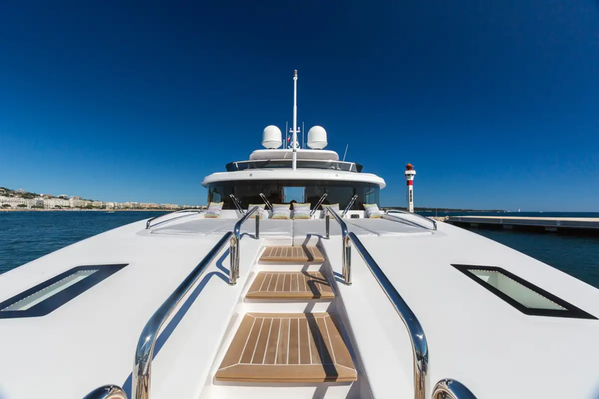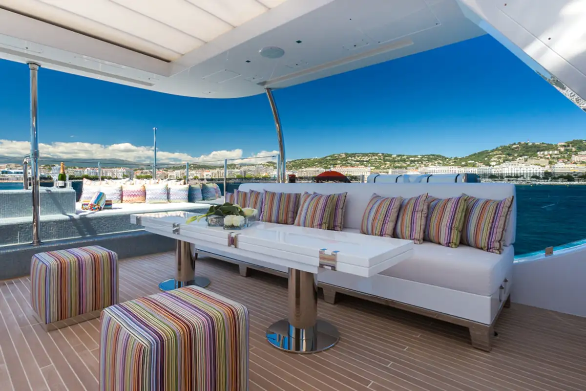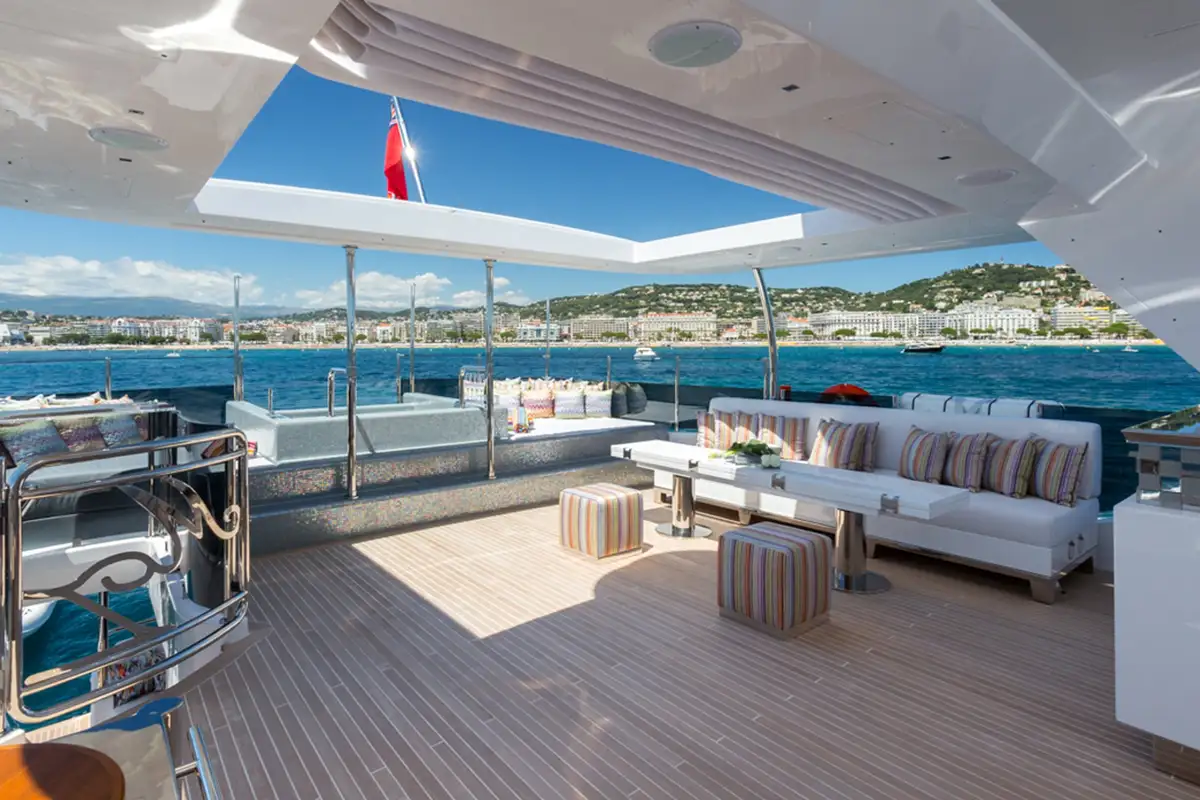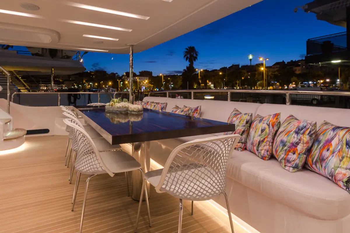 Her exterior spaces are thoughtfully arranged to embrace open-air living at its finest. The expansive flybridge features ample sun loungers, a wet bar, and a shaded dining area, creating the perfect setting for long lunches or sunset cocktails. Aft, the main deck offers al fresco dining with panoramic views, while forward, a private bow lounge invites guests to sunbathe in complete tranquillity.