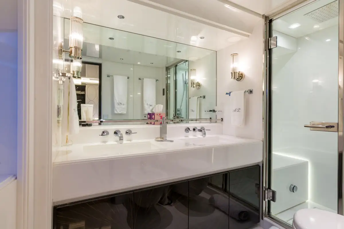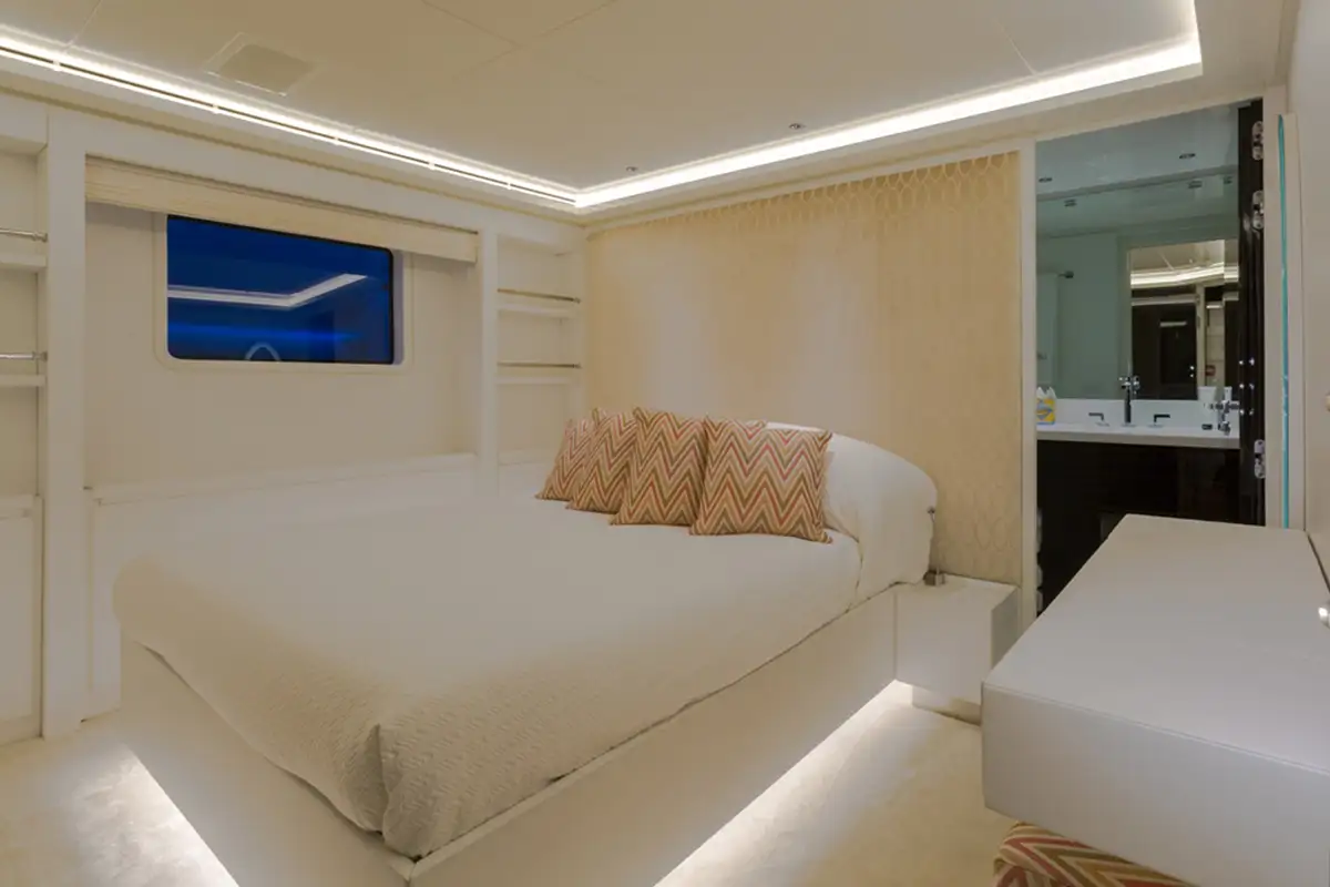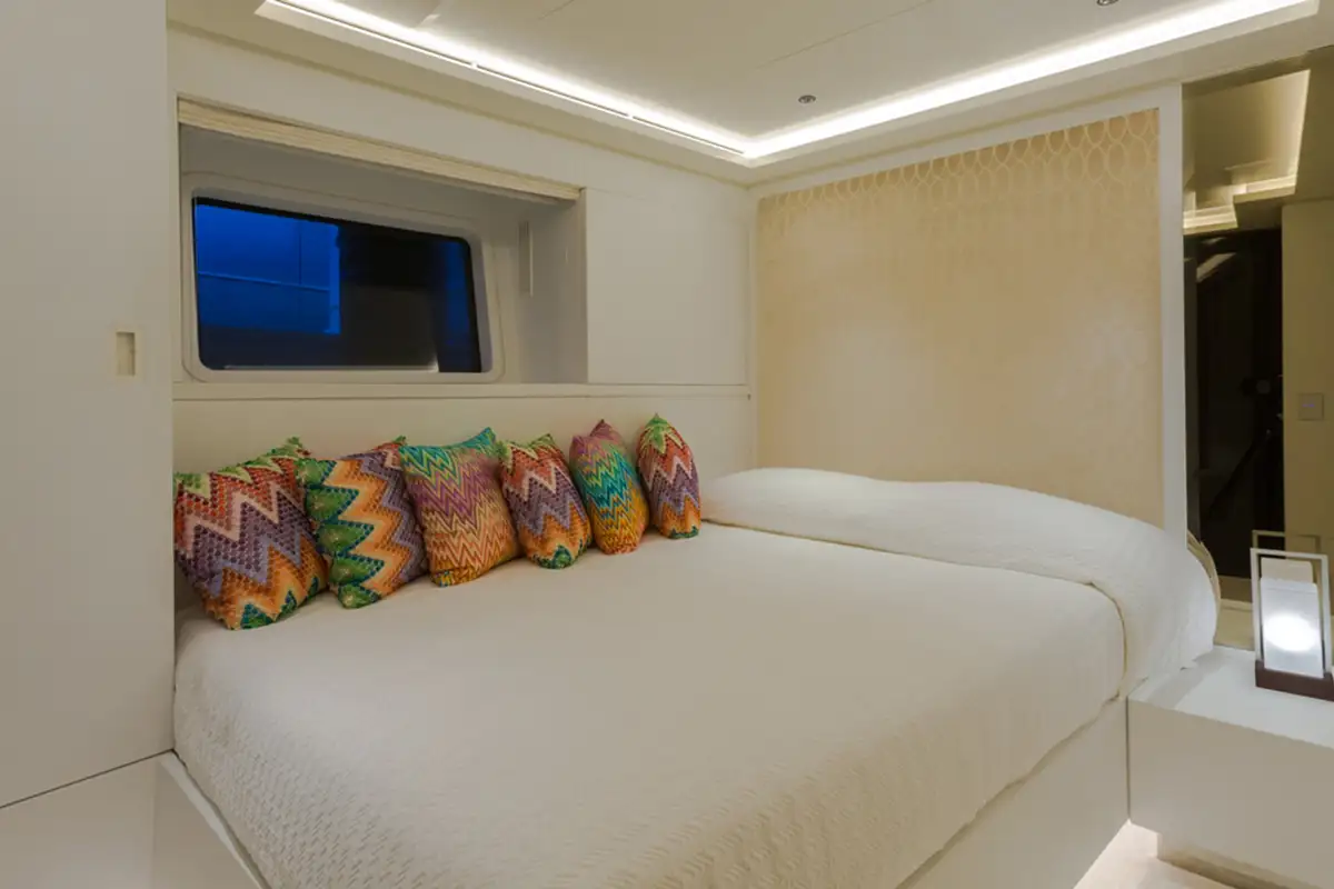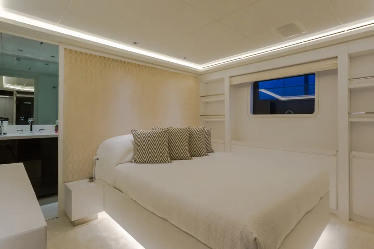 GALA accommodates up to ten guests in four beautifully appointed cabins. The full-beam master suite is located on the main deck, complete with a king-sized bed, generous wardrobe space, and a spacious en suite. On the lower deck, two VIP doubles and a twin with additional pullmans provide flexible sleeping arrangements, each finished to the highest standard and equipped with private en suites.