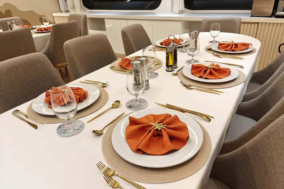 At the night’s end, your party can retire to the nine guest suites. Each fabulous suite can be arranged as a double or twin berth suite for maximum flexibility. Accommodation spreads over two decks, and all of the suites have en suite facilities and balconies to take in the majestic scenery of this protected wildlife reserve. Four suites on the upper deck are accessed via a spiral staircase leading up from the main saloon. Five more suites are found on the main deck.