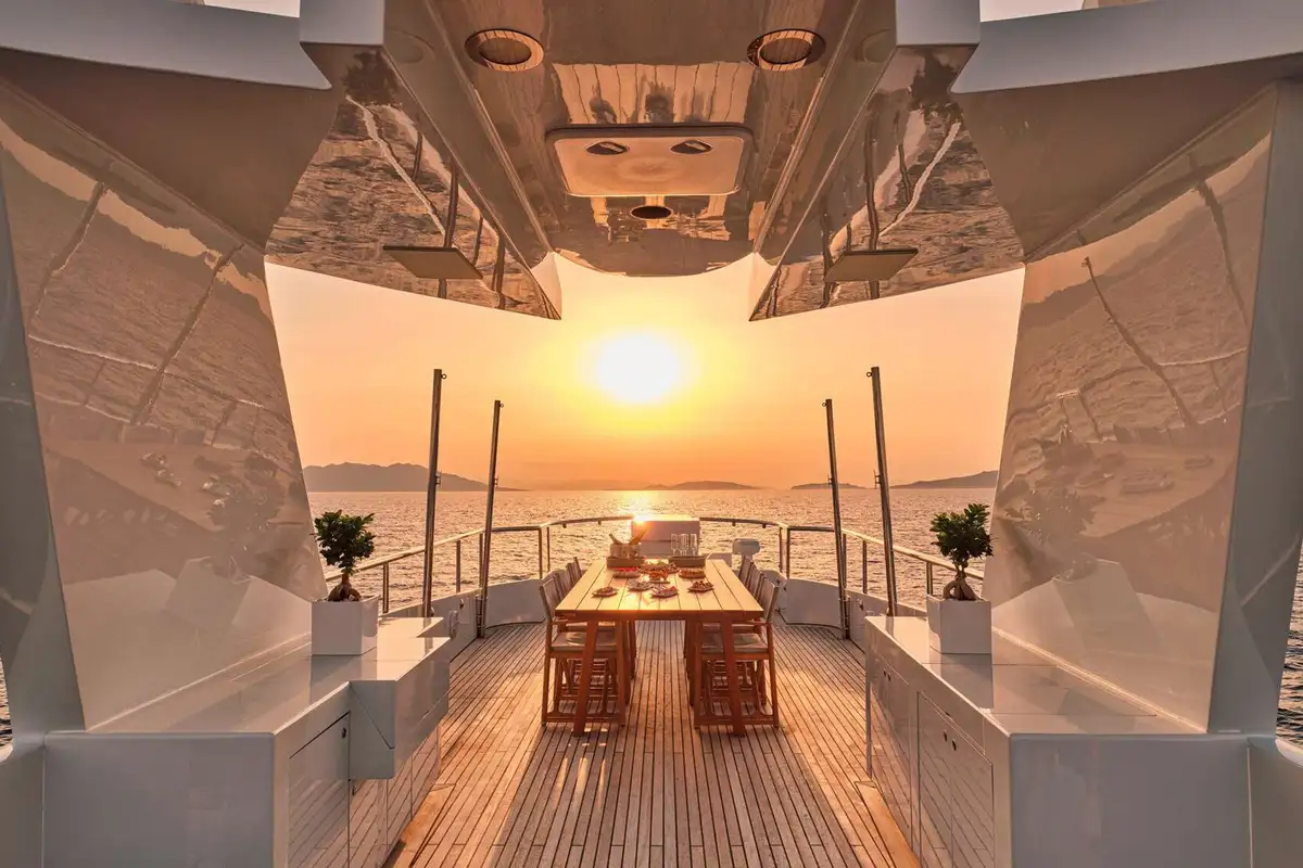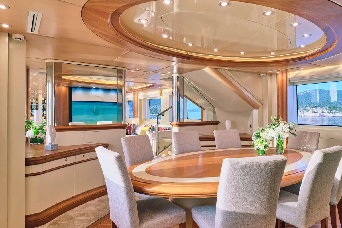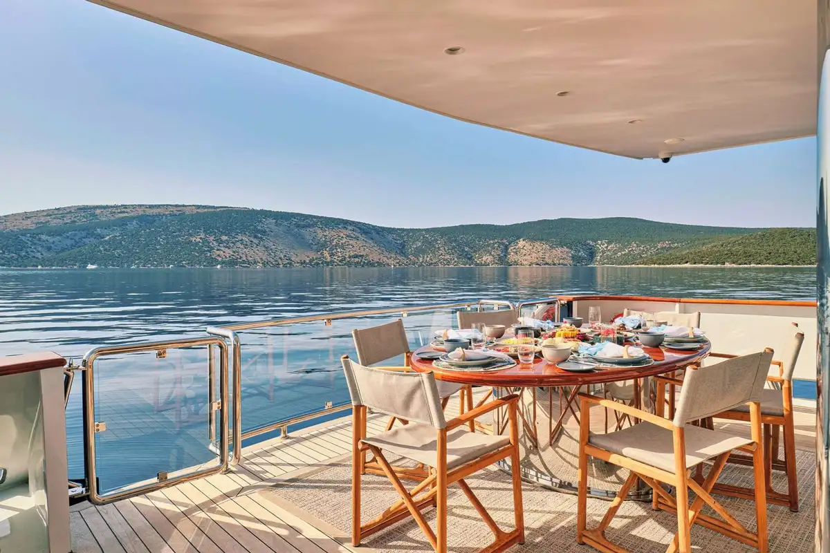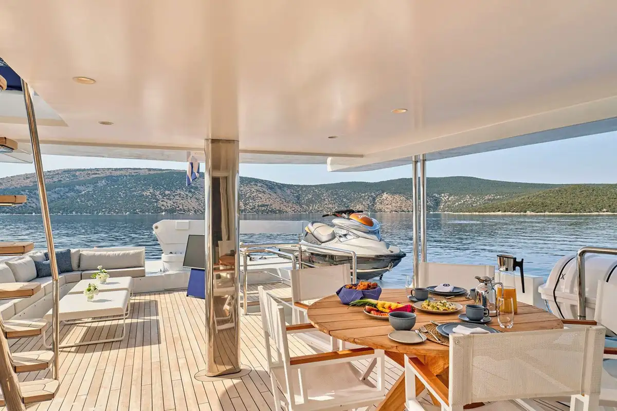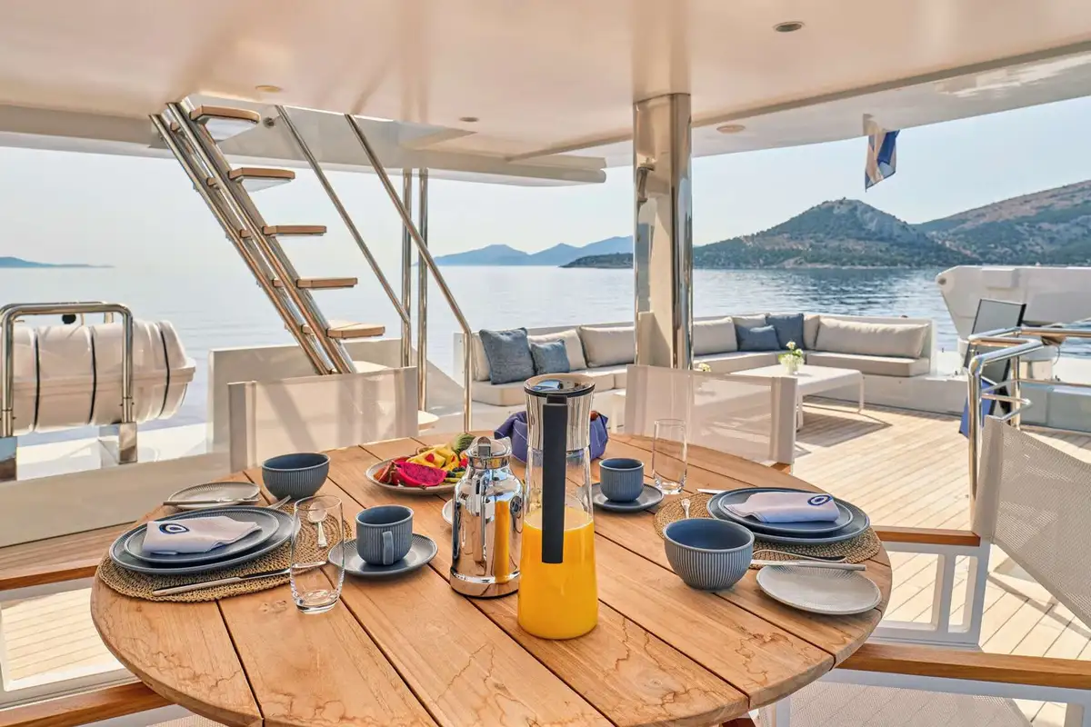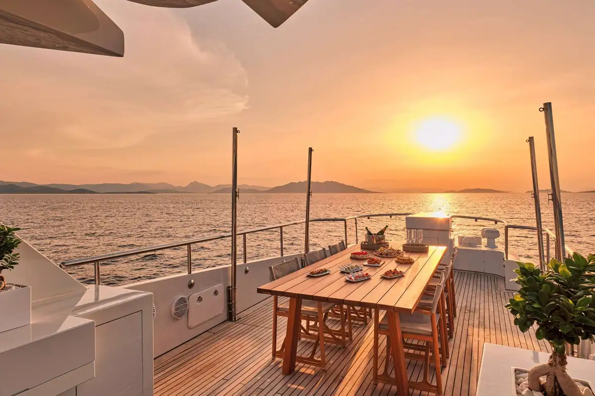 You’re spoilt for choice regarding luxurious spaces to dine on GELLY. Not only is there the delightful formal dining in the main saloon, but there is also an al fresco dining area in the cockpit (also on the main deck). For a more informal or private dining experience, you can enjoy the upper deck dining area close to the master suite lounge. Alternatively, your captain could find you a secluded beach for a waterside beach banquette. But, for the ultimate outdoor dining experience, opt for the sundeck al fresco dining area. With only guardrails between you and a stunning vista, sensational cuisine and your friends and family nearby, dining experiences don’t get any better.