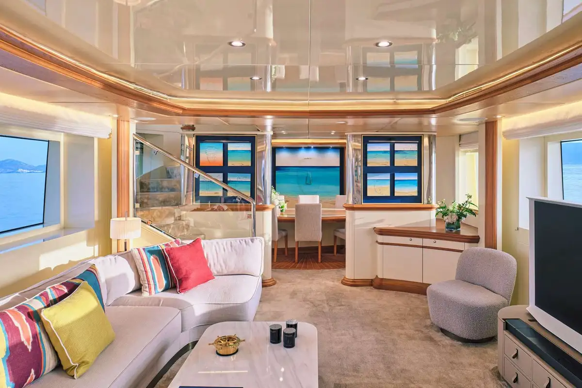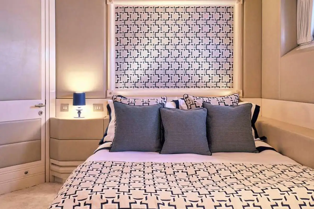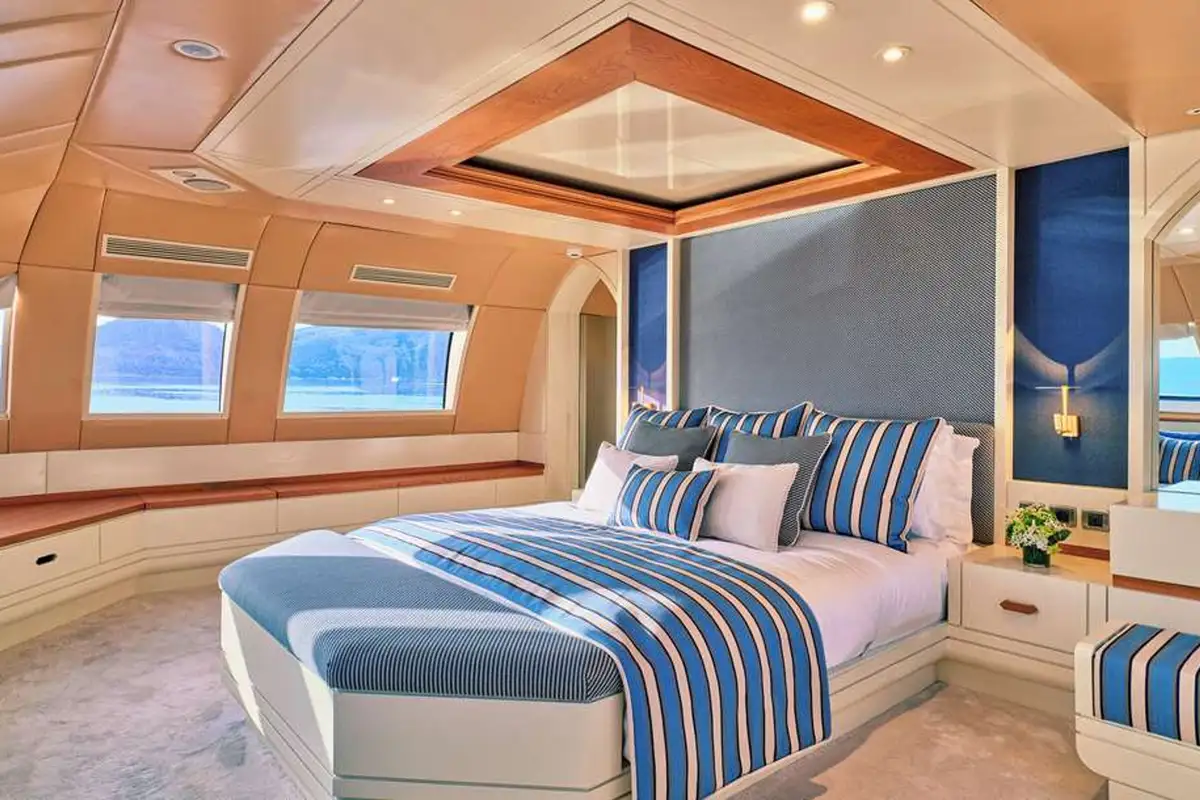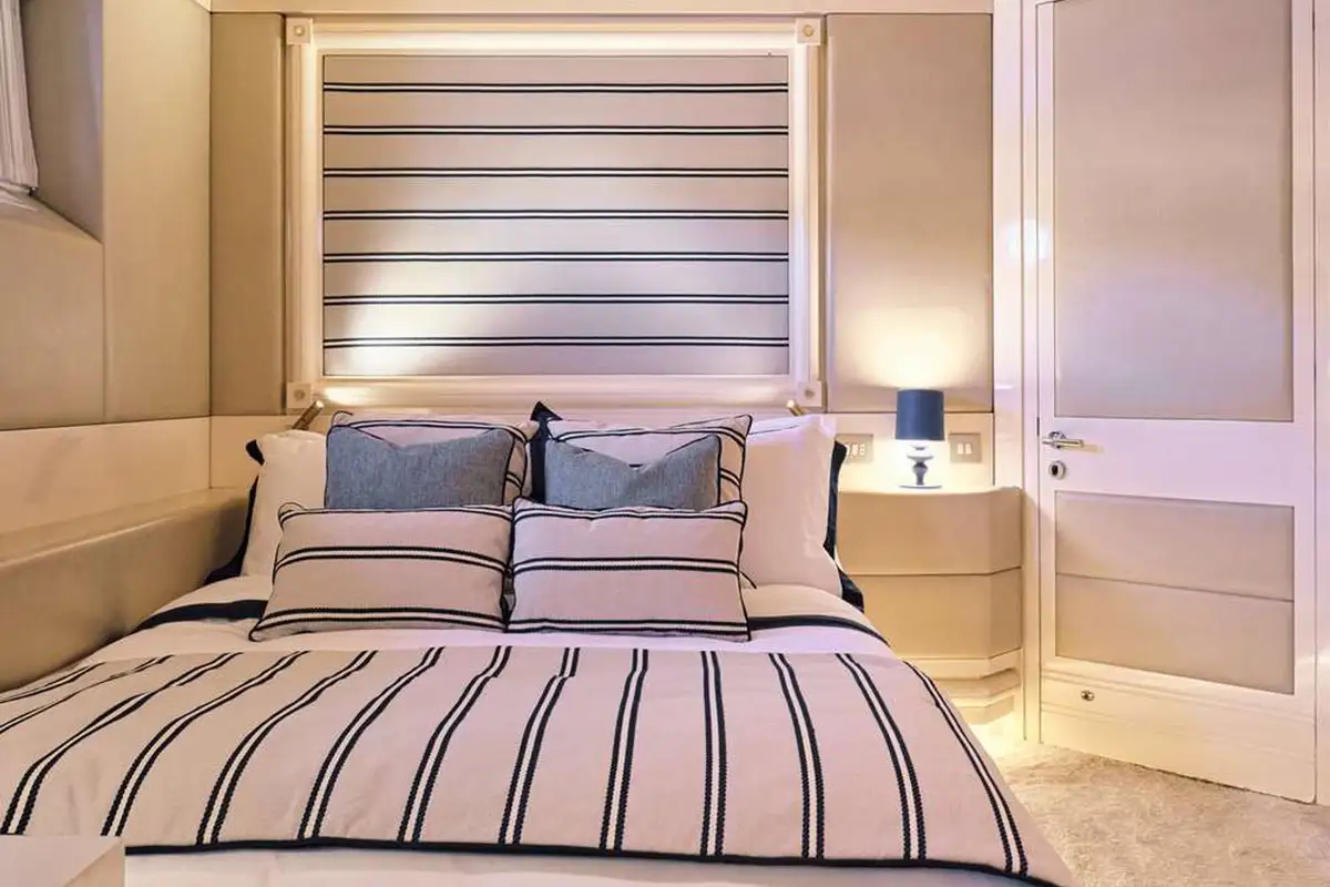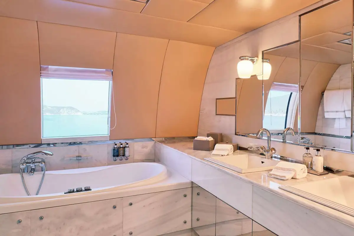 Steps ahead of the lounge lead to GELLY’s upper deck. Here, you’ll discover the stunning master suite. The stairs enter your private lounge and office area. From this light space, with elevated views, a mirrored corridor takes you past the entrance to the marble-lined en suite bathroom – with bath and separate shower compartment, forward to the delightful master suite. With picture windows on three sides, you can wake to breathtaking views and enjoy them from your forward-facing king-sized berth.