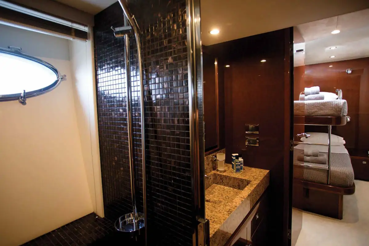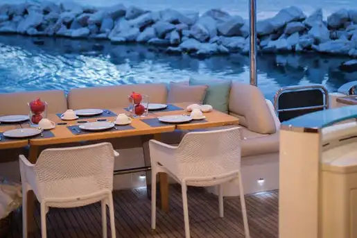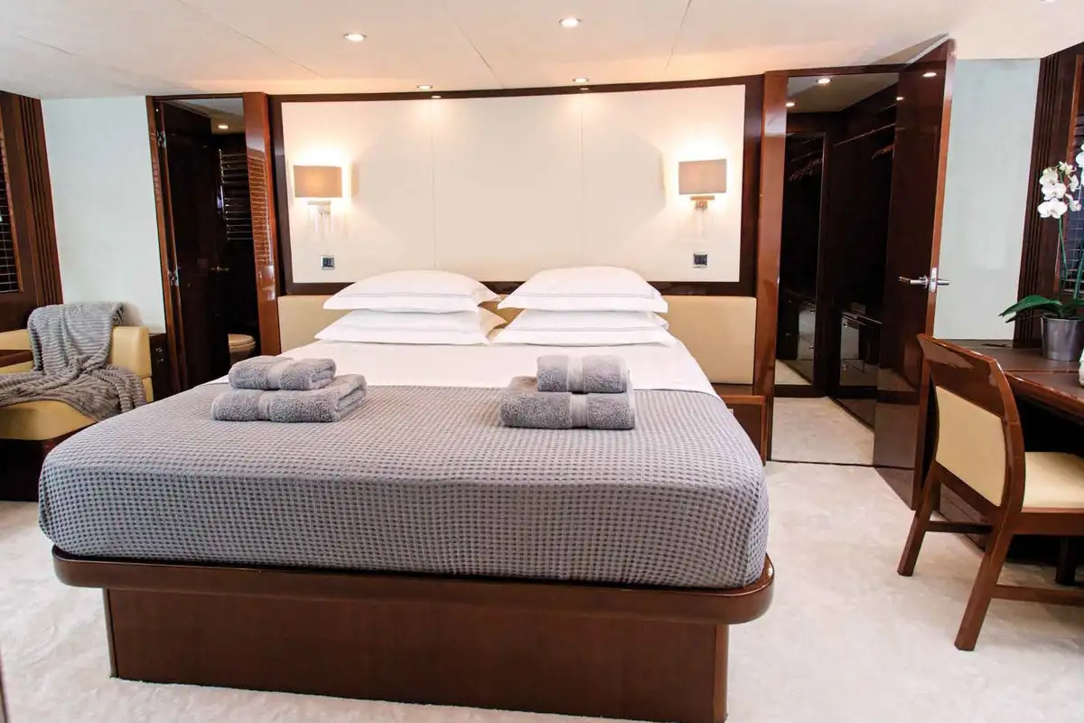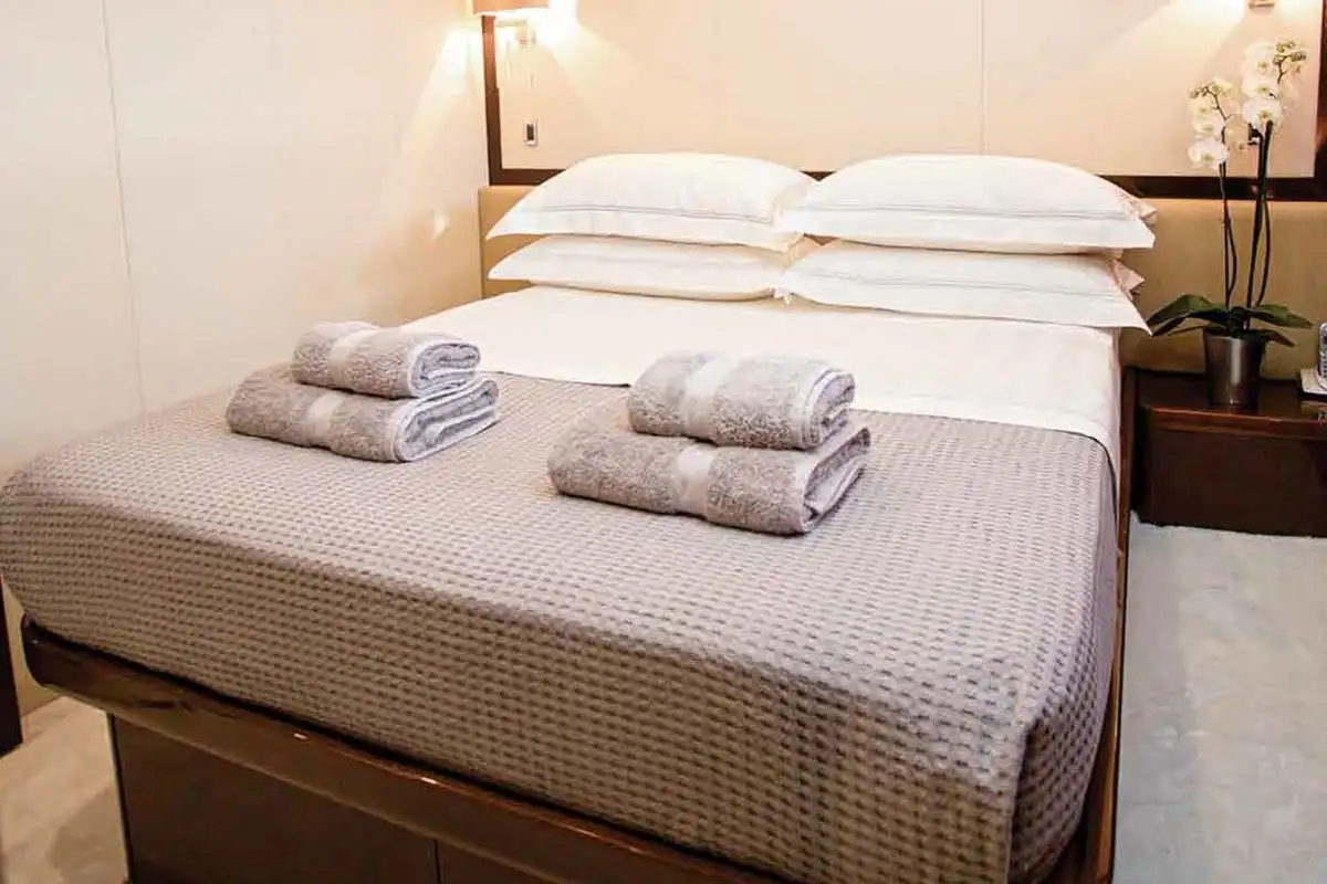 An extensive single-level main deck provides ample entertainment space with a flexible kitchen layout. Three separate seating areas ensure the utmost privacy for visitors, while sailing with the crew. Underneath the deck, up to eight guests are accommodated in four en-suite cabins, three twin cabins and one pullman. The full beam master suite is the epitome of elegance and includes a large double-sized bed and walk-in wardrobe. The VIP cabin also has a walk-in closet and a king-size bed. Furthermore, one double and one twin cabin (converted into a double) complete her spacious accommodation.