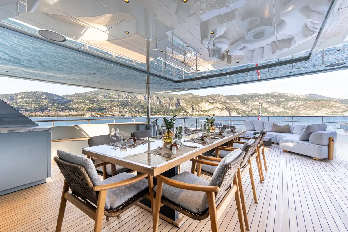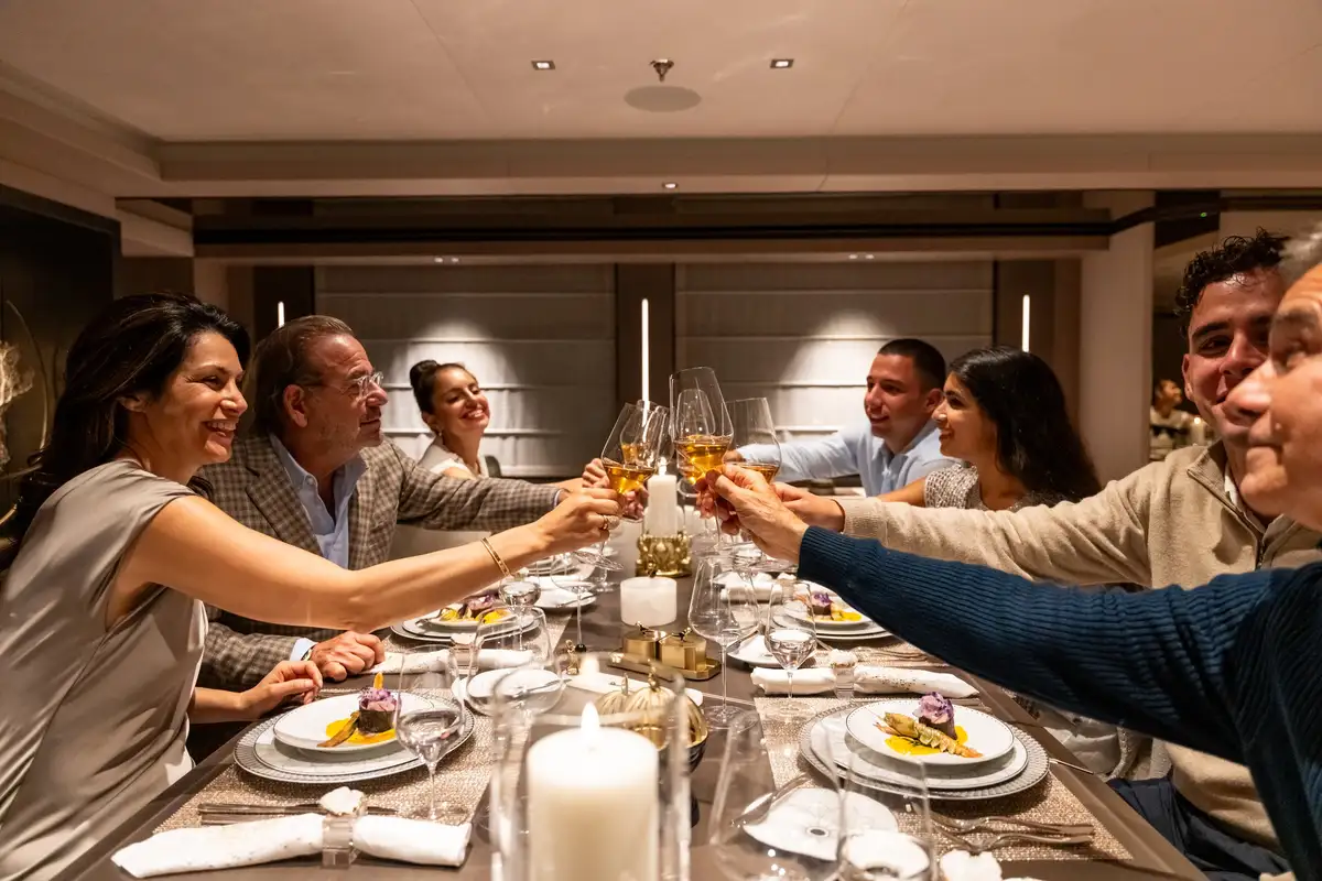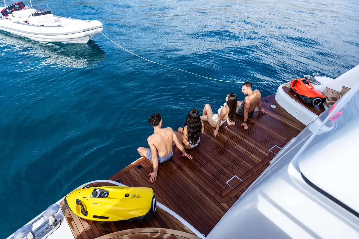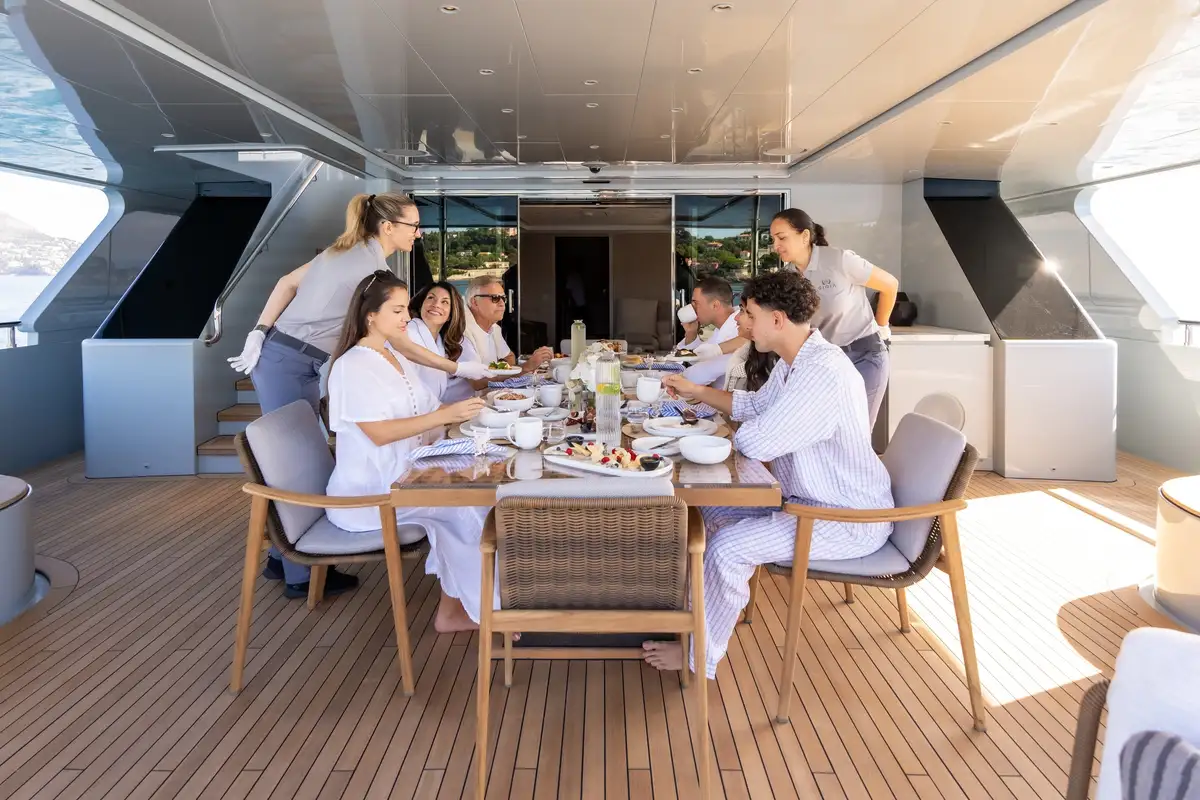 Across three decks, GIOIA is made for both togetherness and tranquility. On the sun deck, soak in the raised jacuzzi as the horizon stretches ahead, then dry off on the surrounding sun pads with a cocktail in hand. A few steps down there’s a shaded lounge for lazy afternoons, while the sit-up bar plays host to some creative mixology. By evening, the upper aft deck transforms into a stage for long dinners under the stars, followed by relaxed conversations in deep, inviting sofas.