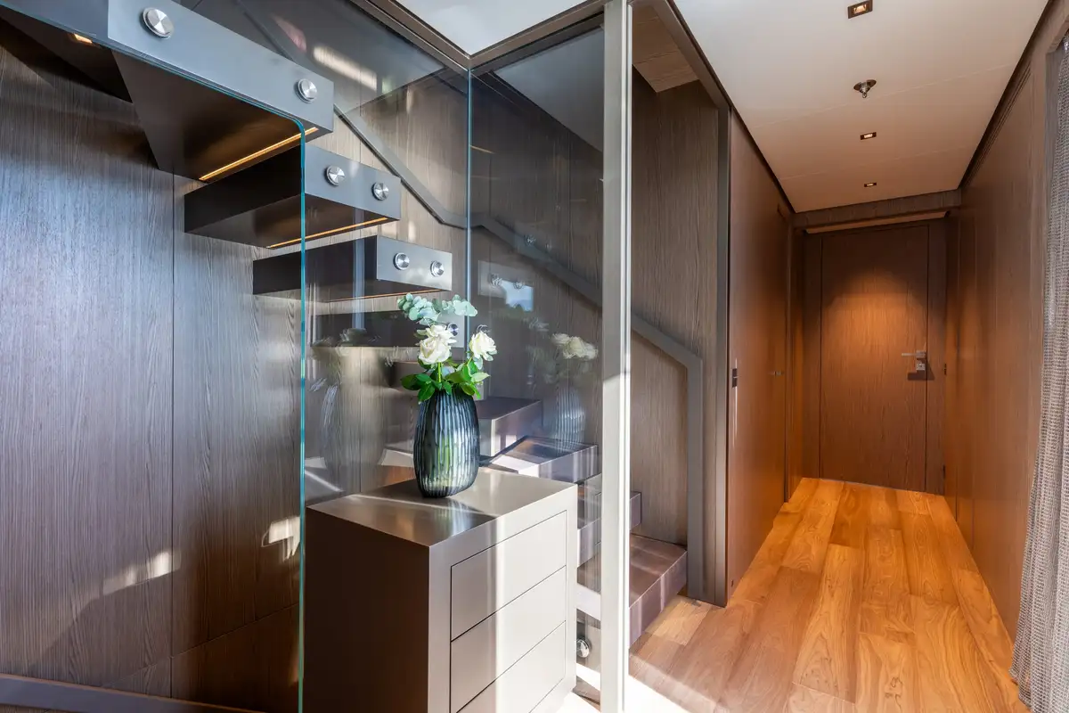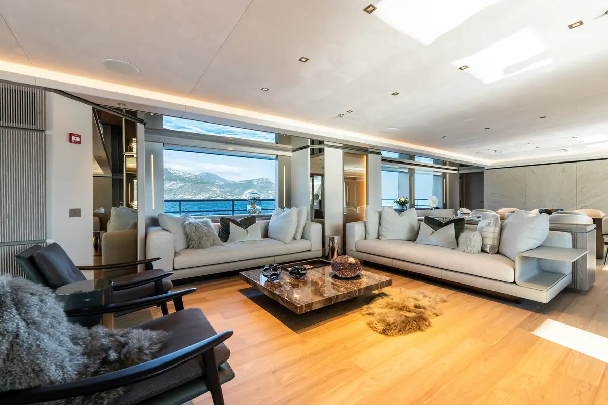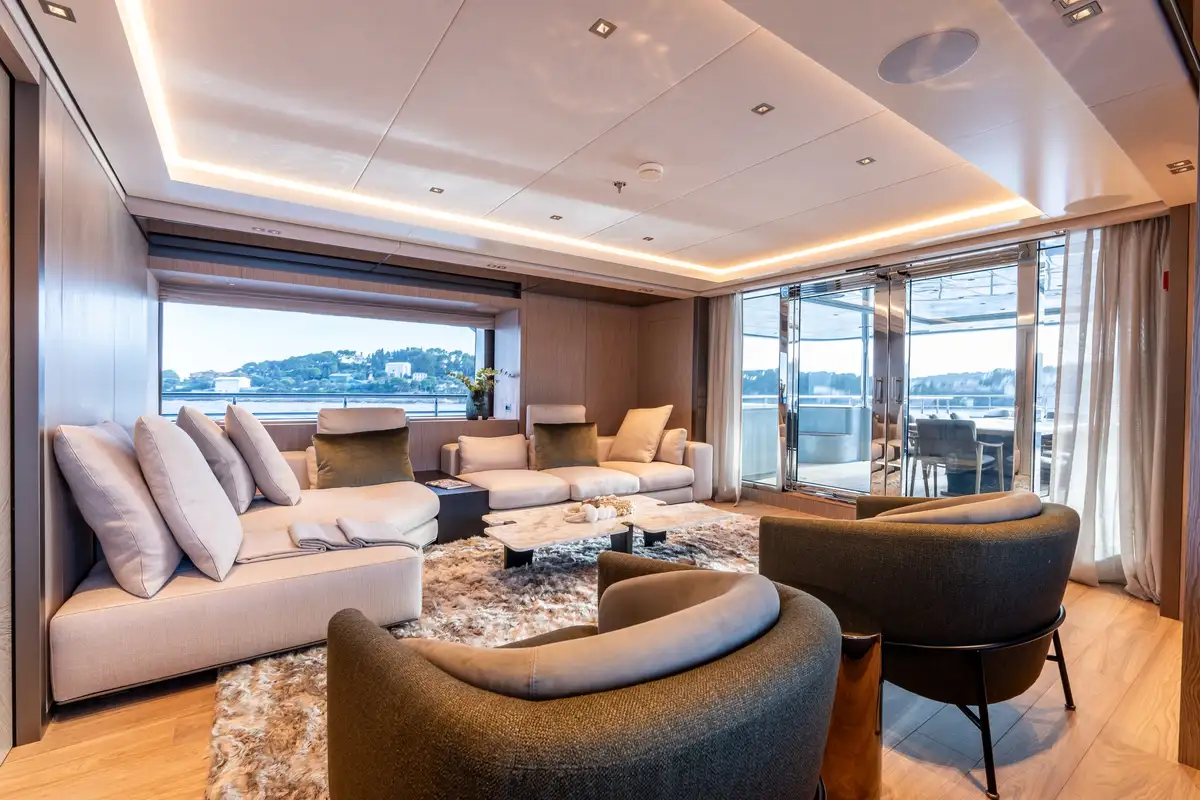 Inside, GIOIA’s interiors are warm and inviting. Light-filled and welcoming, they pair polished marbles and rich woods with a soft, contemporary touch. The main deck lounge invites sociable moments with its bar and seating areas, while the sky lounge one deck up is a snug but spacious living room with panoramic views and an easy flow out onto the upper aft deck.