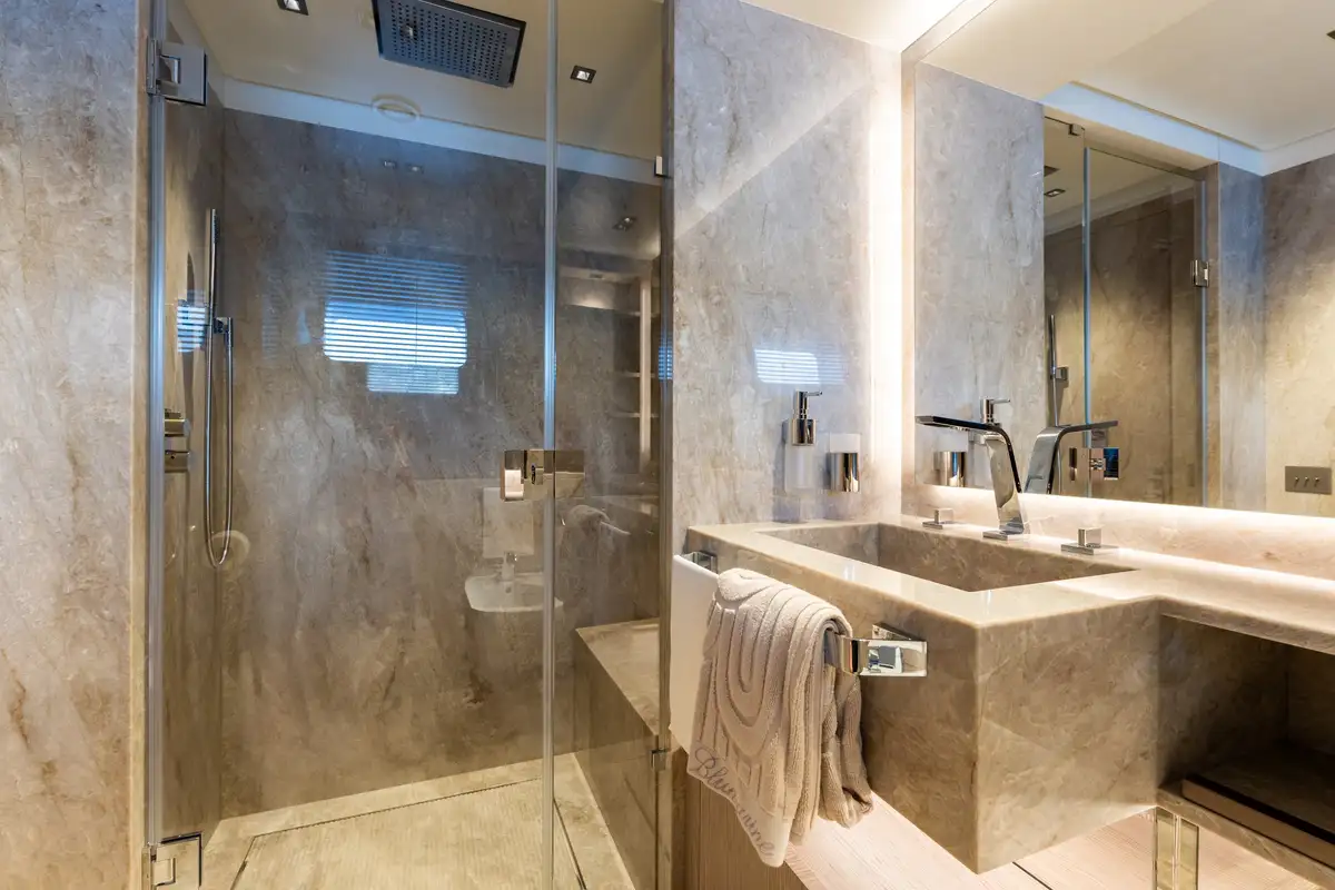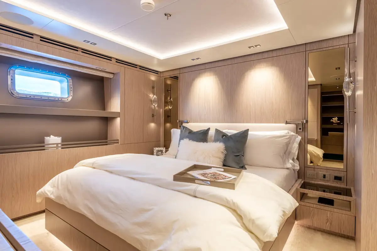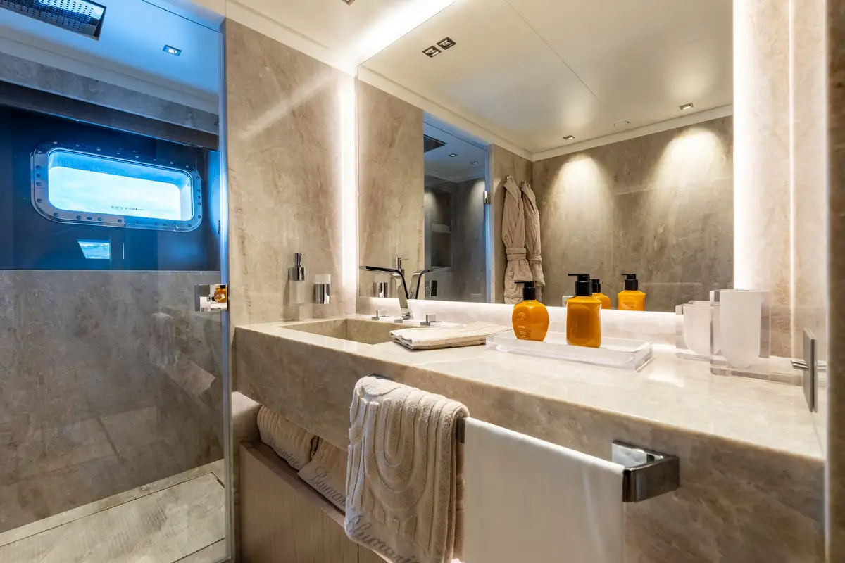 Accommodation for up to 12 guests is beautifully designed. The main deck master suite commands sweeping views from a central king bed, with its own lounge, dressing room, and a marble bathroom that feels like a spa retreat. Below, two double and two twin cabins with pullmans – each with en suite – ensure every guest feels equally indulged.
