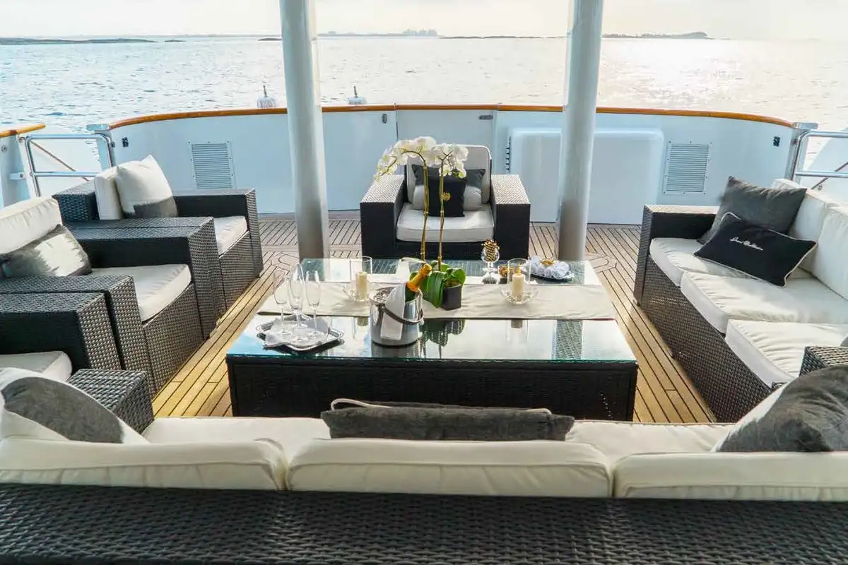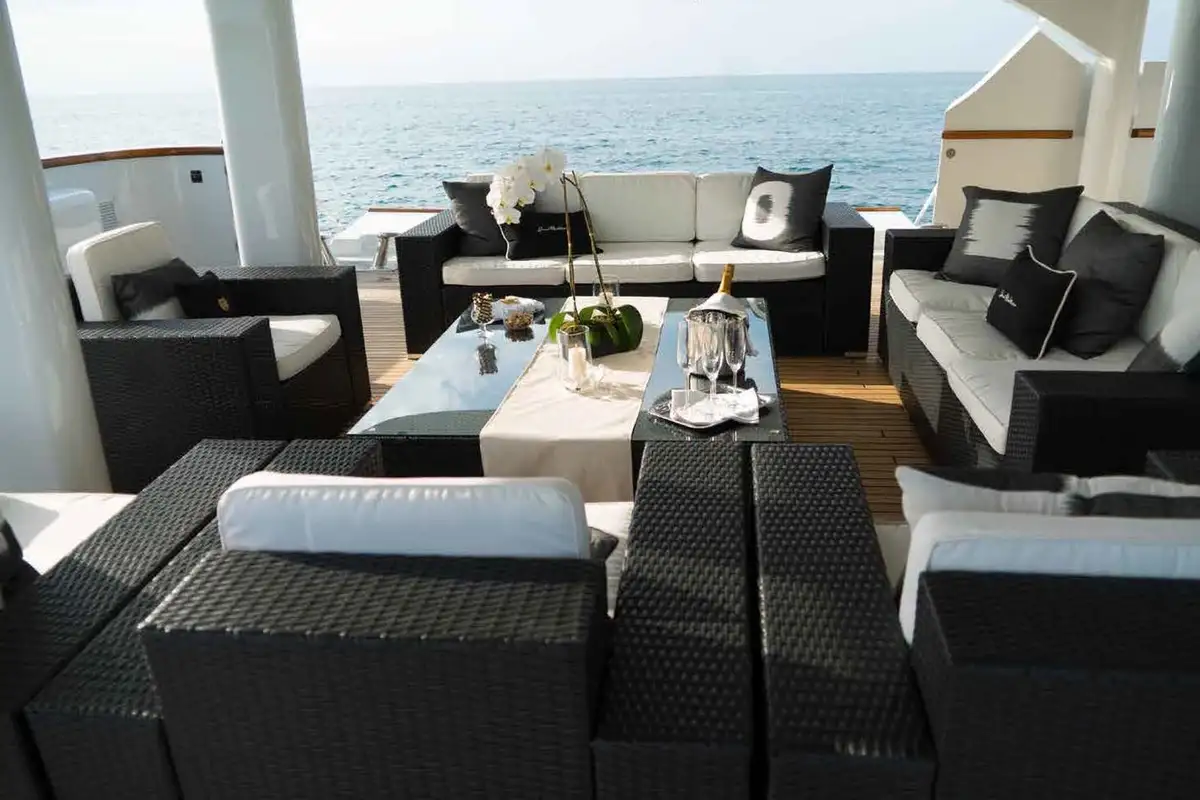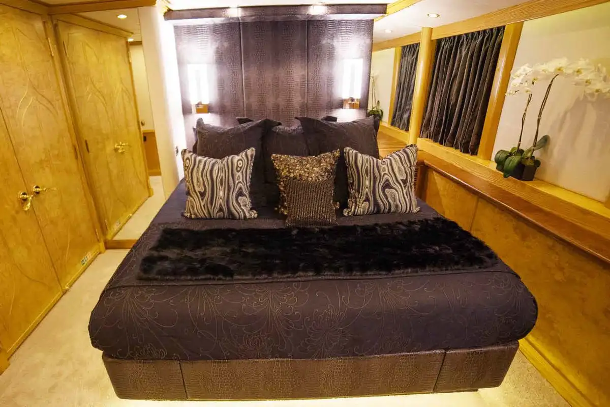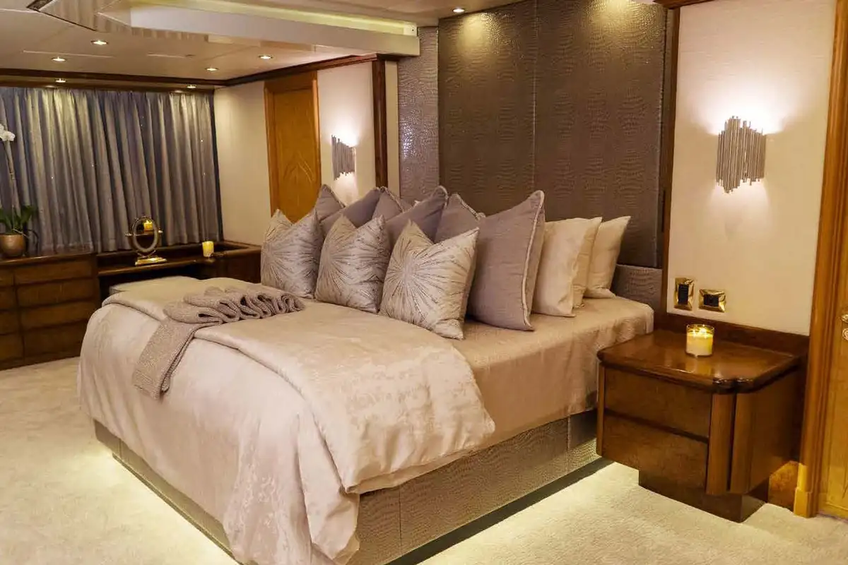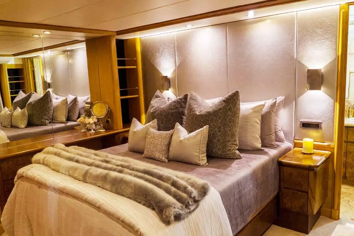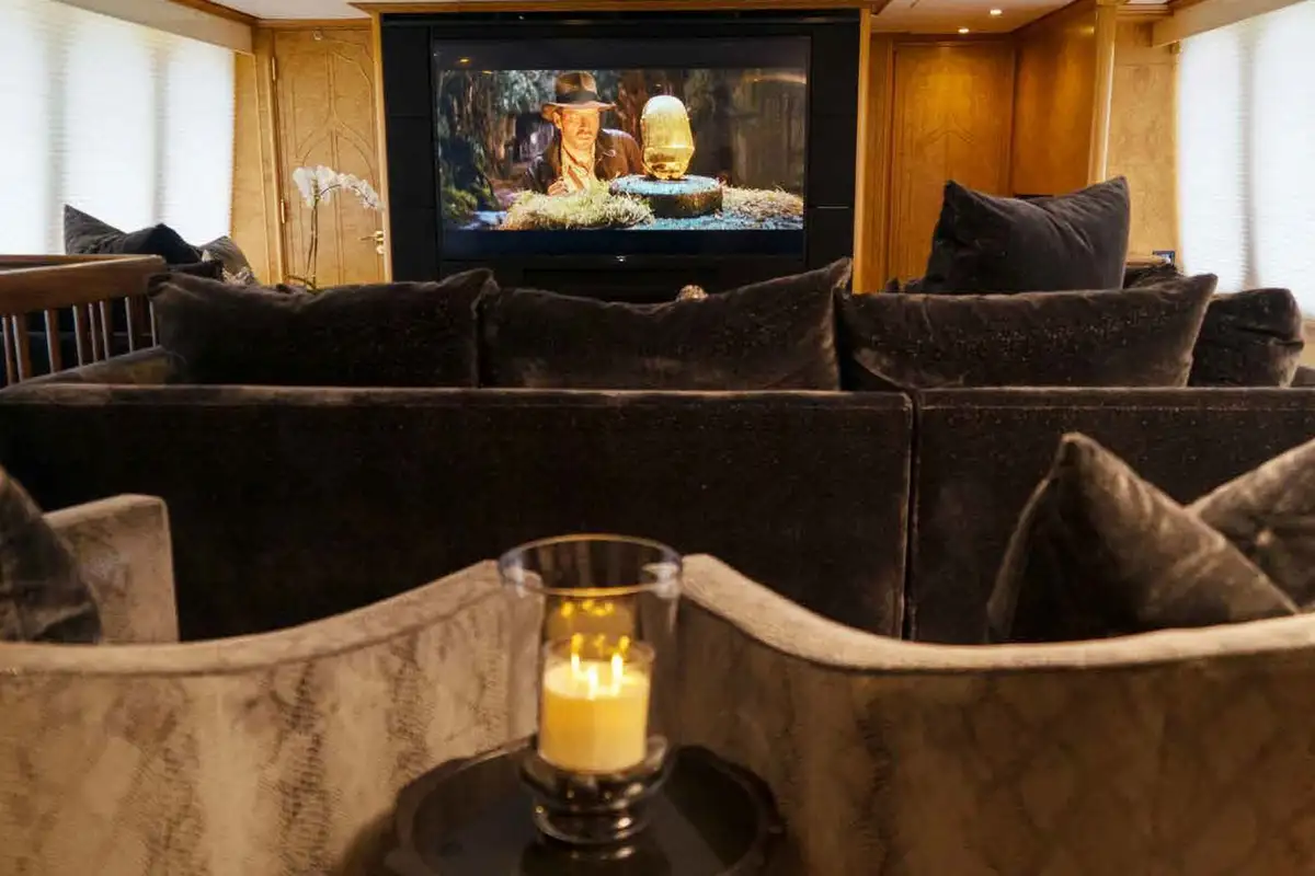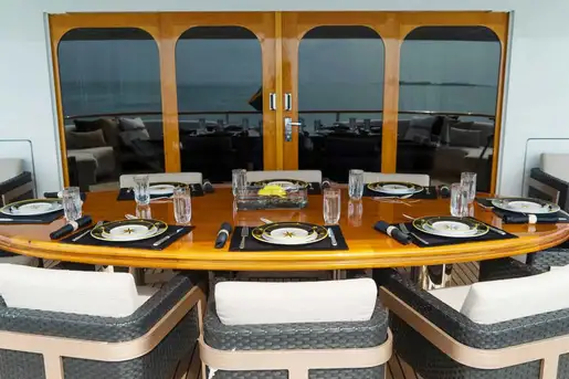 Lunch is taken on the upper deck aft, shaded from the midday sun. Freshly caught and grilled fish, colourful salads, charcuterie and cheese, whatever you want, that’s what you’ll get. As the yacht cruises smoothly to the next amazing anchorage, you and your guests can chill together in the 10-person sundeck jacuzzi watching sports on the pop-up TV, kick back in the semi-circular sun lounge or top up your tan on the sun loungers aft with refreshment from the wet bar. Maybe you’d prefer a movie in the sky lounge’s convertible cinema?