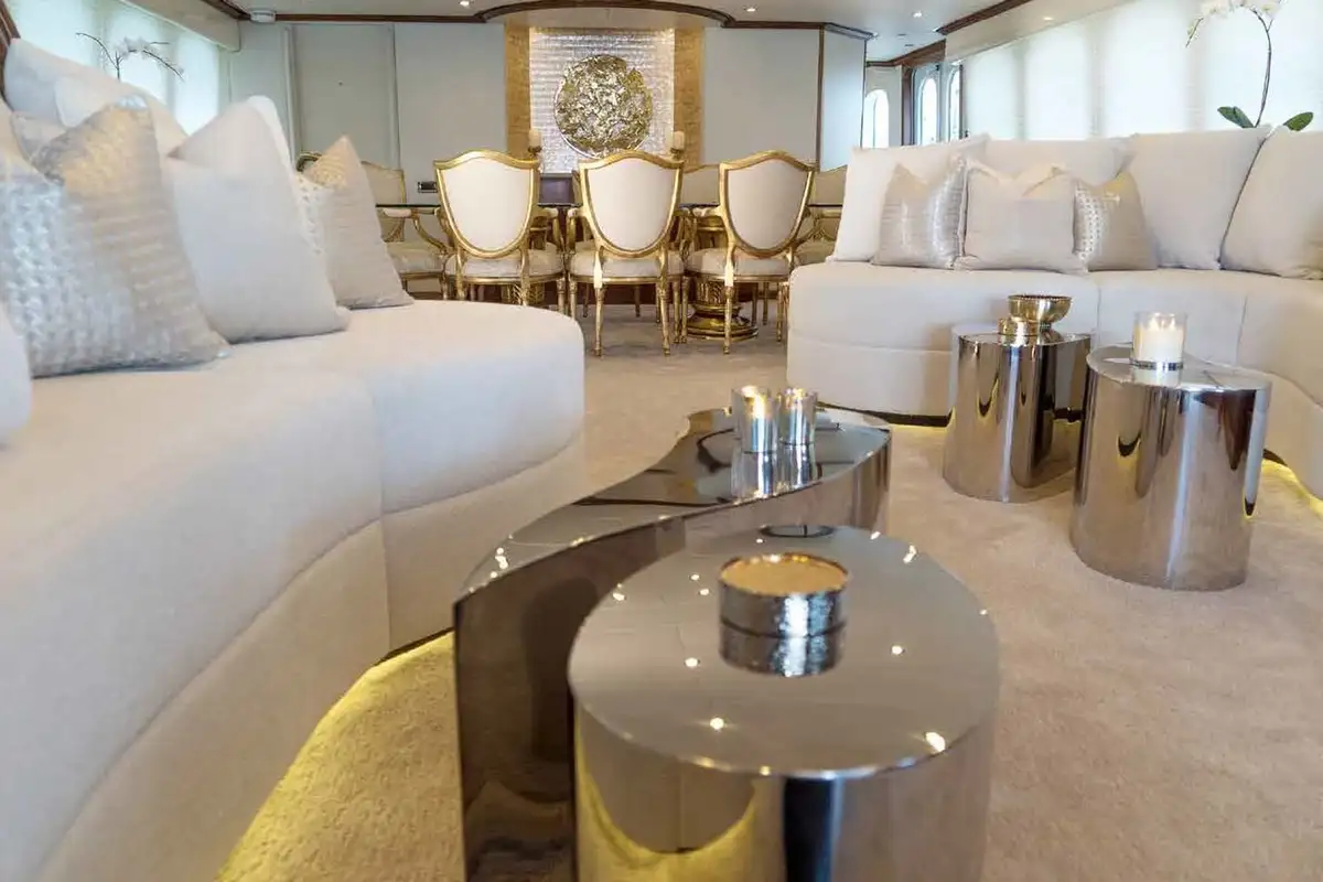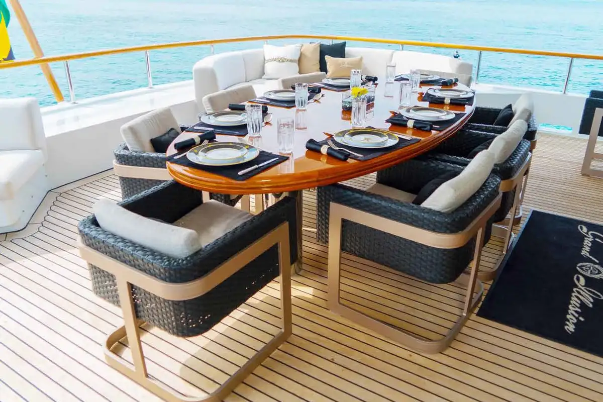 Now it’s toy-time, so you and your guests head down to the outsize swim platform ‘beach’ where the yacht’s three waverunners are moored in the inflatable dock and ready to delight. SeaBobs, kayaks, snorkel gear, and inflatable towables for the 5.5m (18ft) tender, GRAND ILLUSION delivers thrills and spills in abundance. Watch the fun from sea level on a sun lounger on the swim platform or relax in the main deck aft lounge.