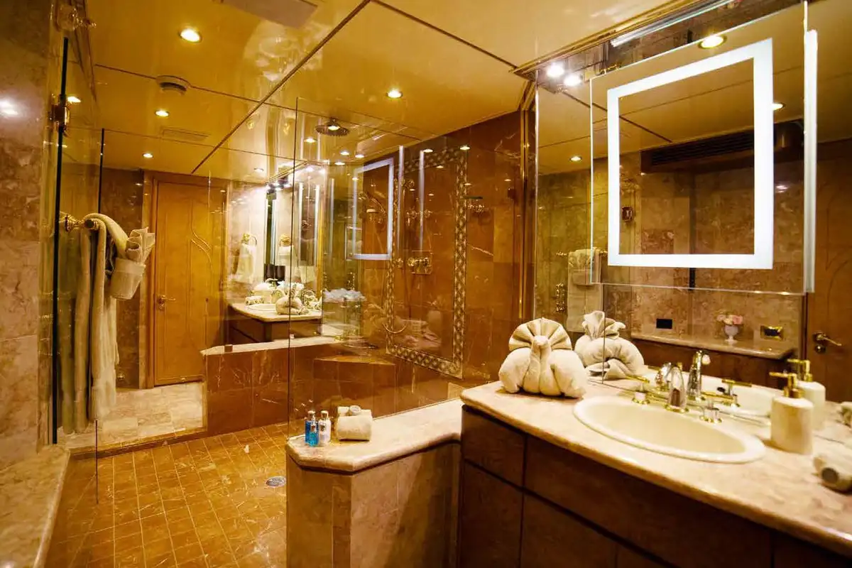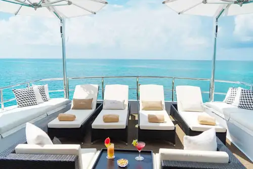 Another gleaming day begins in your main deck master suite. Draw back the drapes and let tropical sunshine fill the room. After freshening up in his-and-hers en suites, sharing a marble shower room, and picking out your morning outfit from the walk-in wardrobe, it’s time for breakfast on the sundeck. Fresh fruit, waffles, eggs how you like them, fresh smoothies from the wet bar – however you love to start your day, the chef and crew will be delighted to oblige.