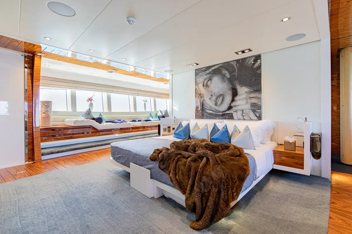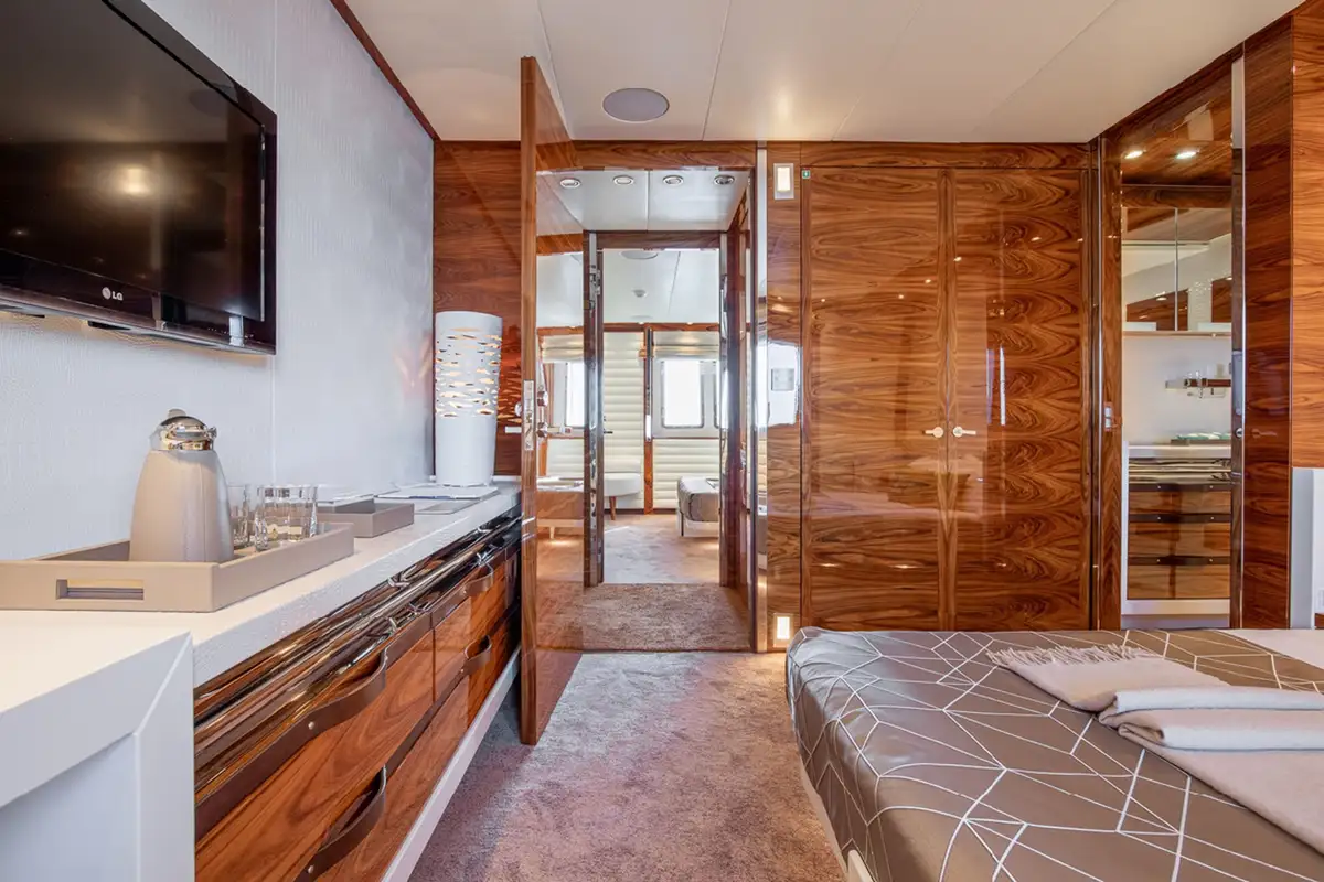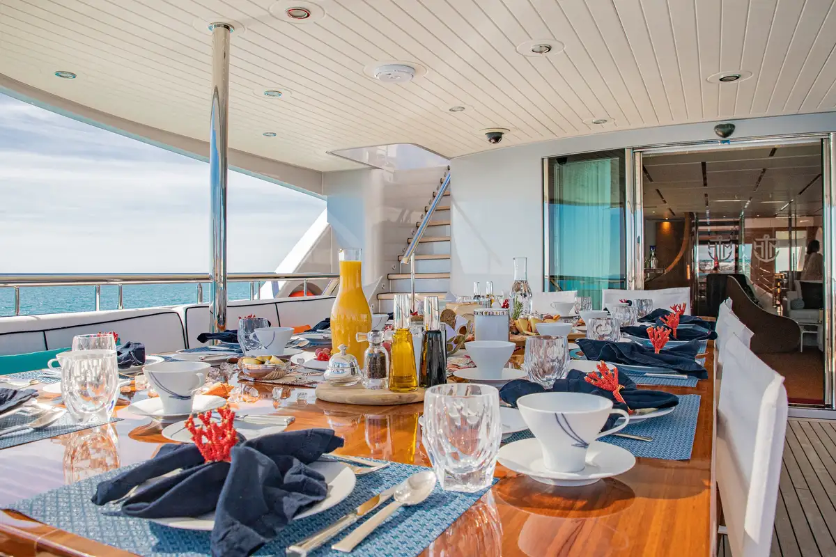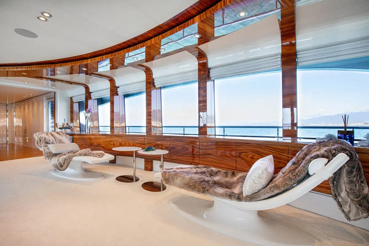 With interior by Art Line, every space is flooded with natural light, creating an ambiance, that is both sophisticated and inviting. Accommodating 12 guests in six en-suite cabins, HATT MILL offers a magnificent full-beam master suite with a private office and gym, alongside three spacious doubles and two twins. The three decks are thoughtfully arranged to provide the perfect balance of sociable and intimate spaces, with elegant furnishings that encourage both relaxation and entertainment. The upper deck lounge is designed for convivial moments, while the expansive sun deck features a jacuzzi, sunbeds, a bar, and an al fresco dining area, all set against a backdrop of breathtaking ocean views.