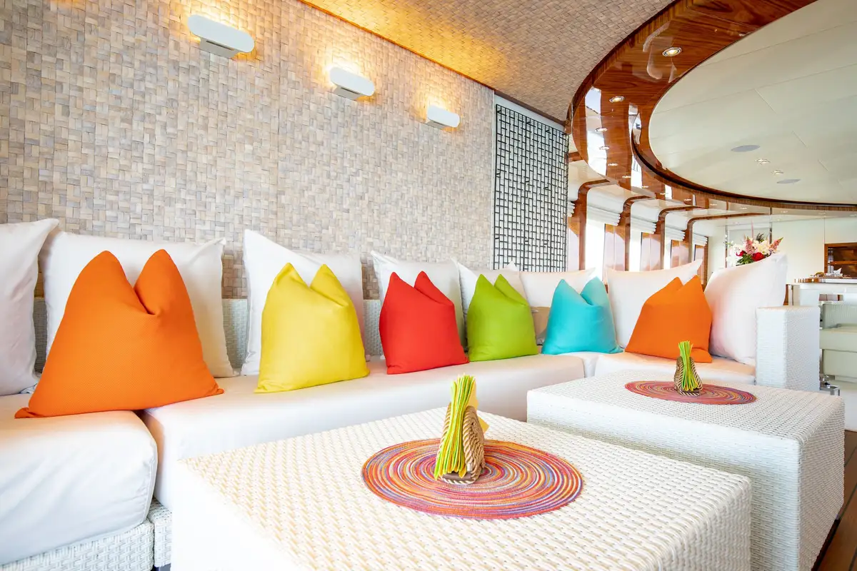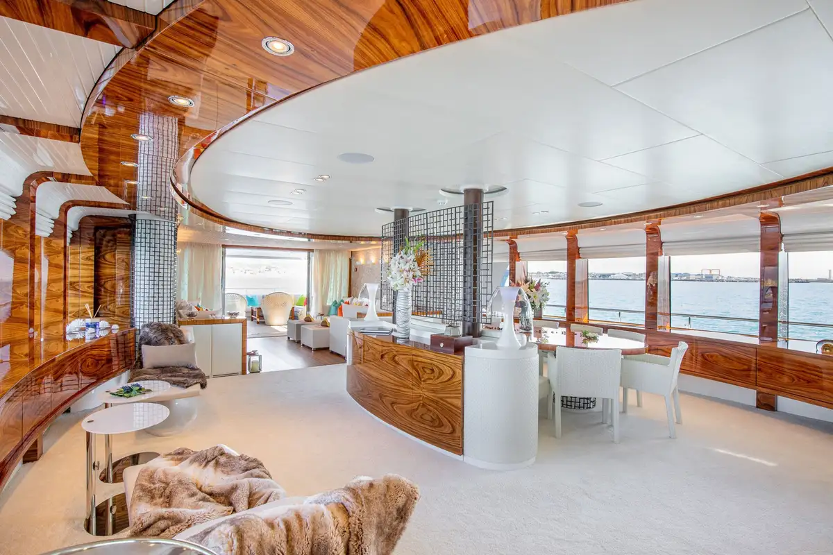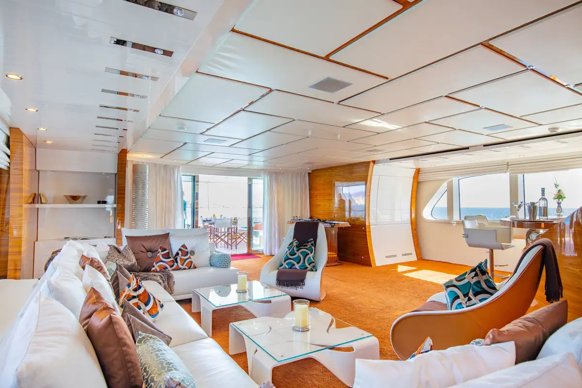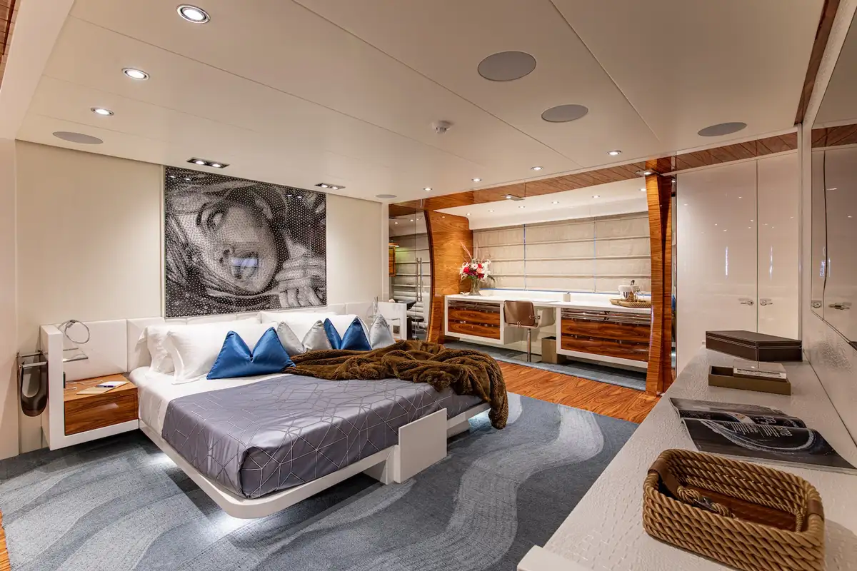 With interior by Art Line, every space is flooded with natural light, creating an ambiance, that is both sophisticated and inviting. Accommodating 12 guests in six en-suite cabins, HATT MILL offers a magnificent full-beam master suite with a private office and gym, alongside three spacious doubles and two twins. The three decks are thoughtfully arranged to provide the perfect balance of sociable and intimate spaces, with elegant furnishings that encourage both relaxation and entertainment. The upper deck lounge is designed for convivial moments, while the expansive sun deck features a jacuzzi, sunbeds, a bar, and an al fresco dining area, all set against a backdrop of breathtaking ocean views.