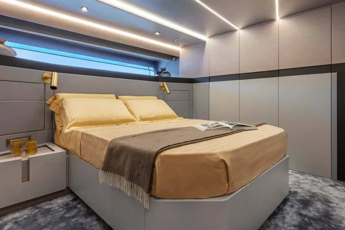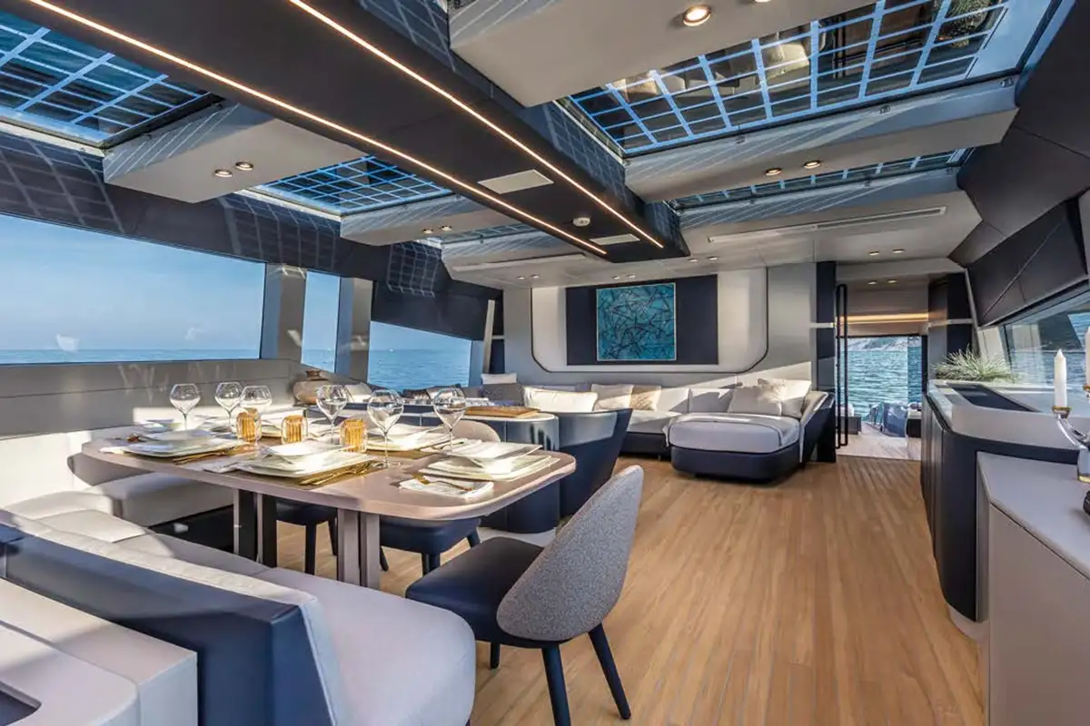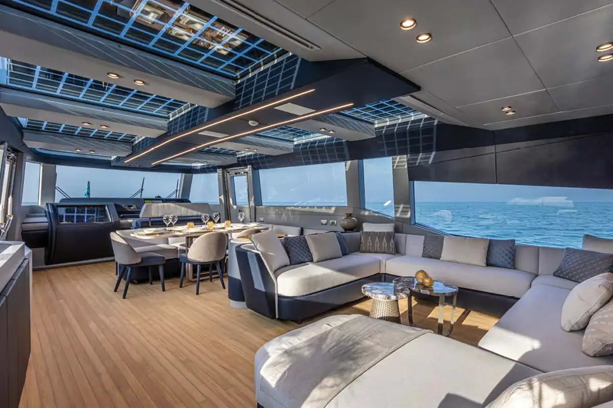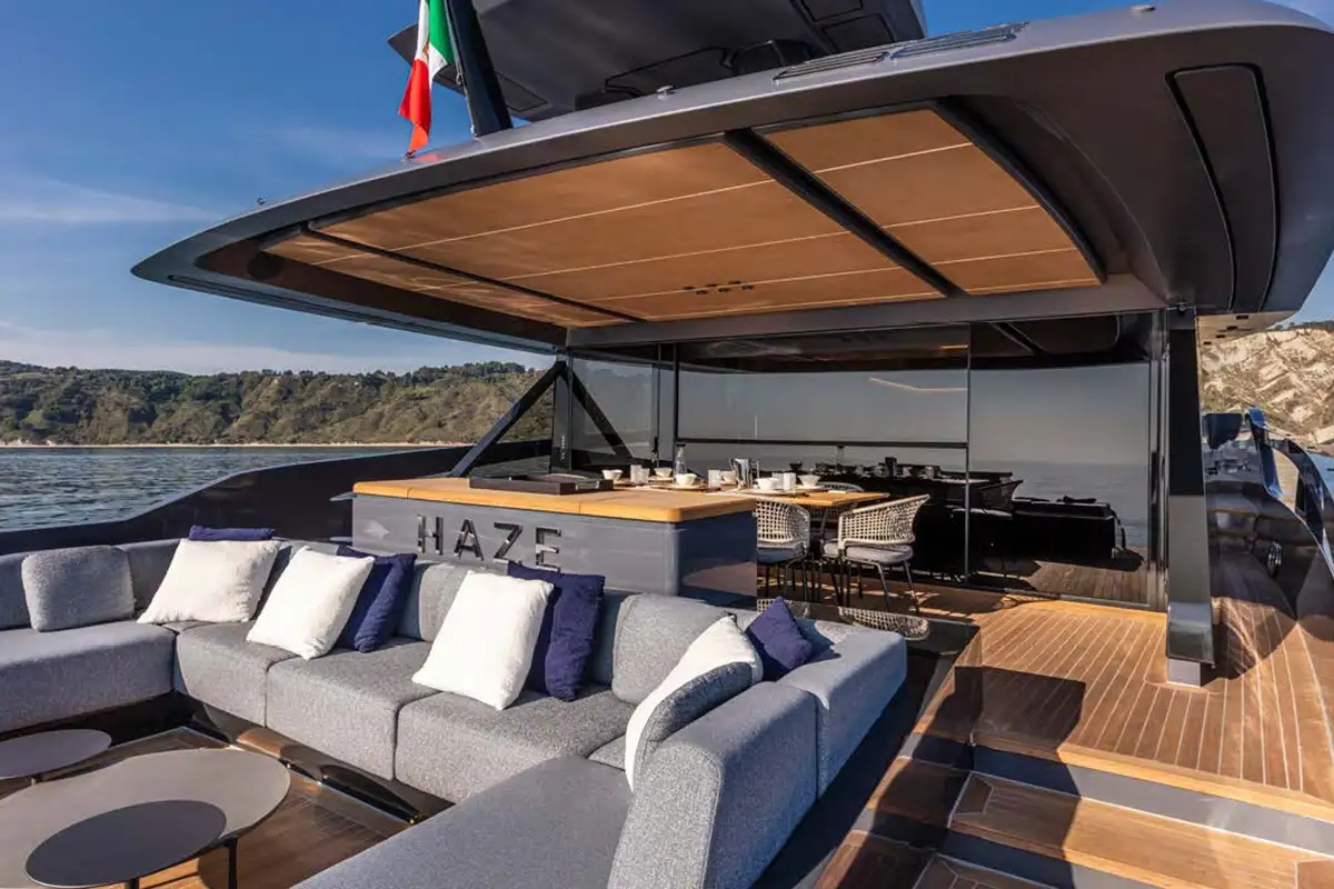 The layout of HAZE has been optimised to guarantee maximum comfort everywhere on board. Her spacious interior with panoramic windows includes a generous full-beam main salon bathed in natural light and equipped with a state-of-the-art entertainment system.
