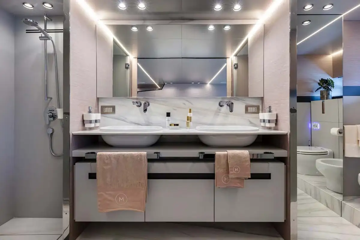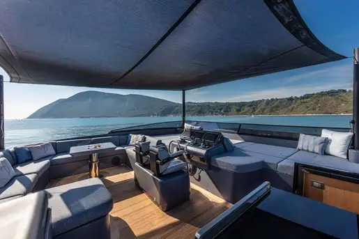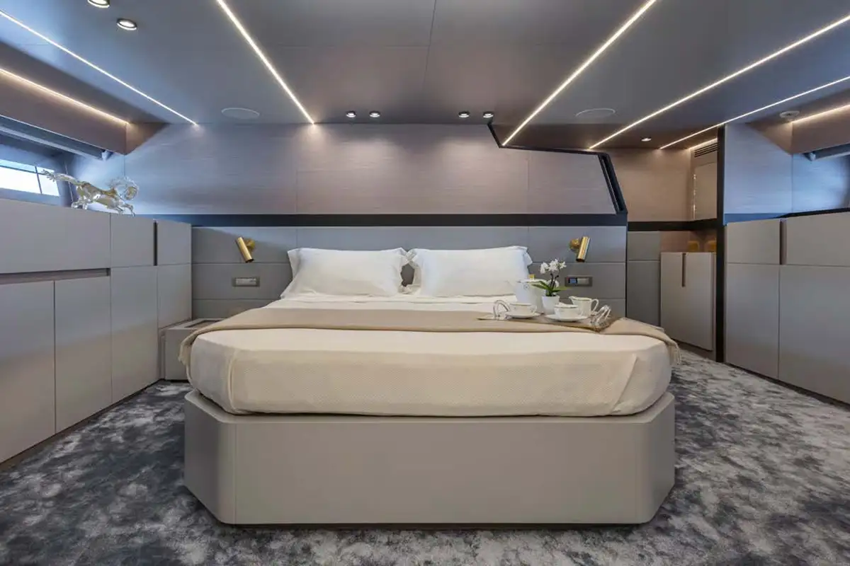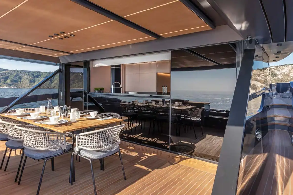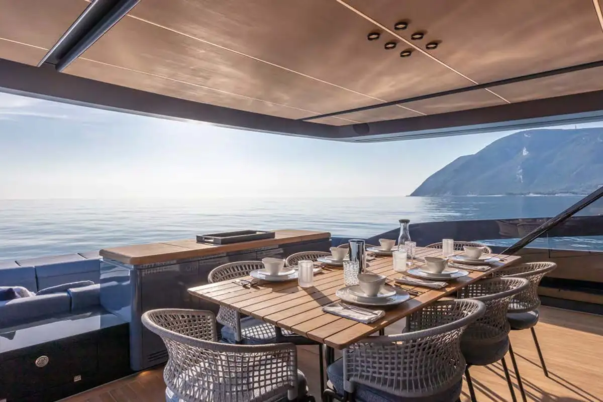 Her vast outdoor deck areas feature a 50sqm beach club including a hydraulic swim platform and spacious areas for sunbeds and alfresco dining.