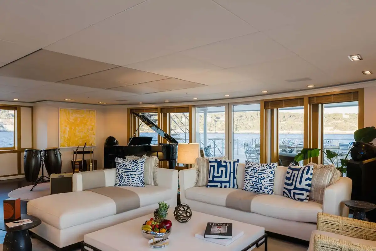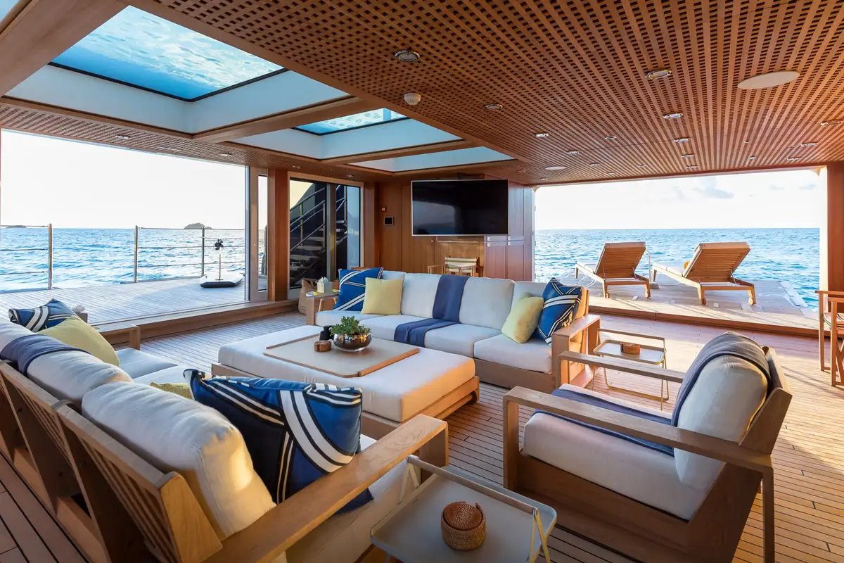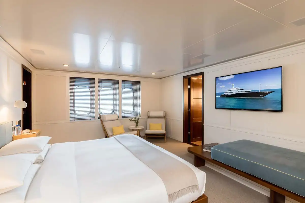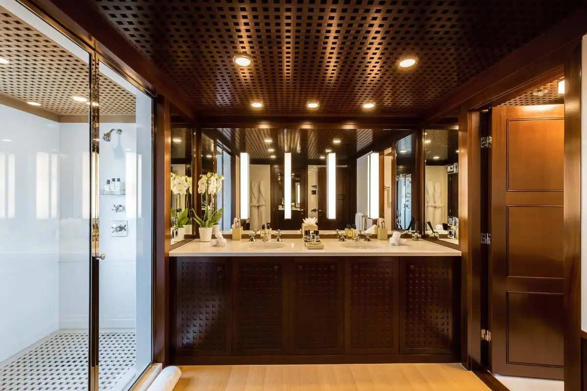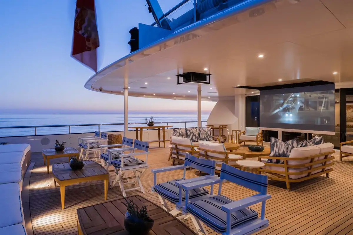 On the main aft deck, there is relaxing seating in the area that converts to an open-air cinema with a drop-down projector screen. The lavish main saloon, too, can be converted into an amazing cinema space. Forward of the lounge, there are more wonderful suites for your guests and the lobby area. Your guests can also take the elevator or the stairs to the lower deck suites.