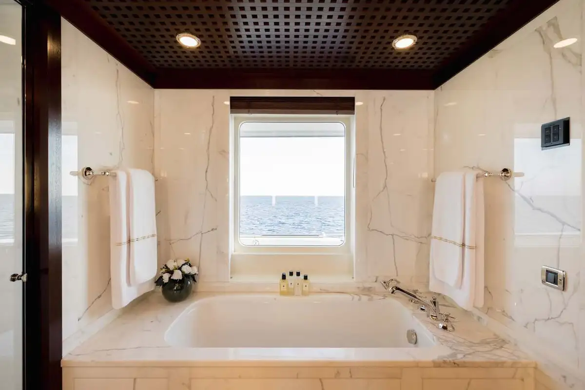 HBC can host 12 guests in 14 luxury suites (12 double berths and two twin-berth suites) giving you a full range of options, no matter how your party is organised. Her sumptuous modern and neutrally decorated suites can be found on four decks. But it’s the upper deck master suite that steals the show; its forward-facing windows create a 180-degree vista to be enjoyed at any time. The suite also has separate en suite marble-lined his and hers bathrooms. For those with children, there is a children’s/nanny cabin on this deck, as well as a further twin-berth suite.
