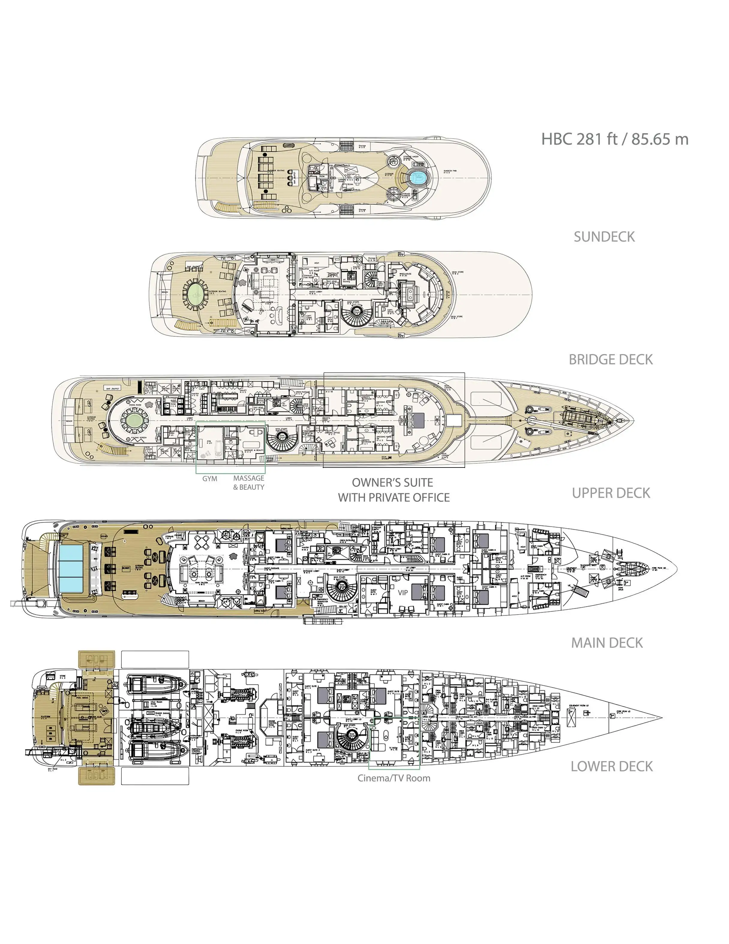 With her unrivalled outside entertaining space, spread over five decks and her 85.6m (280.8ft) length, HBC offers you, your family and friends a unique holiday experience.