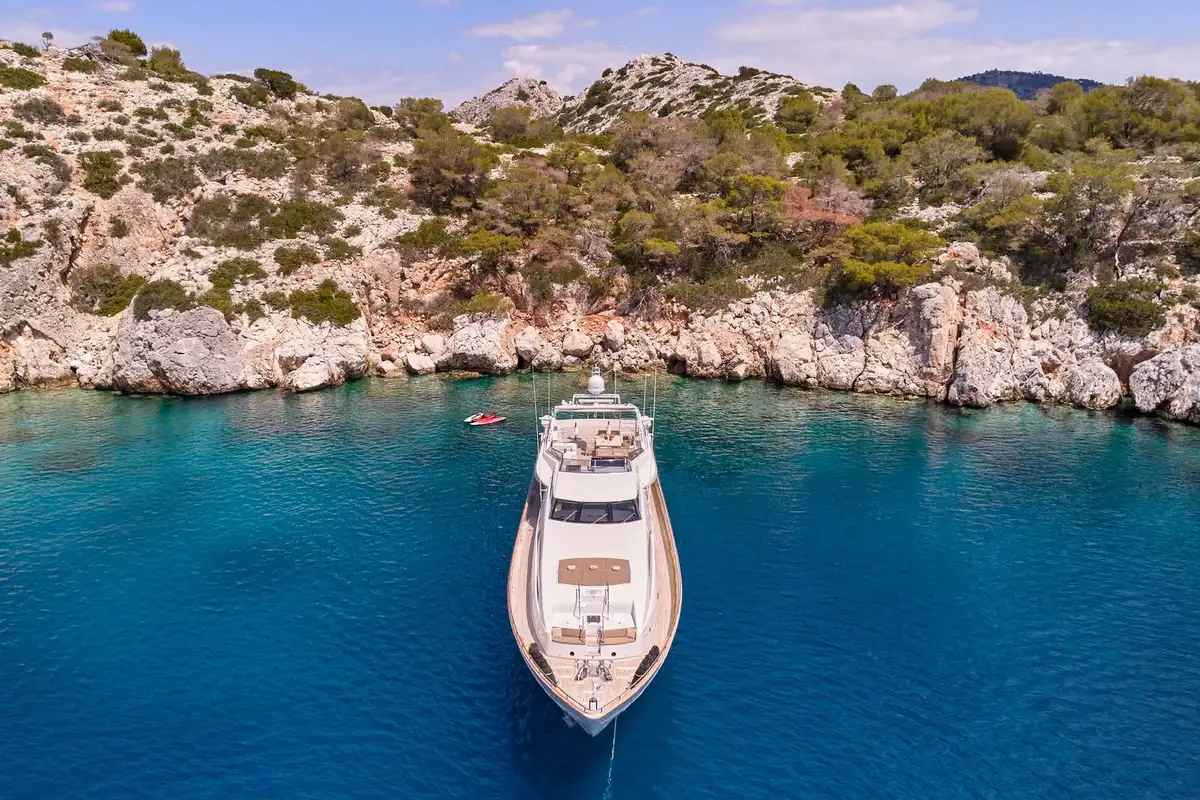 Backed by hills and vegetation, this picturesque beach is popular with visitors. There are other small coves barely accessible on foot but easy to reach by tender, ideal for privacy.