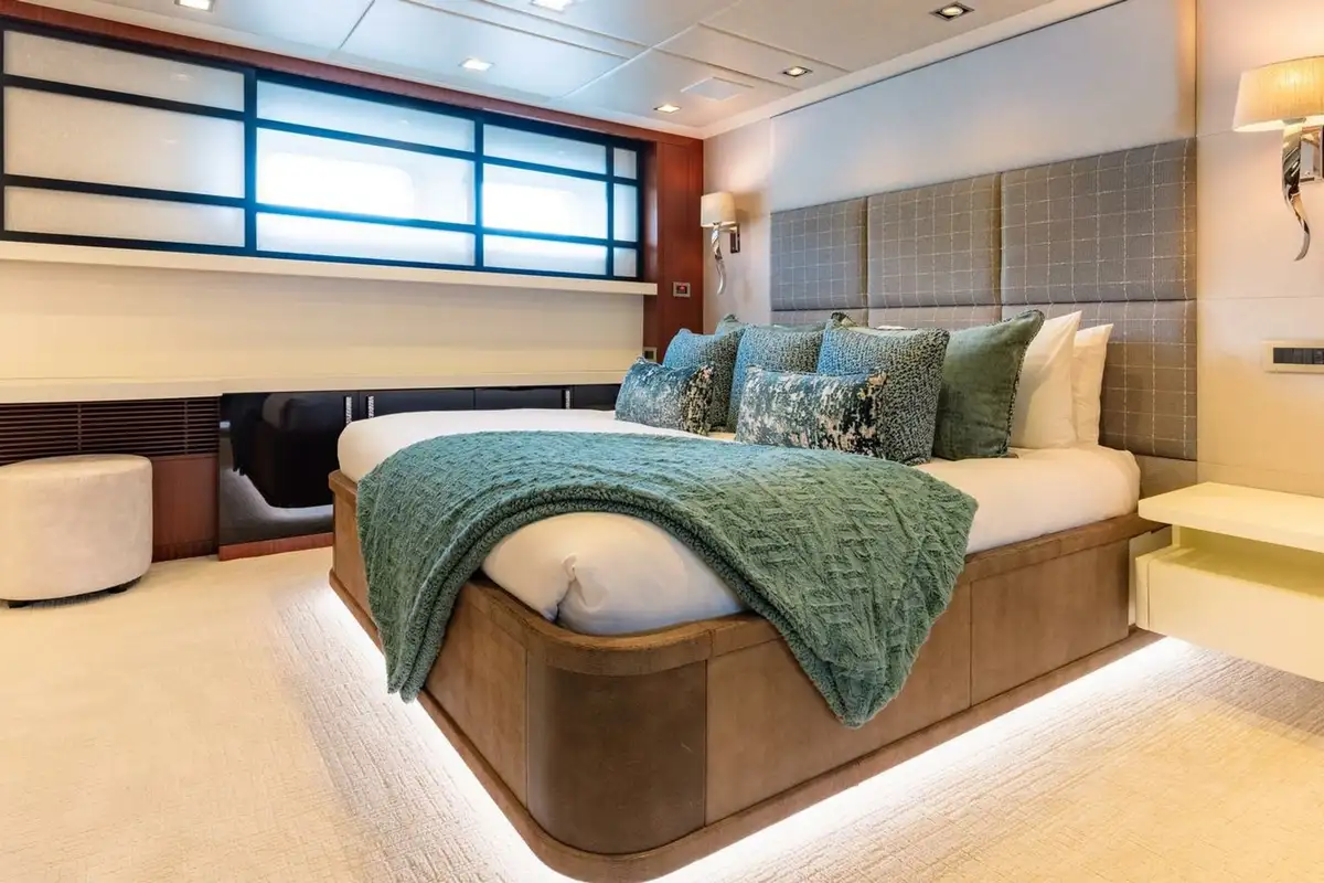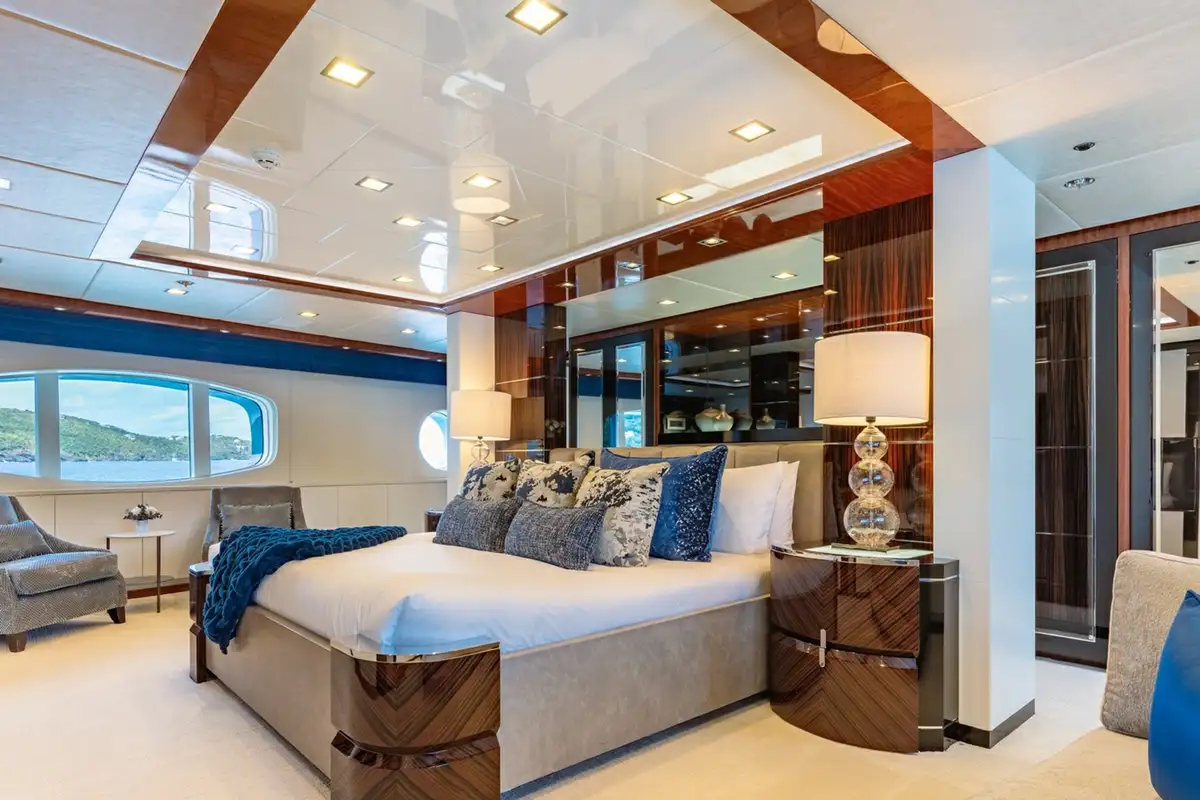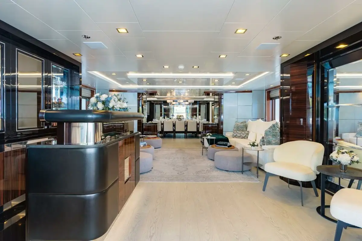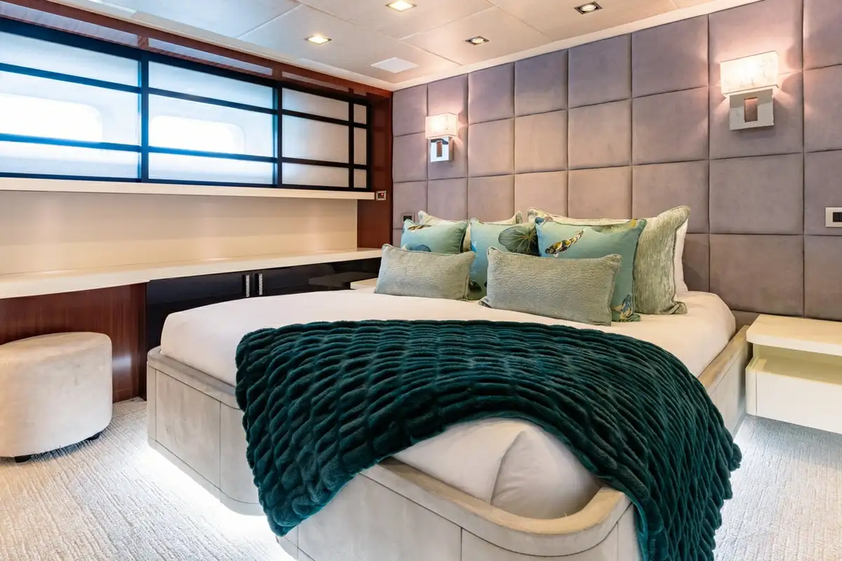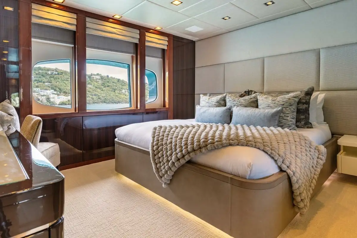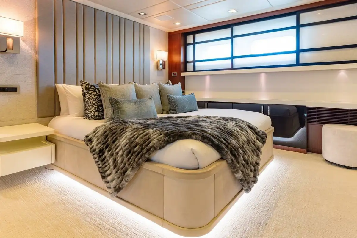 The main lounge exudes elegance thanks to rich fabrics in grey and blue paired with subtle accents of silver. A bar and formal dining area add to the grandeur of that space. On the upper deck, the sky lounge offer a large sofa to relax and a second bar ideal for socialising and enjoying cocktails with family and friends. A full beam master cabin as well as a bright VIP cabin are located on the main deck. A further four guest cabins can be found on the lower deck, all with en suite and beautifully decorated.