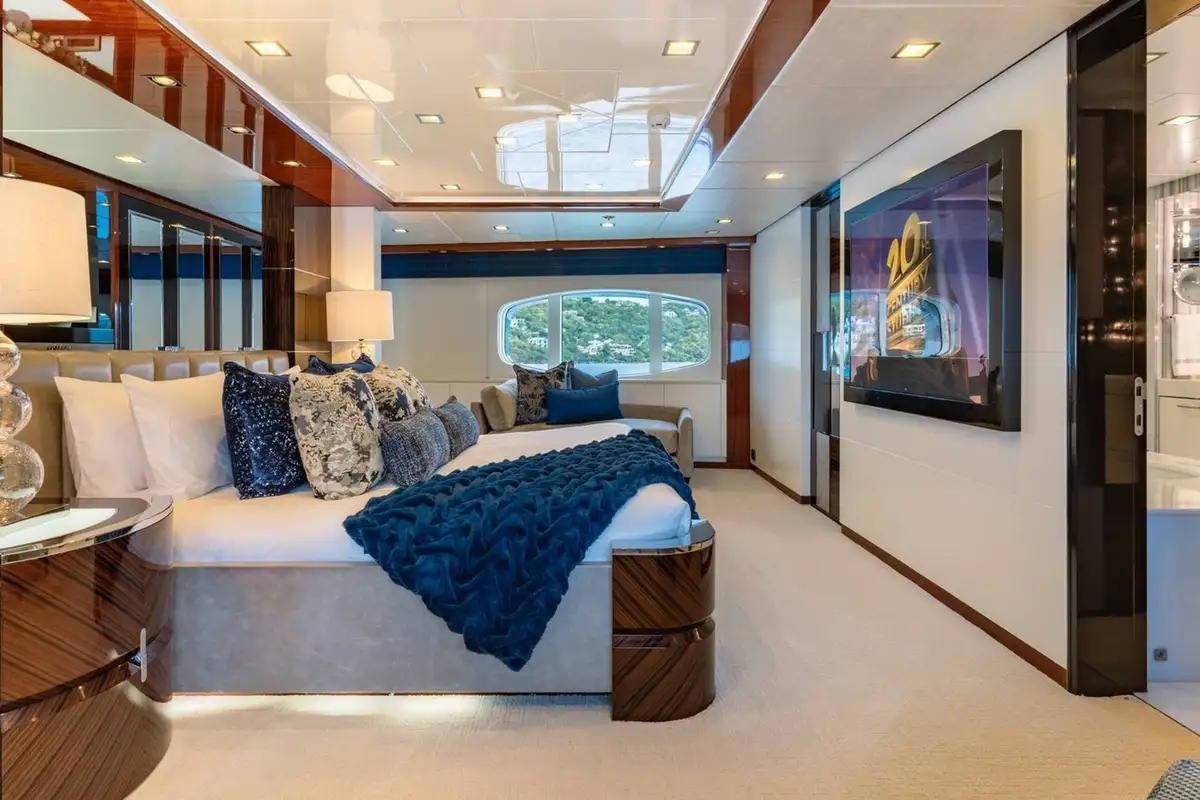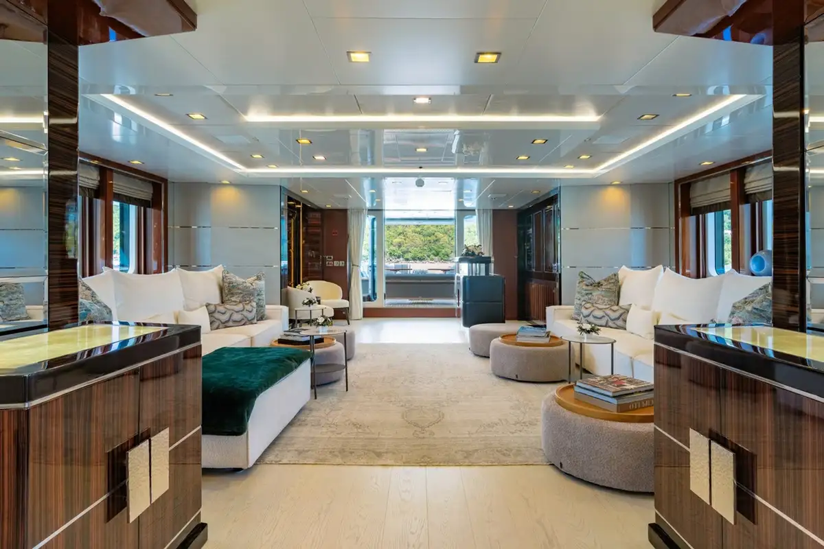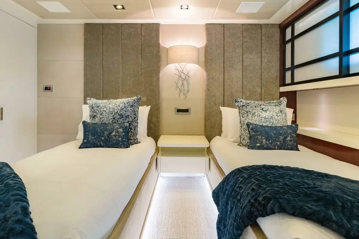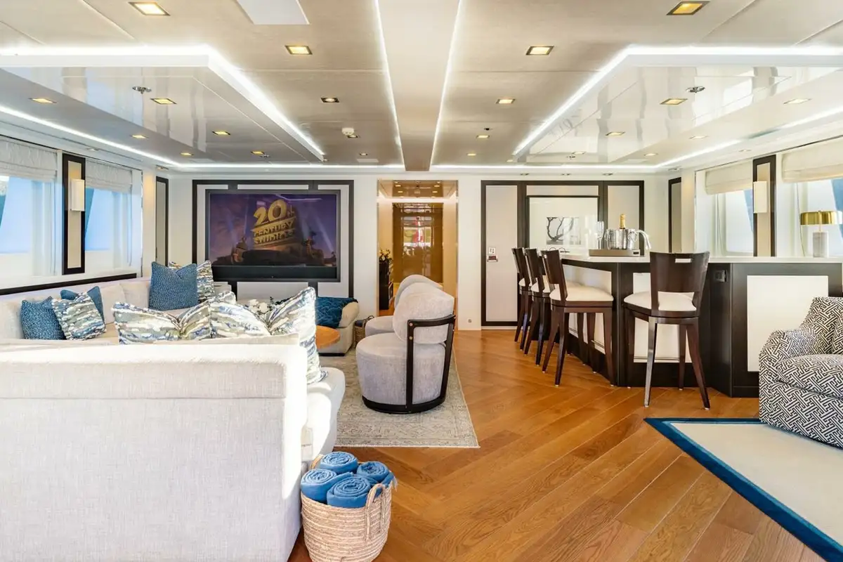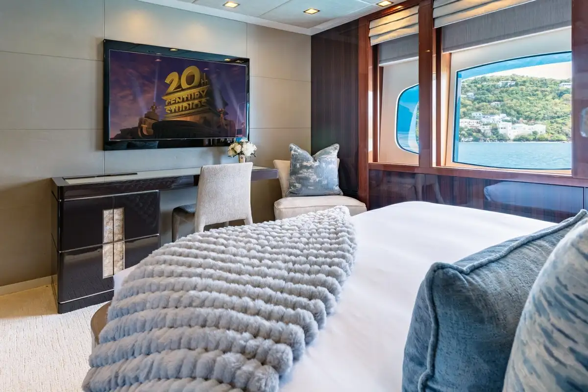 The main lounge exudes elegance thanks to rich fabrics in grey and blue paired with subtle accents of silver. A bar and formal dining area add to the grandeur of that space. On the upper deck, the sky lounge offer a large sofa to relax and a second bar ideal for socialising and enjoying cocktails with family and friends. A full beam master cabin as well as a bright VIP cabin are located on the main deck. A further four guest cabins can be found on the lower deck, all with en suite and beautifully decorated.