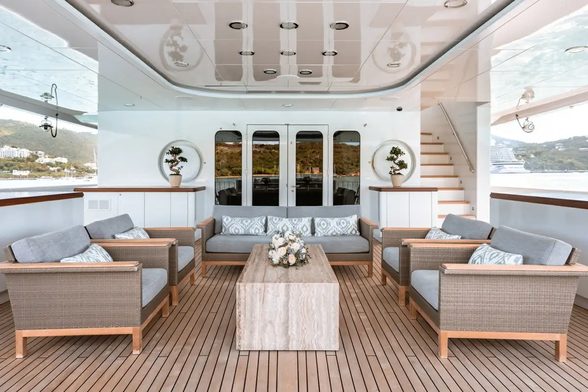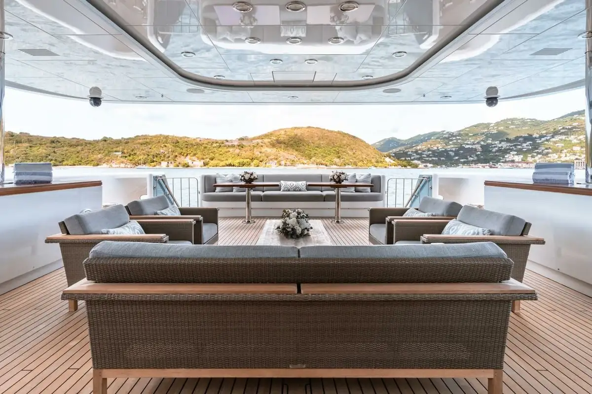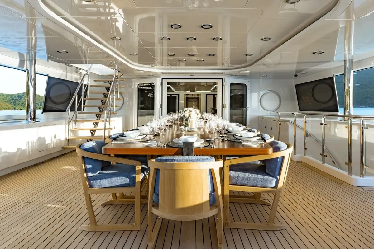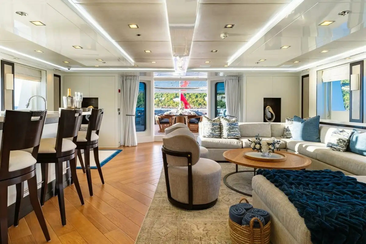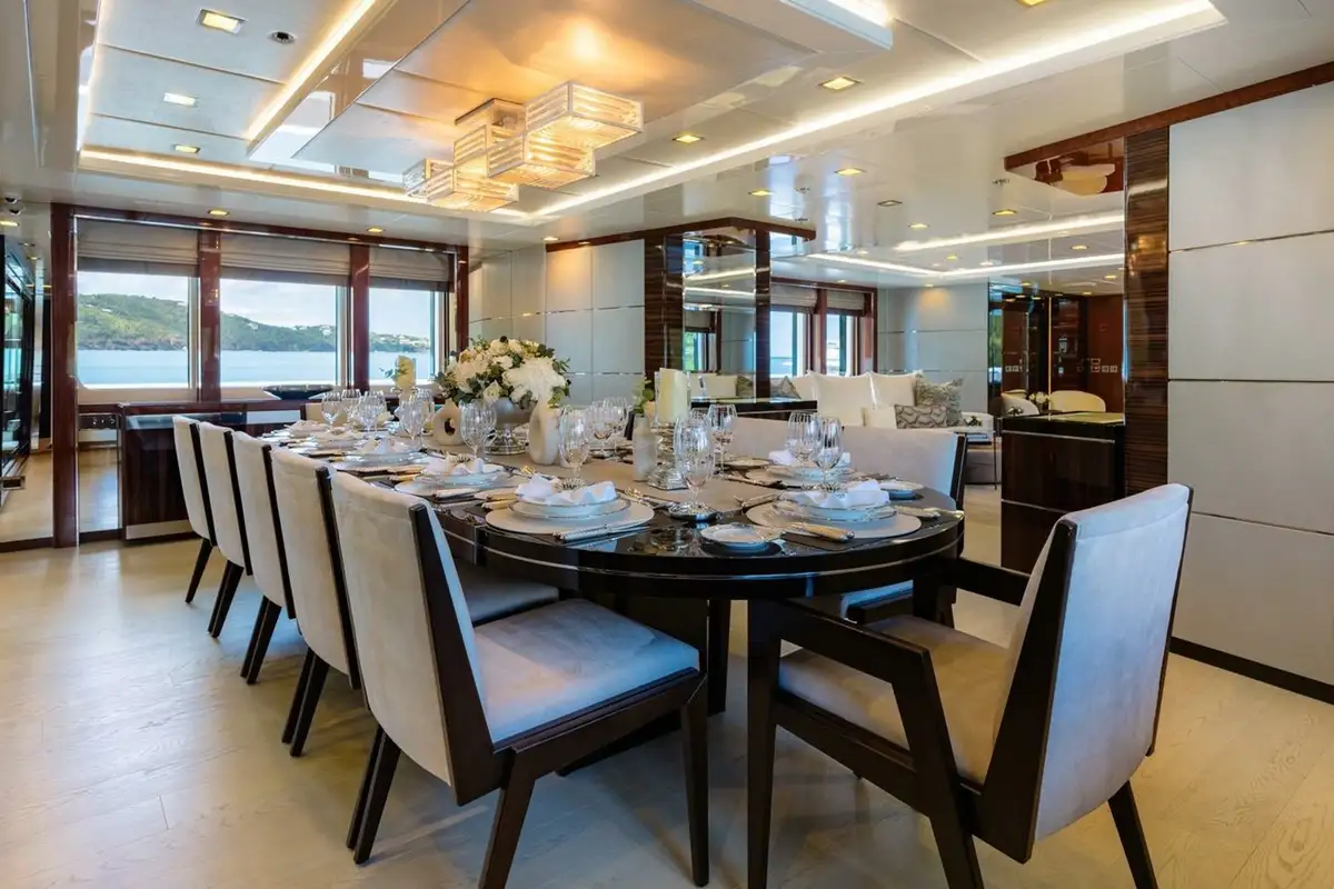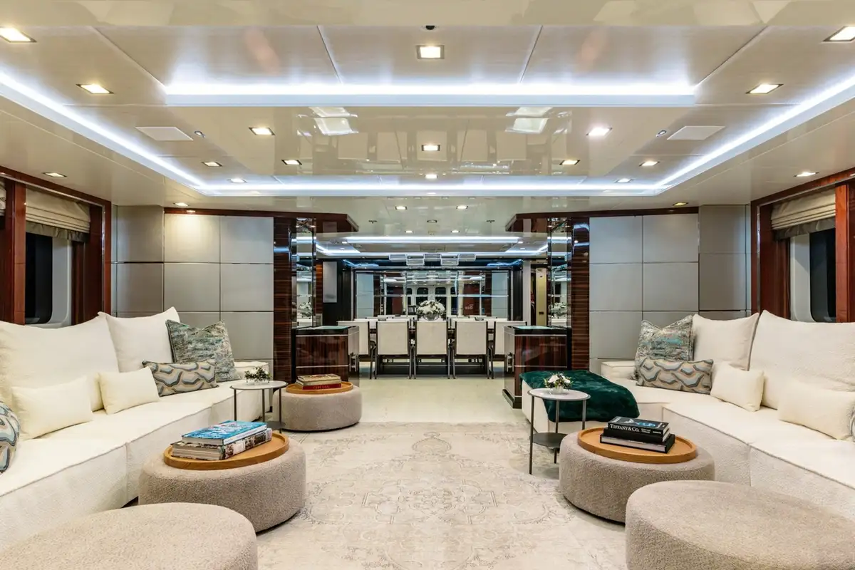 The main lounge exudes elegance thanks to rich fabrics in grey and blue paired with subtle accents of silver. A bar and formal dining area add to the grandeur of that space. On the upper deck, the sky lounge offer a large sofa to relax and a second bar ideal for socialising and enjoying cocktails with family and friends. A full beam master cabin as well as a bright VIP cabin are located on the main deck. A further four guest cabins can be found on the lower deck, all with en suite and beautifully decorated.