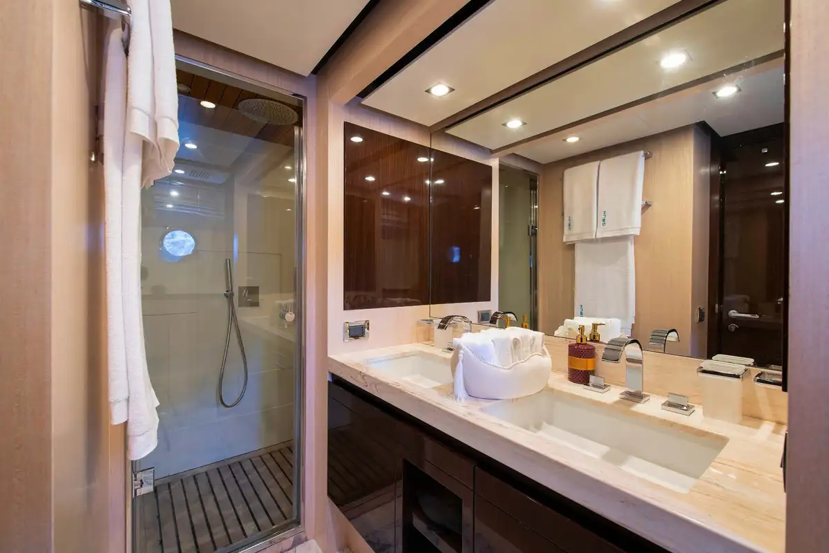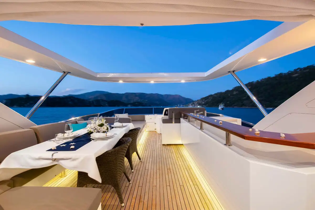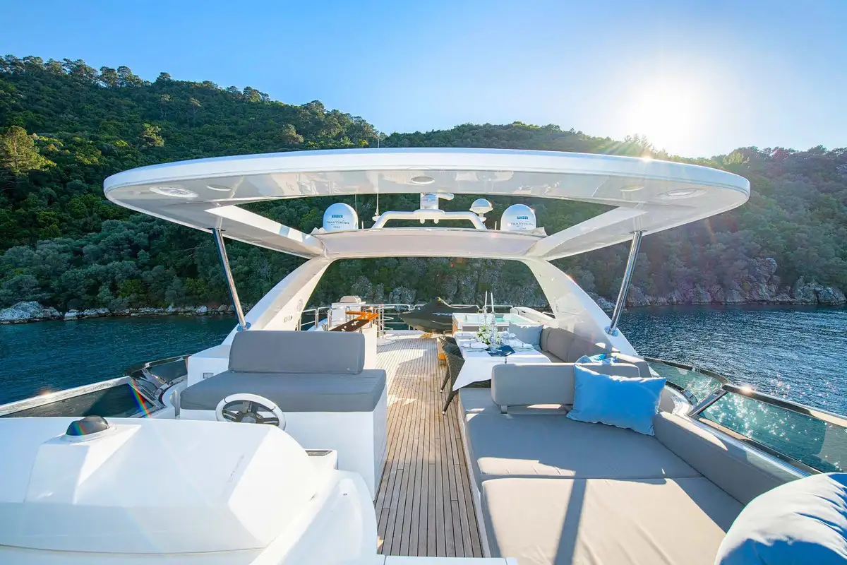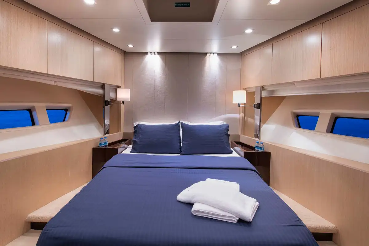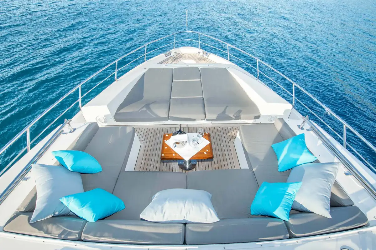 You can spend your day on the welcoming flybridge. It features a jacuzzi, wet bar area, al fresco dining area, and a large forward sunpad. The Flybridge offers the perfect space for outdoor entertainment and relaxation.