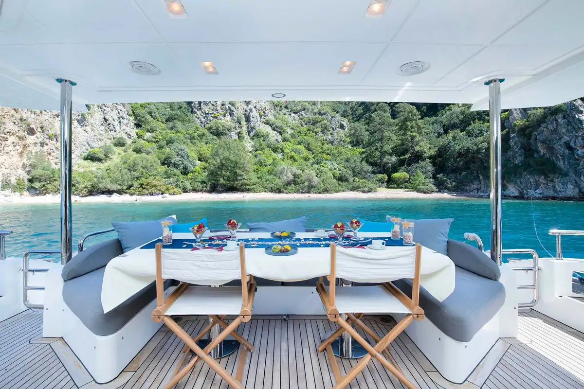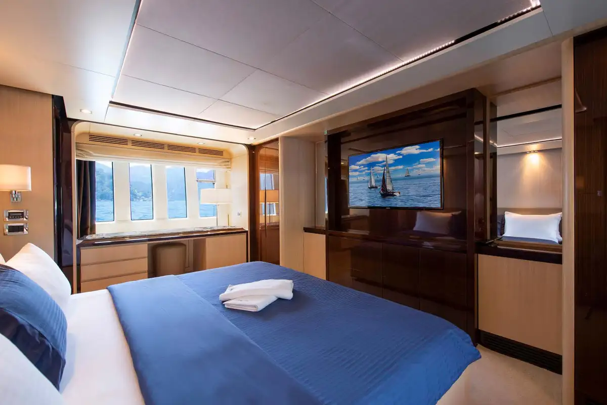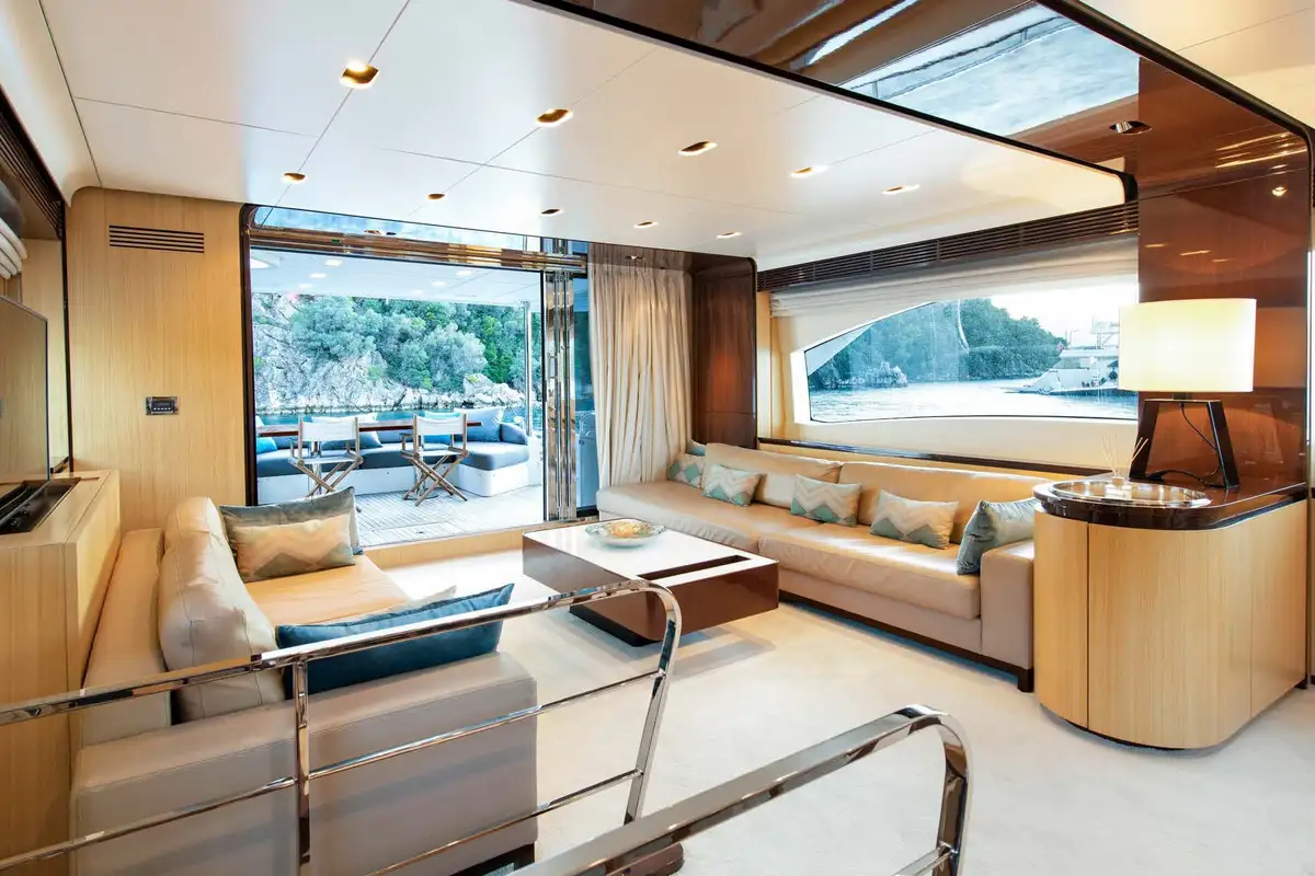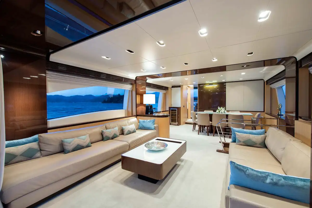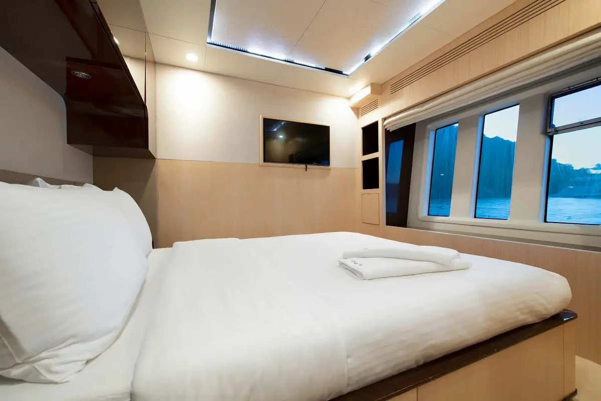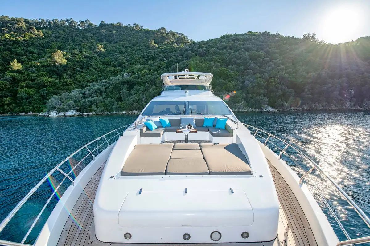 You can spend your day on the welcoming flybridge. It features a jacuzzi, wet bar area, al fresco dining area, and a large forward sunpad. The Flybridge offers the perfect space for outdoor entertainment and relaxation.