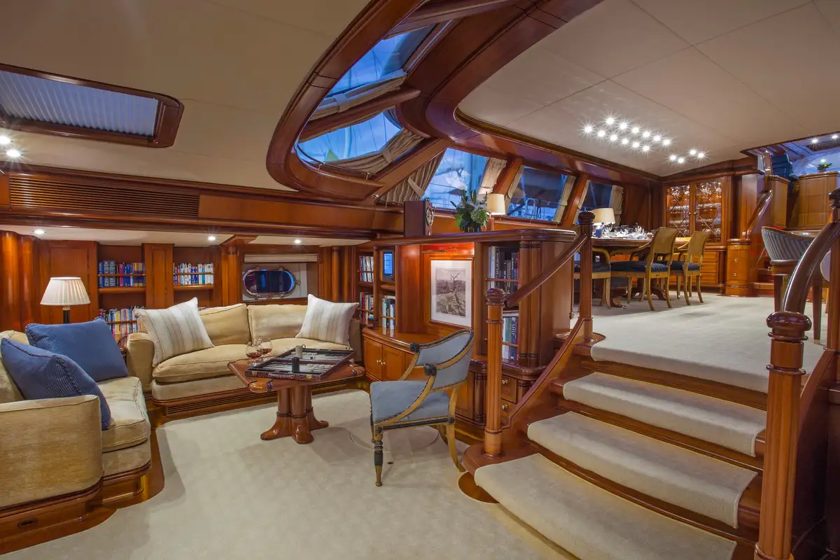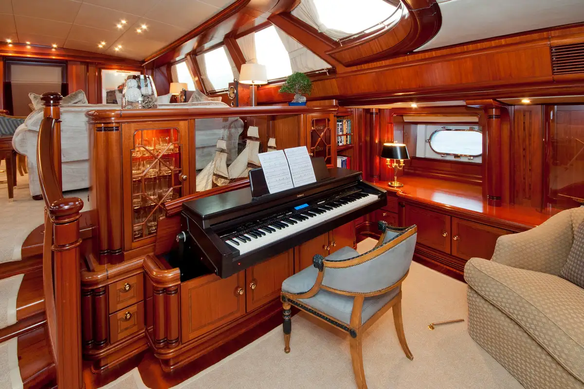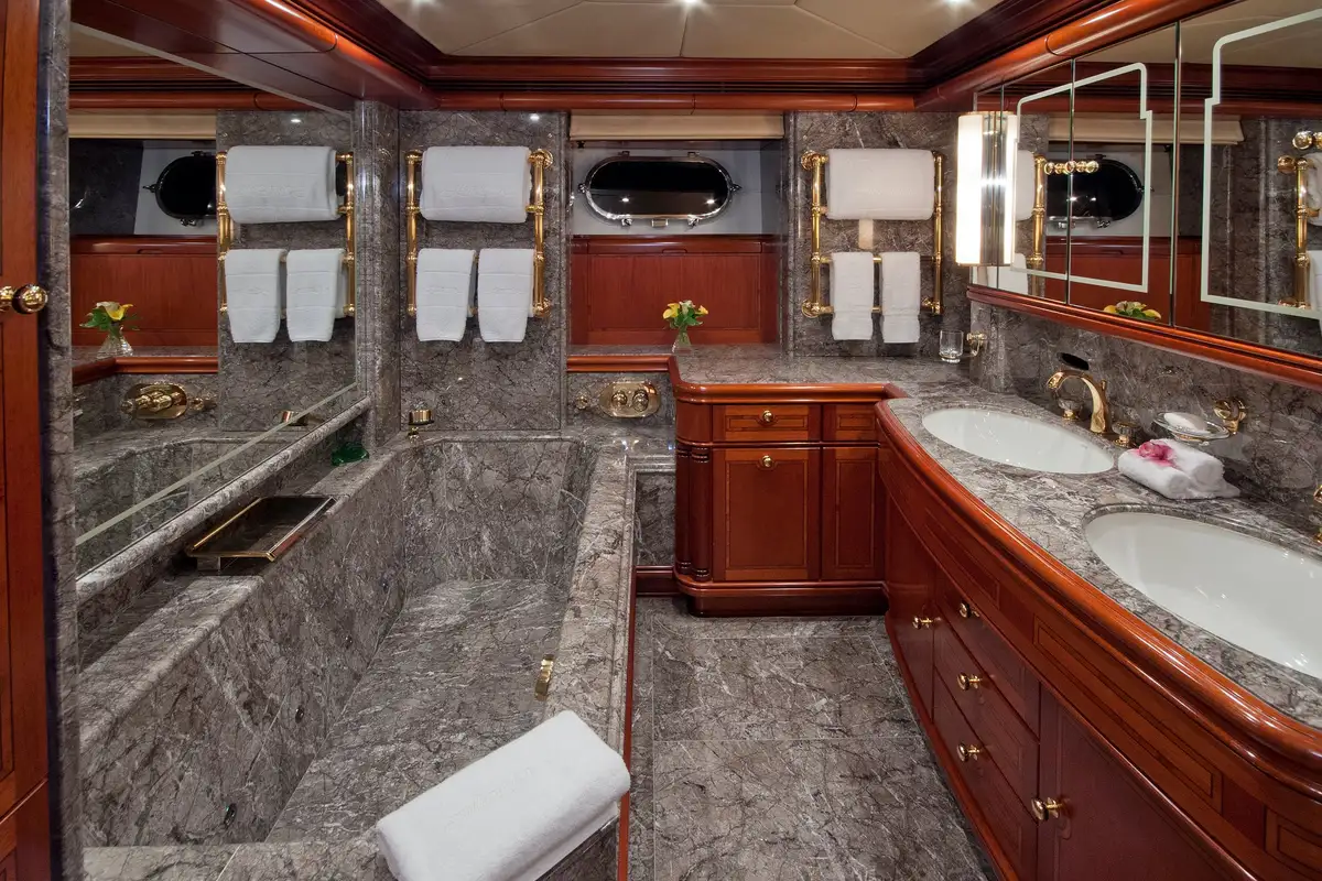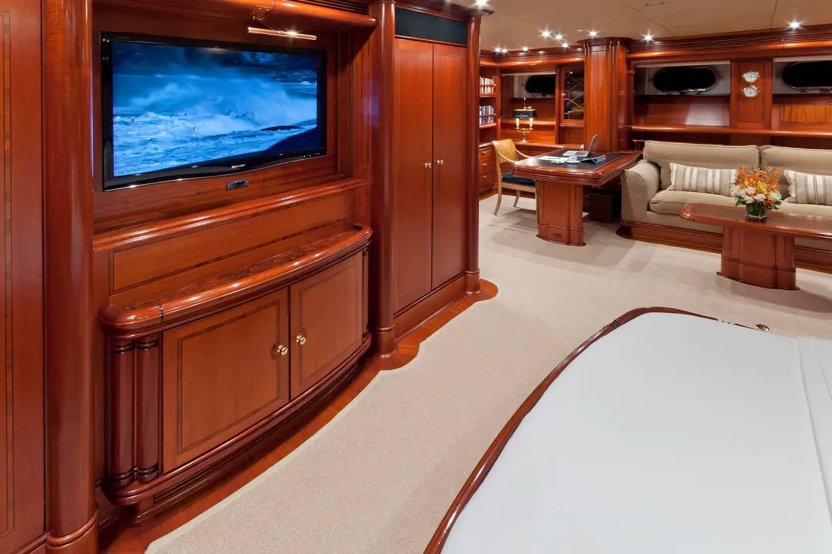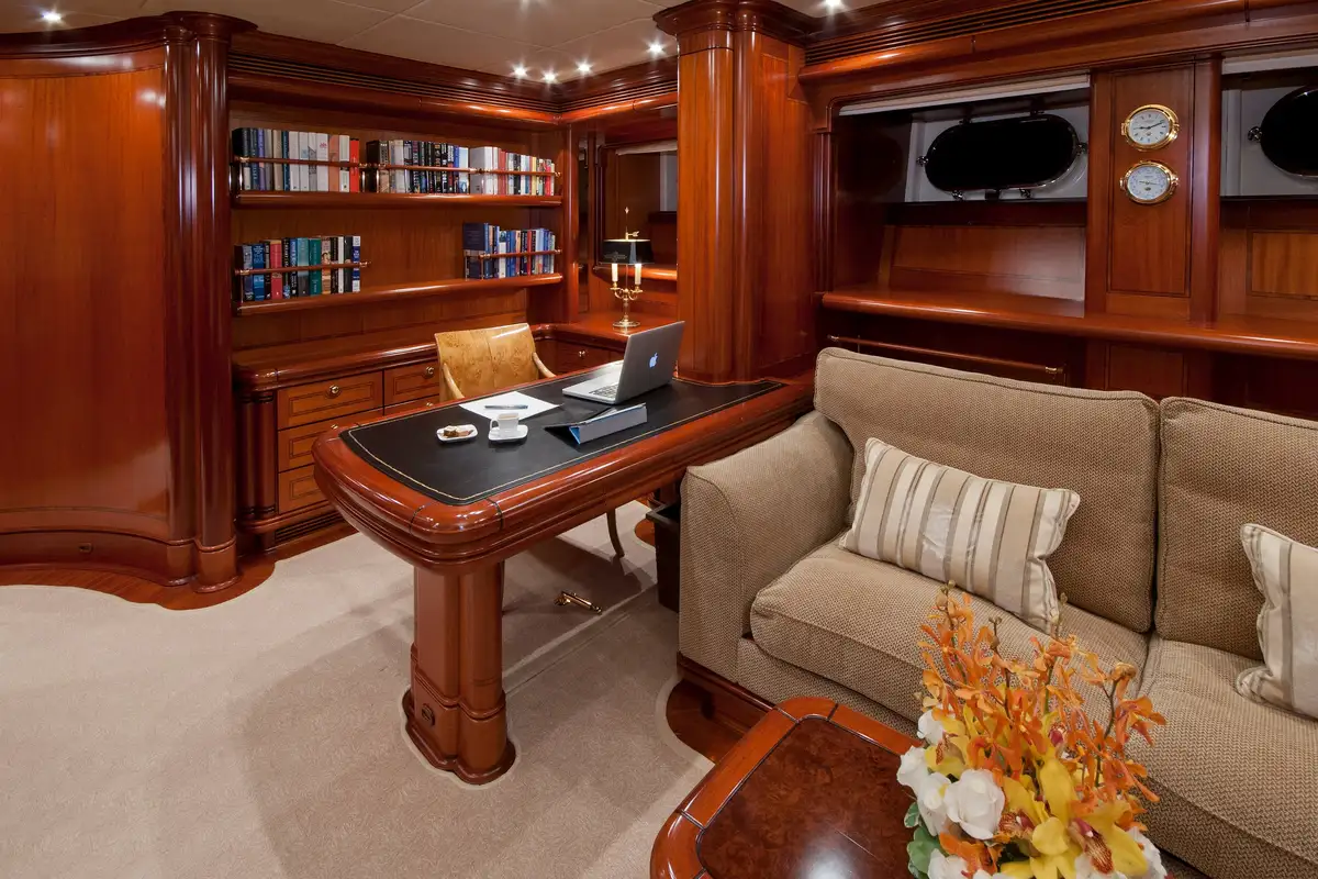The mezzanine main lounge is a spectacular space, finished in timeless, true yachting style. There’s a large formal dining area, lounges on two levels and even a piano. You and your guests can gather to enjoy a movie together on the big plasma screen, or each find a space to relax that suits their mood. The master cabin is another special feature with a private lounge space, a separate office and a full marble bathroom.