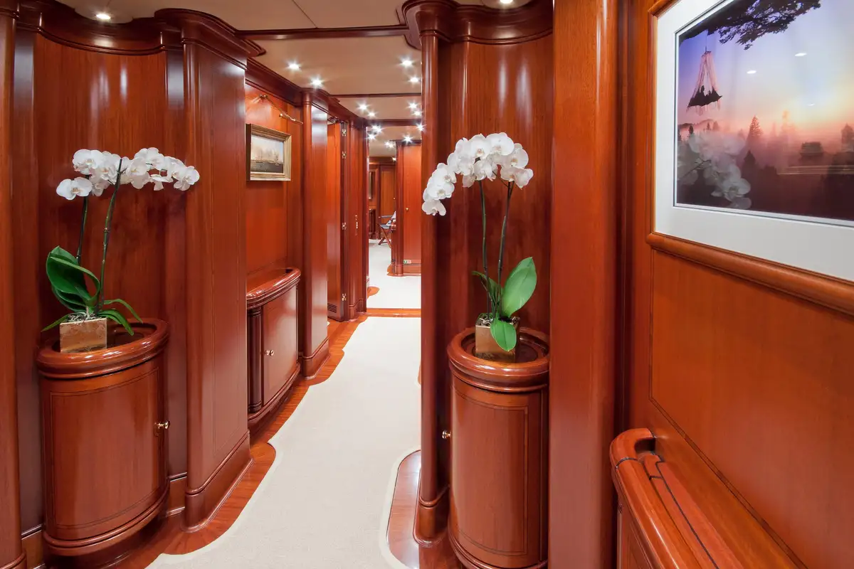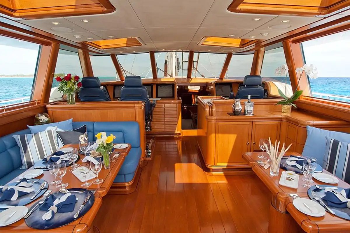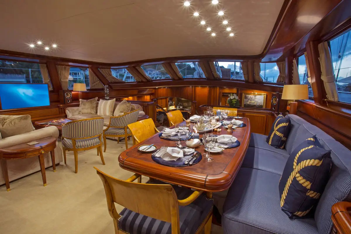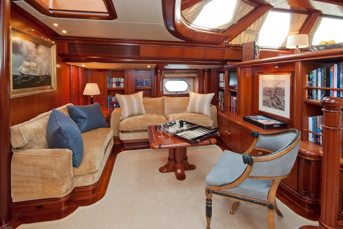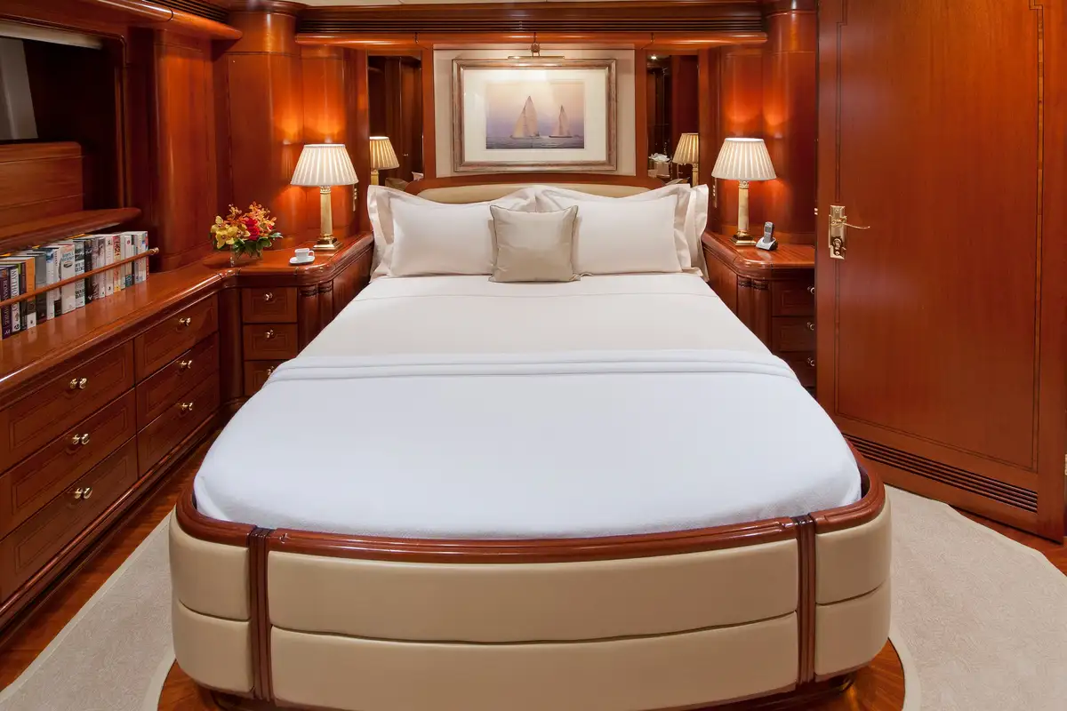 The mezzanine main lounge is a spectacular space, finished in timeless, true yachting style. There’s a large formal dining area, lounges on two levels and even a piano. You and your guests can gather to enjoy a movie together on the big plasma screen, or each find a space to relax that suits their mood. The master cabin is another special feature with a private lounge space, a separate office and a full marble bathroom.