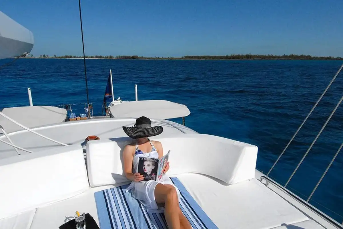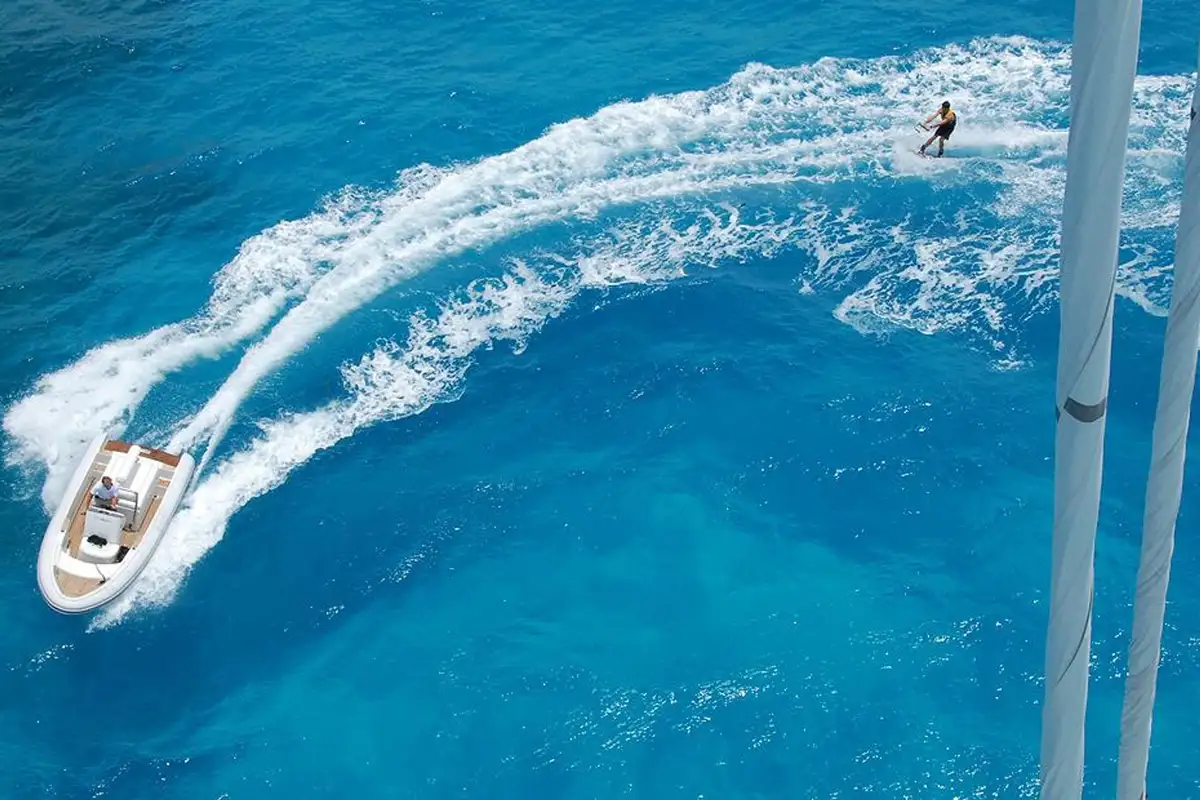 Later, when she’s anchored in a calm lagoon, there are almost literally acres of space on deck. A bathing platform folds out of her stern, the comfy sundeck beckons with its elevated view and a fleet of aquatic toys are deployed. She carries two tenders with powerful engines, plus waterskis, wakeboards and towable inflatables for high-octane fun. Kiteboarding and snorkelling gear are also in the inventory and you can try your luck at deep-sea fishing as you cruise along in style.