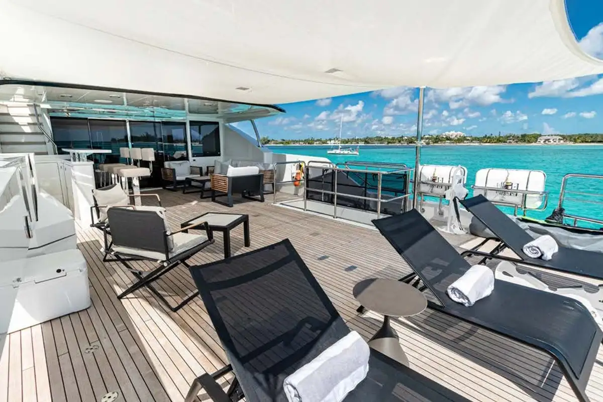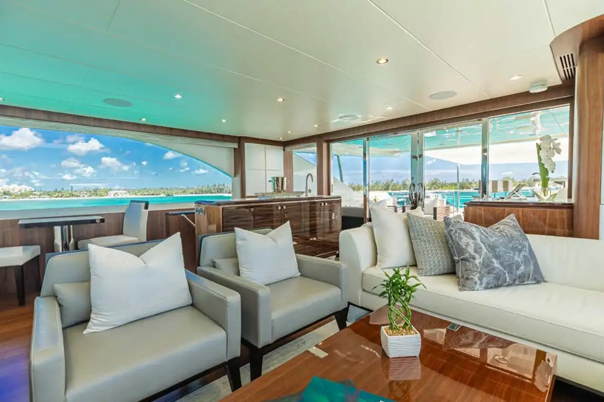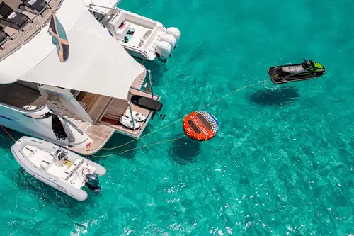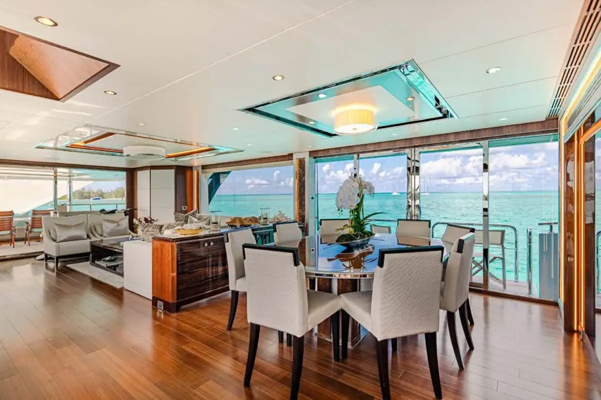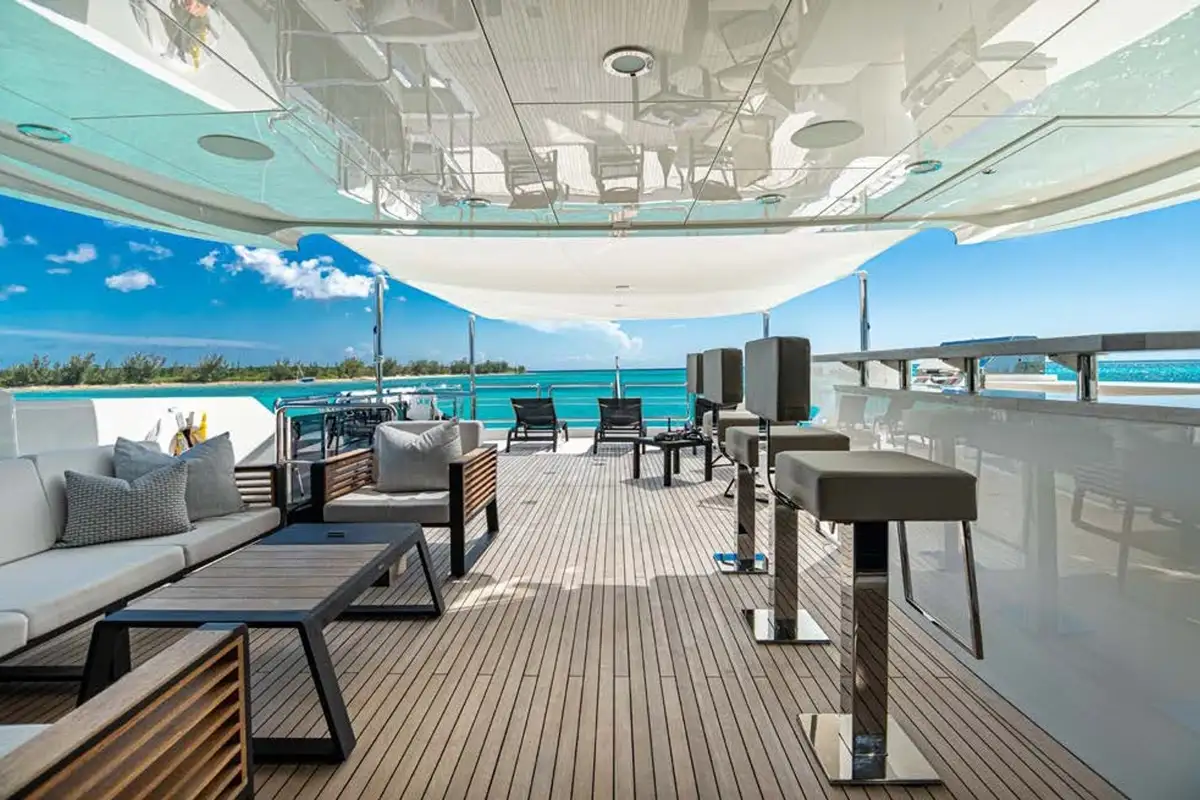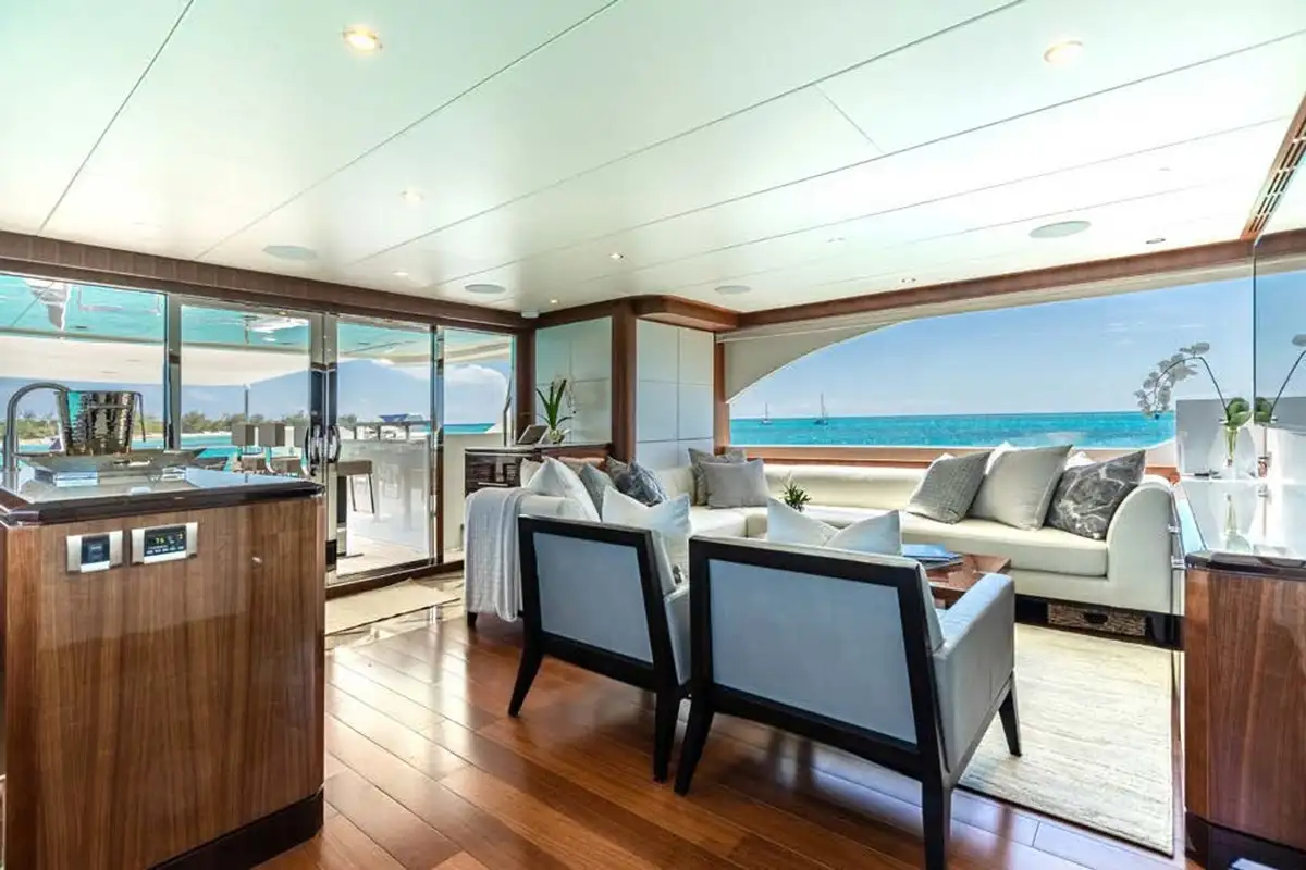 On board highlights include the hardtop sun deck with its big jacuzzi, bar and sociable seating, all in ample shade; the sea-level beach club with comfy sofas in her stern; the magnificent master suite with its commanding view; and the extra-large through-hull windows in all other cabins so every guest can wake up with an inspiring view of the sea.