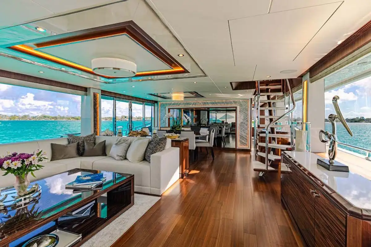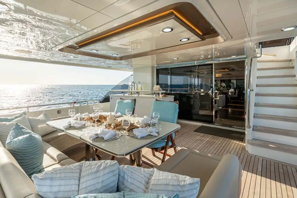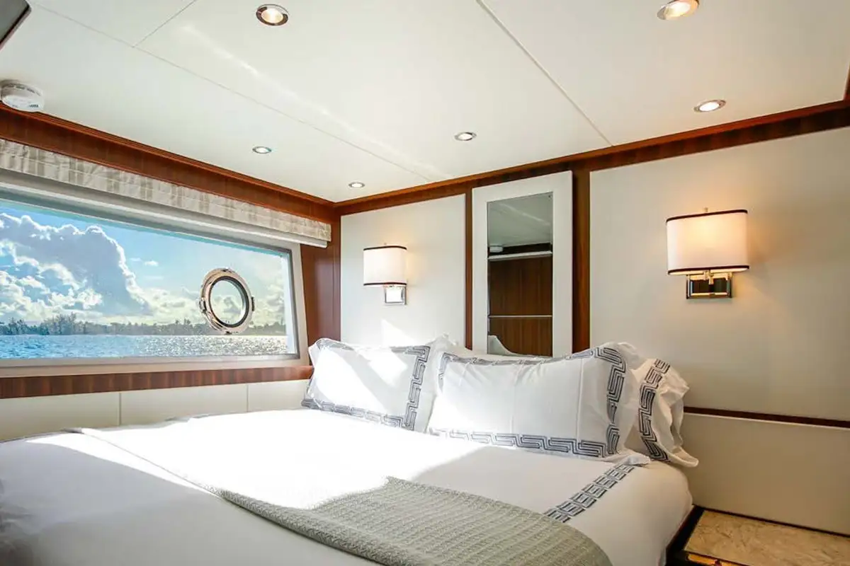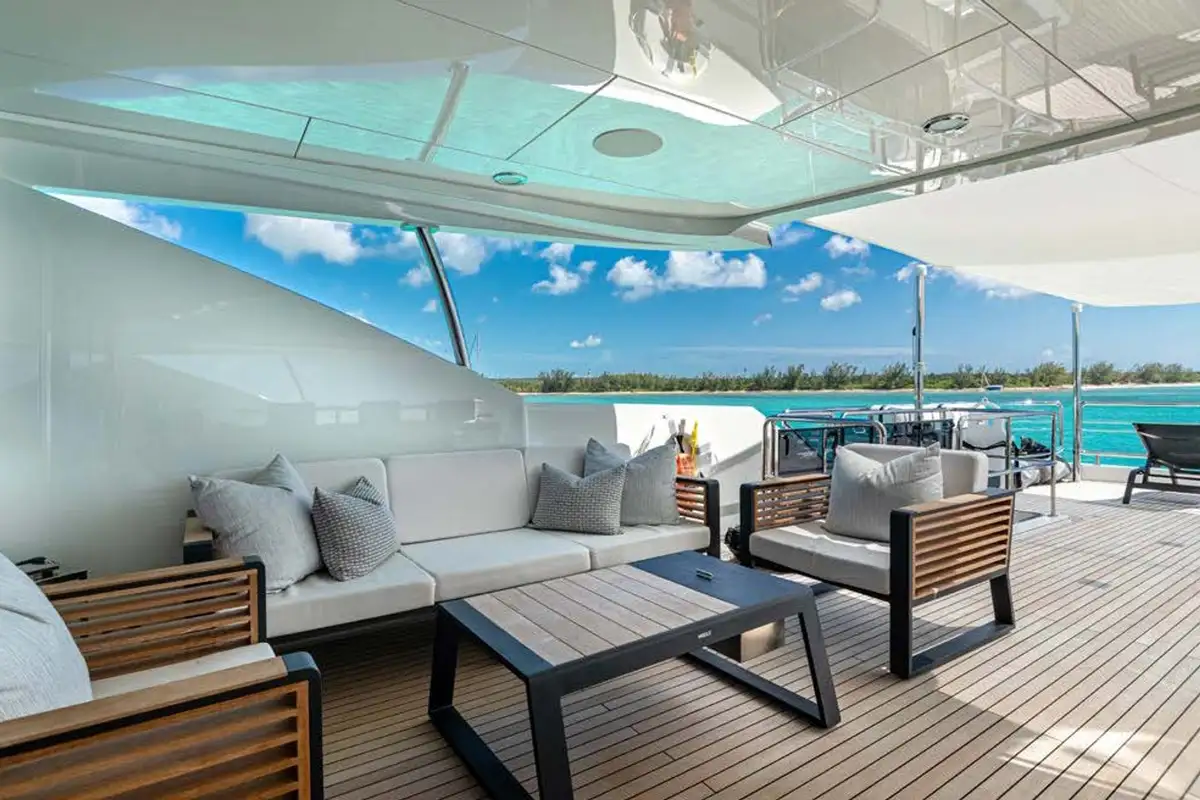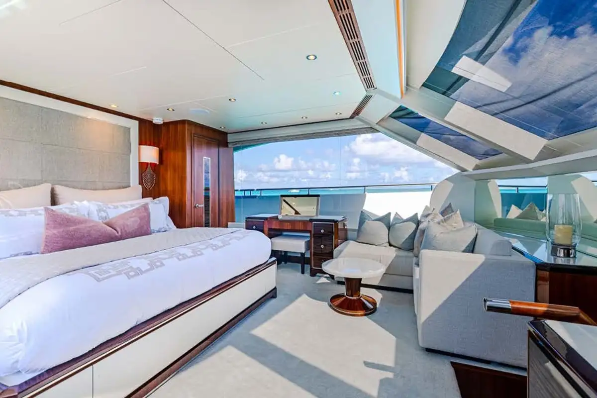 On board highlights include the hardtop sun deck with its big jacuzzi, bar and sociable seating, all in ample shade; the sea-level beach club with comfy sofas in her stern; the magnificent master suite with its commanding view; and the extra-large through-hull windows in all other cabins so every guest can wake up with an inspiring view of the sea.