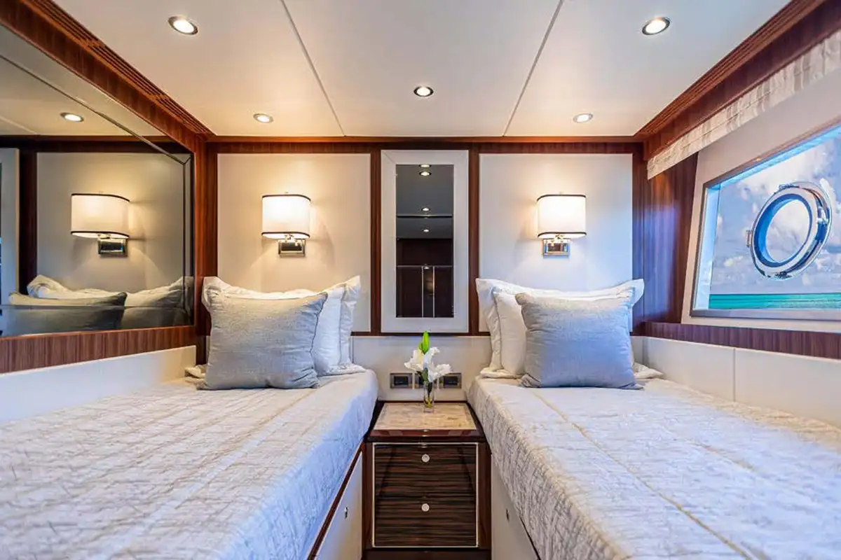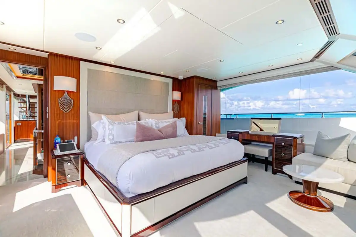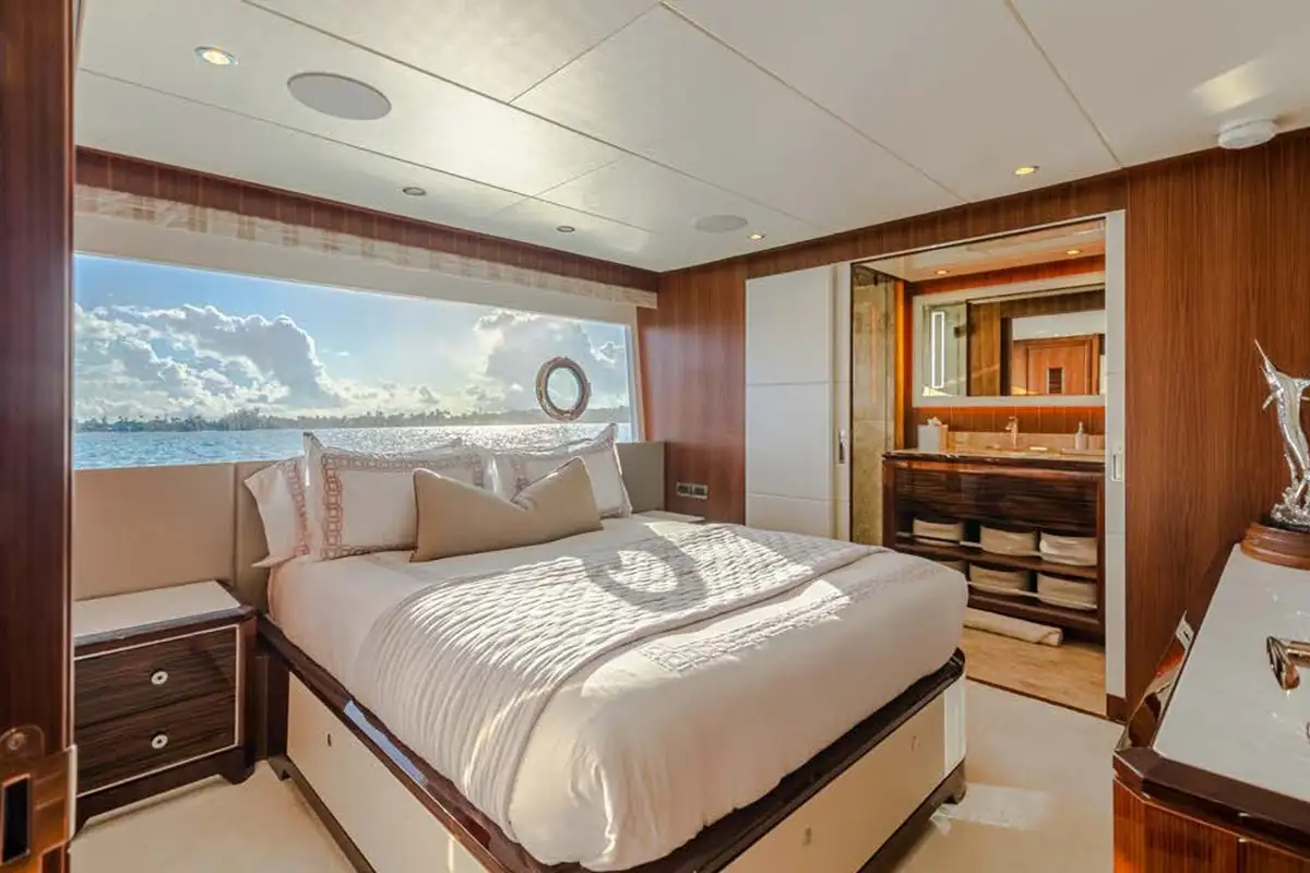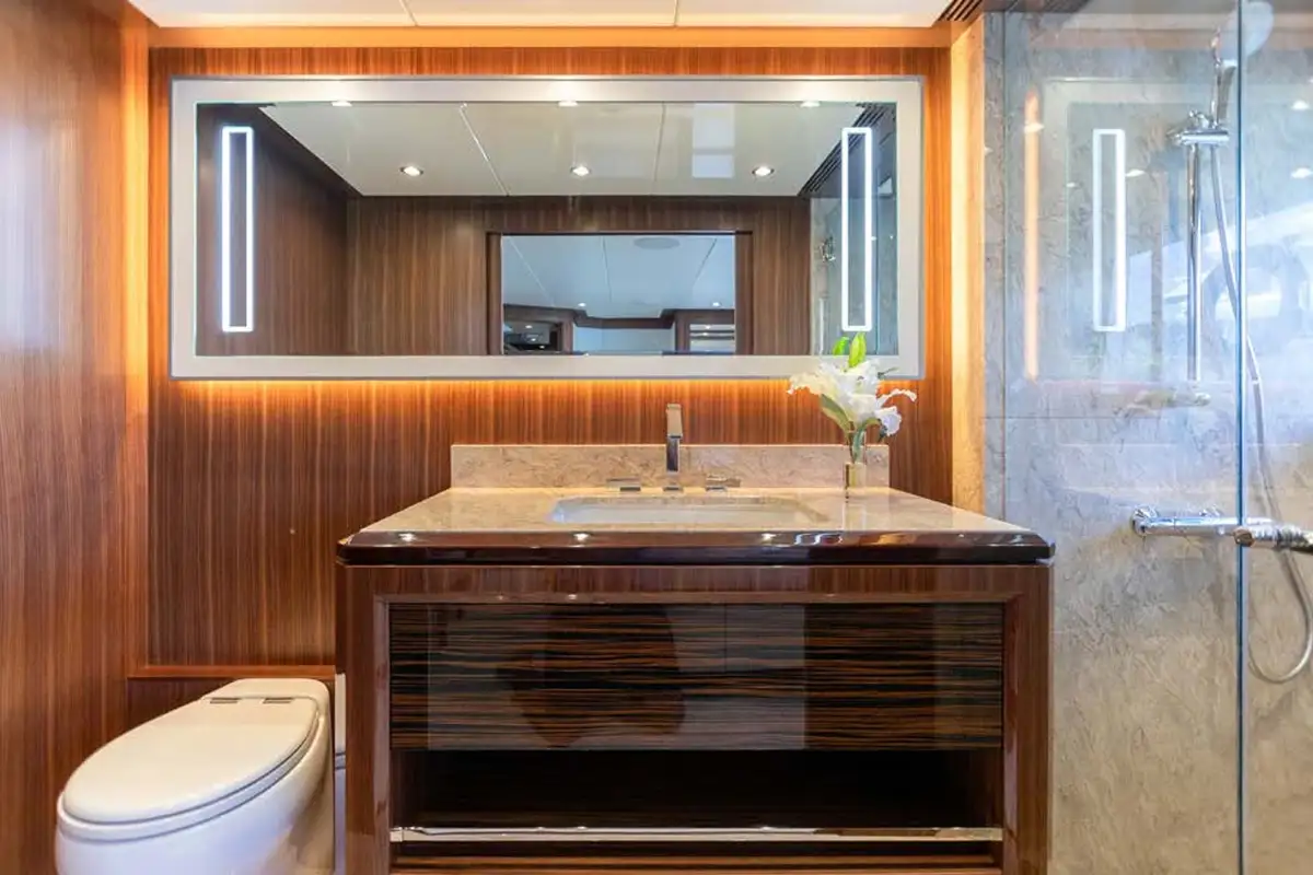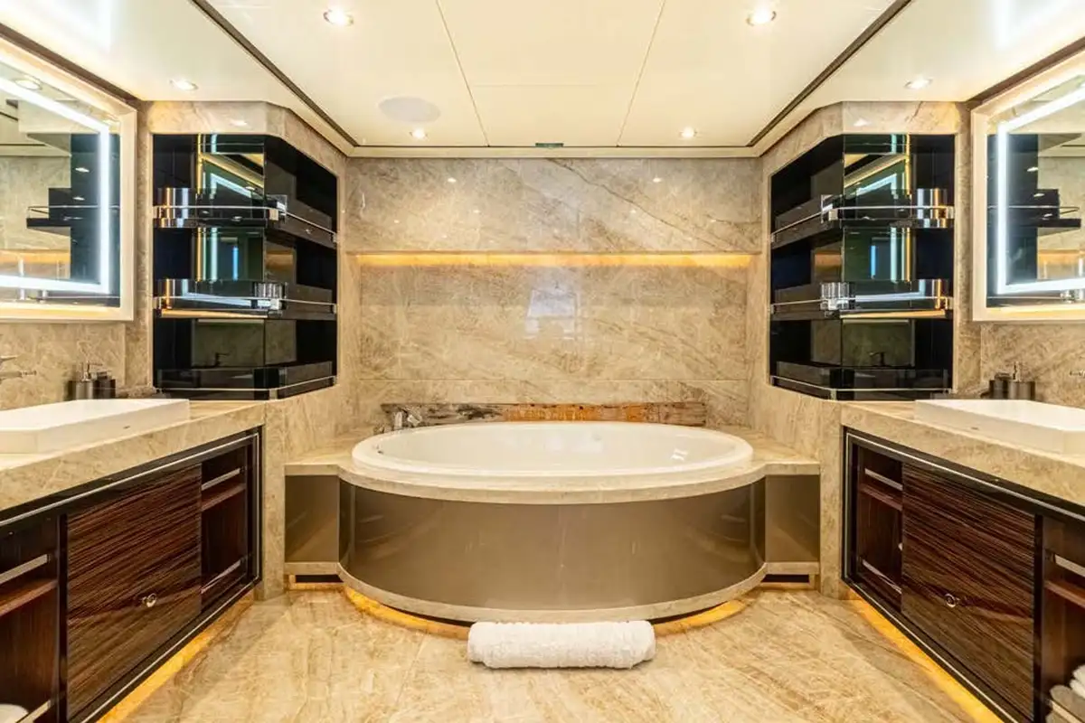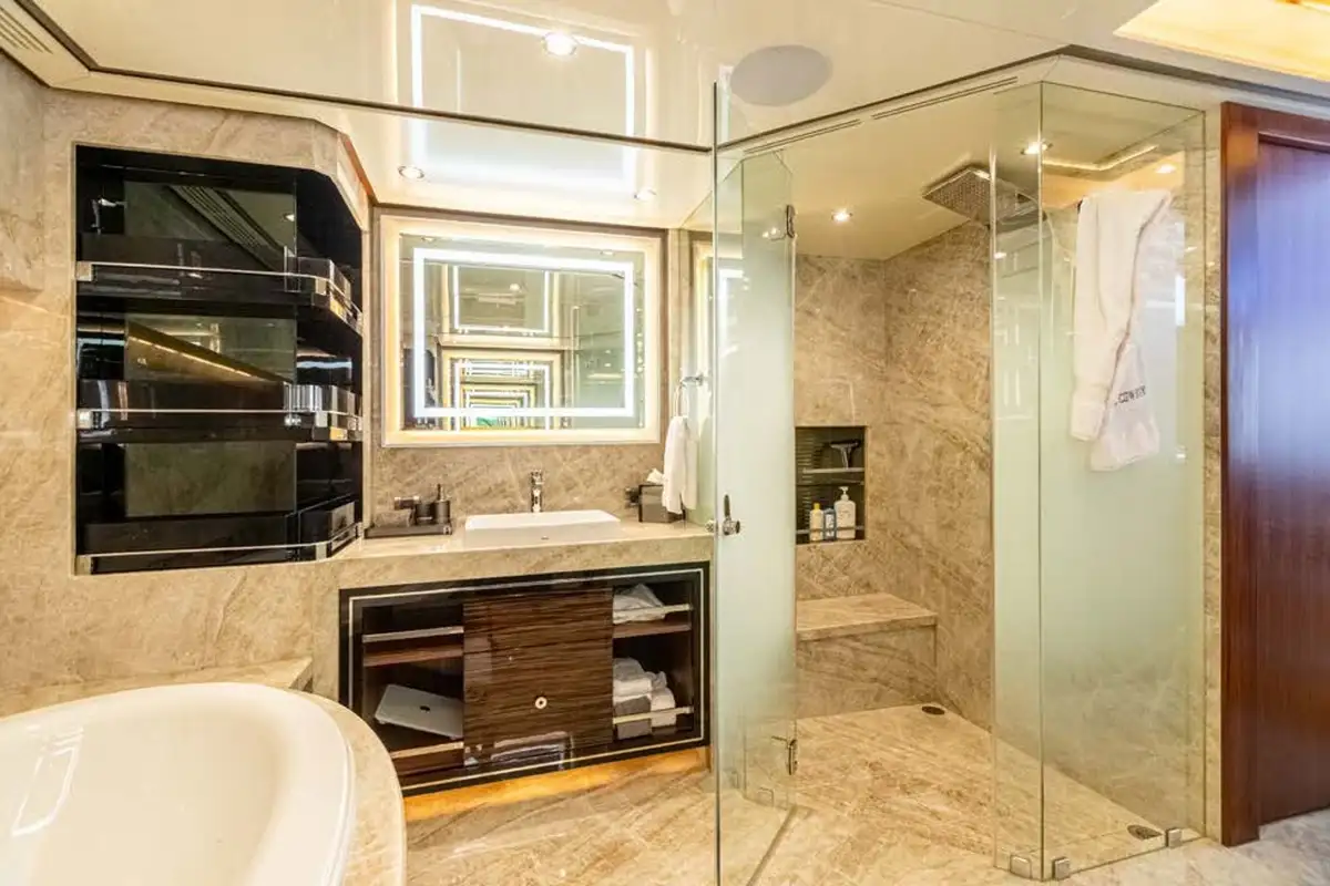 The master suite is a full-beam cabin, up front on the main deck level with incredible 270-degree views over the sea from the king size double bed, plus a desk and corner sofa. Steps lead down to a splendid en suite bathroom with a bathtub and separate shower, twin sinks and full marble finish. The other four guest cabins are two VIP doubles and two convertible twin/doubles, each with a private en suite bathroom.