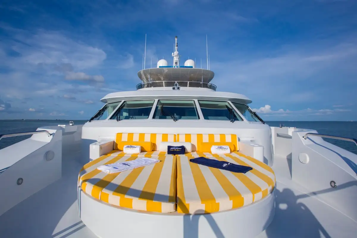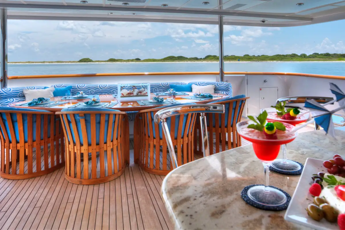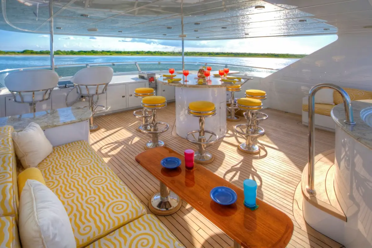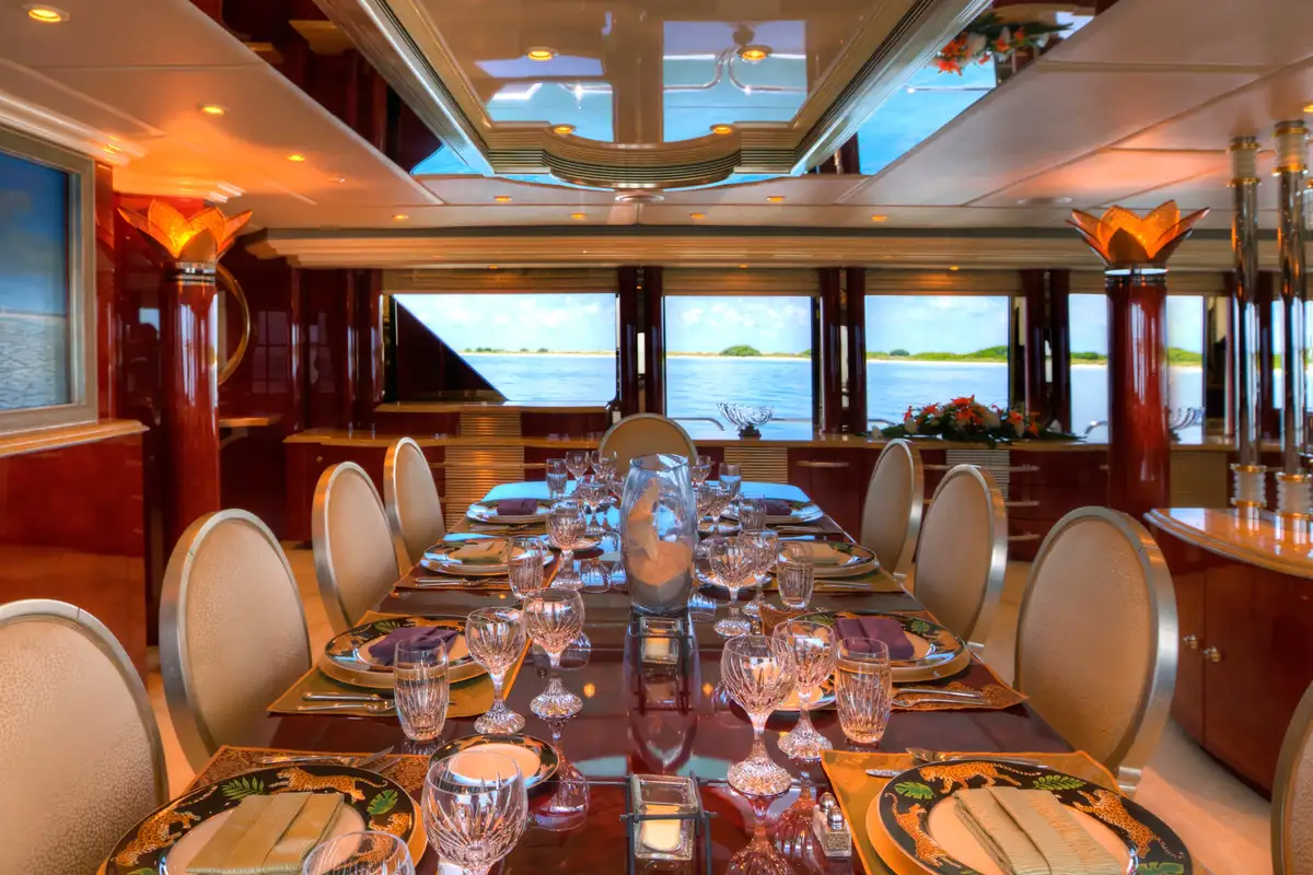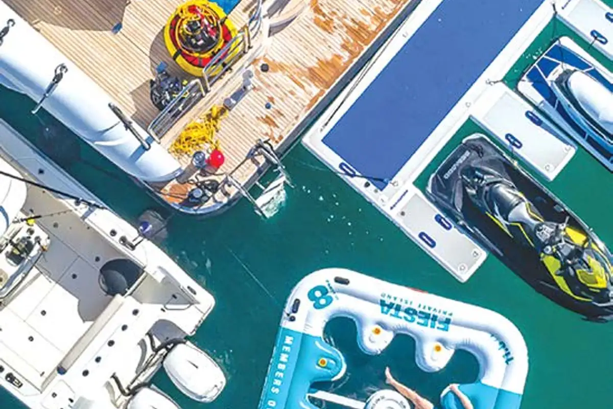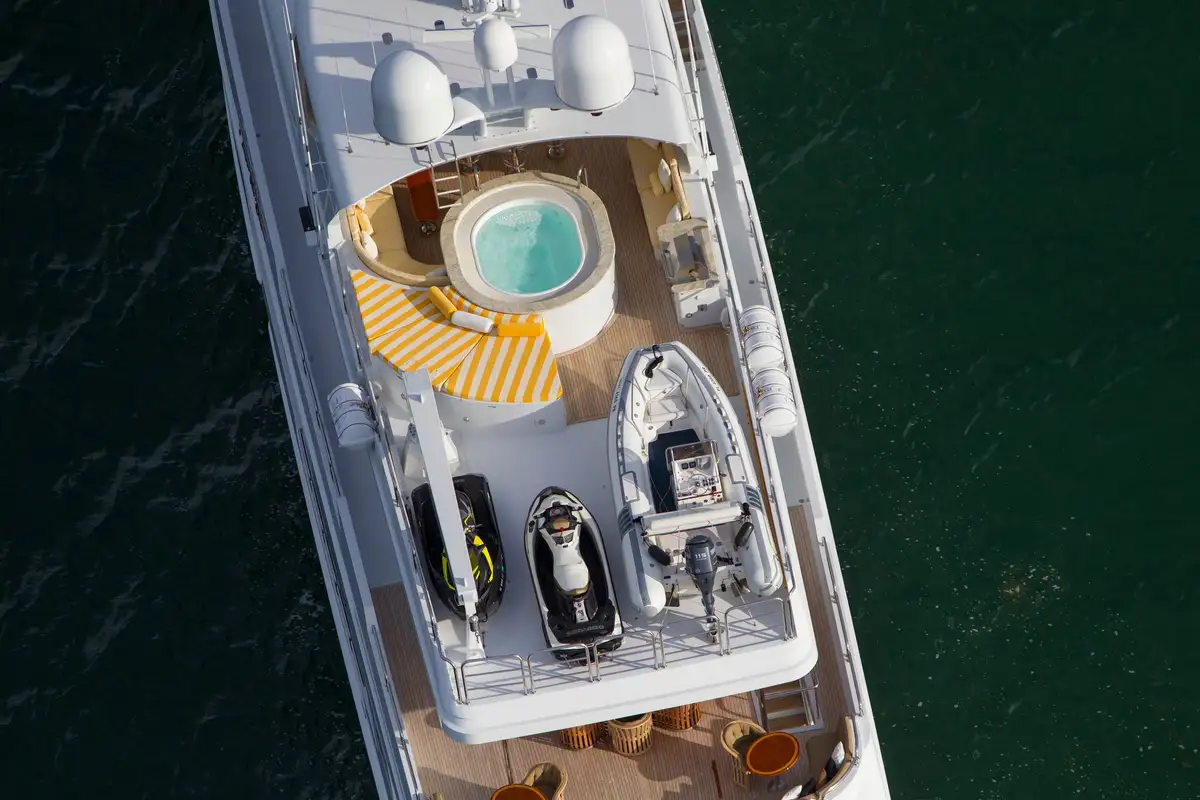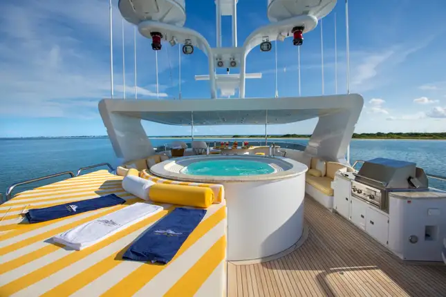 Another great asset is the extended, mezzanine main deck aft whose upper level is a relaxed lounge bar in deep shade while the lower level is an excellent beach club area where you can lounge at the water’s edge with big umbrellas for shade and there’s a floating dock for jet skis and a wide array of other watersports toys. Her main guest tender is a 9-metre (33ft) Boston Whaler fitted with gyro stabilisers and fully equipped for deep-sea fishing excursions. Her inventory also includes an 18ft RIB, SeaBobs, Hobie pedal/sail kayaks, waterskis, a wakeboard and inflatable tows, a full beach party setup and more.