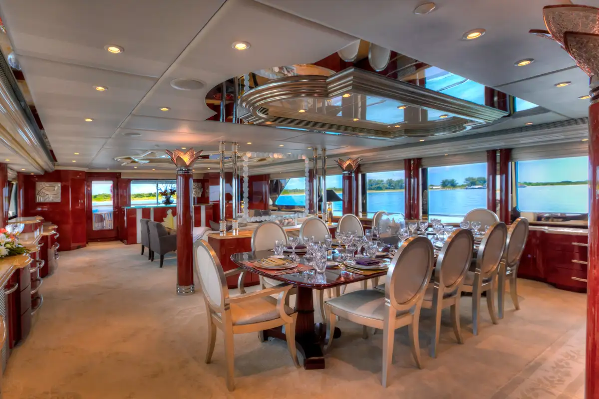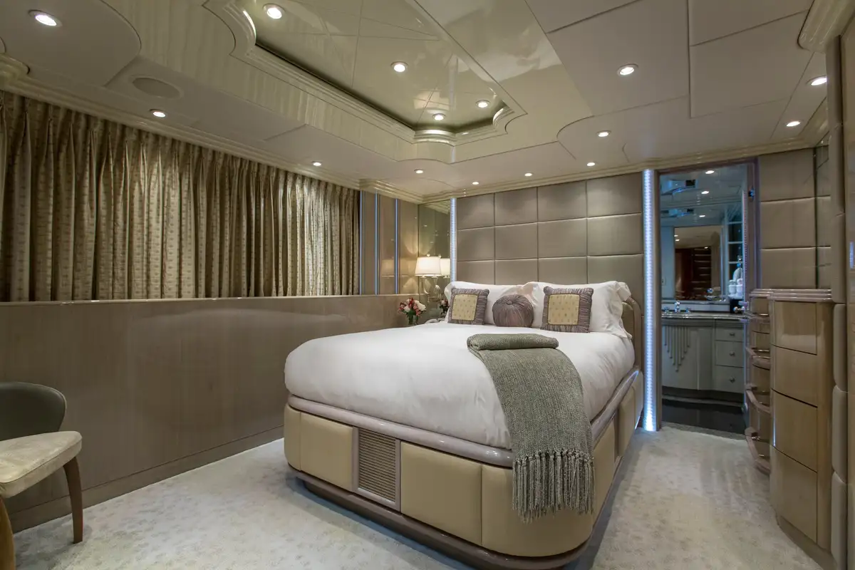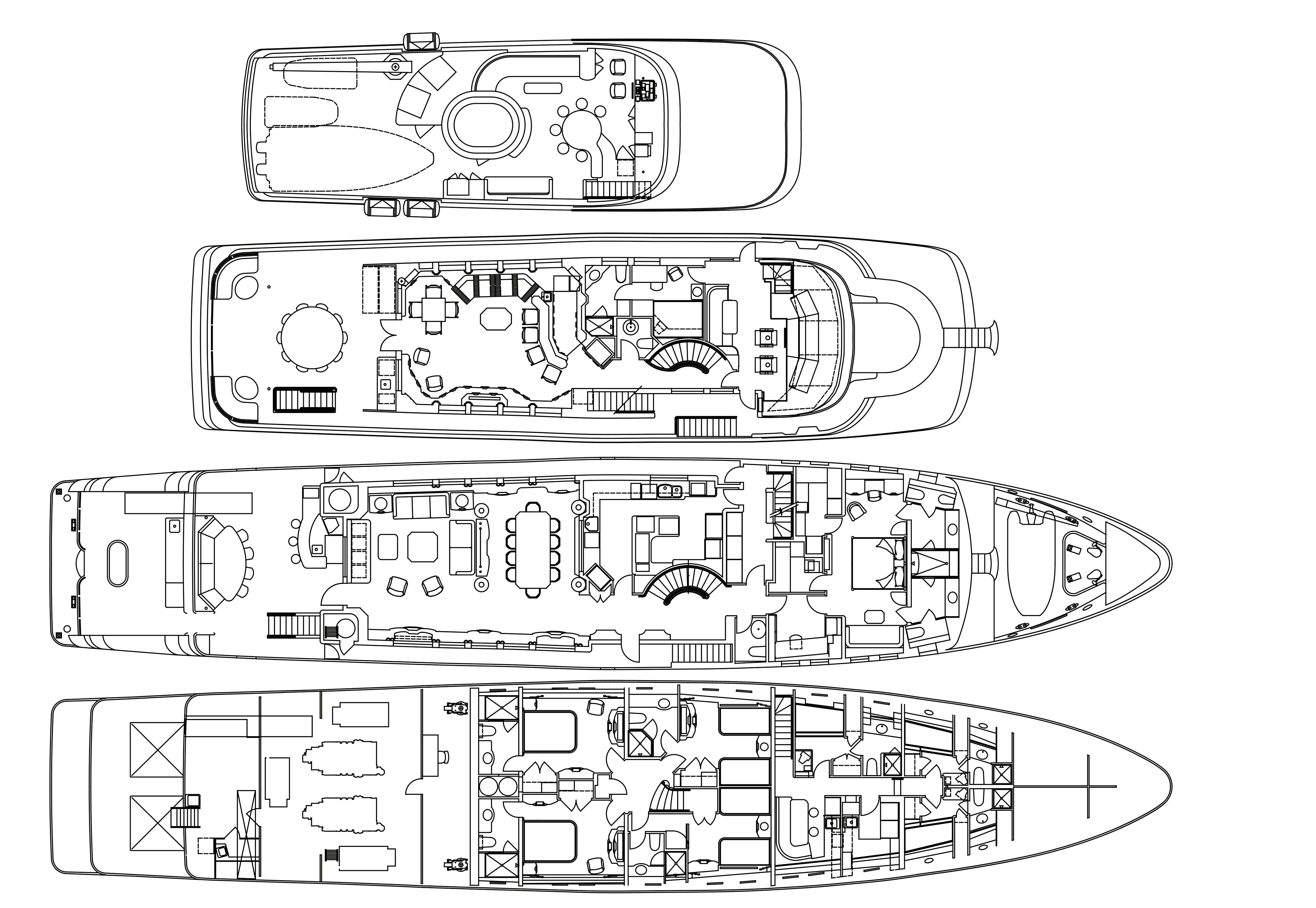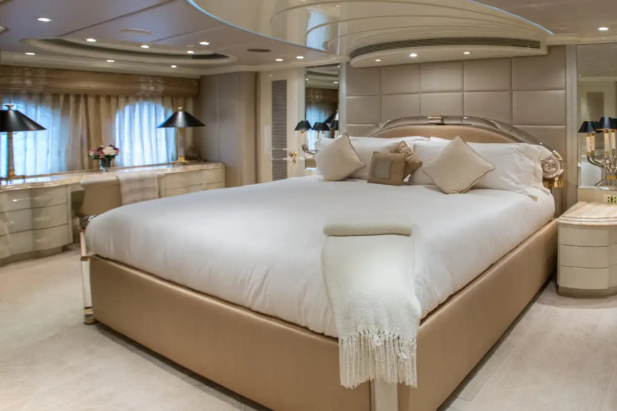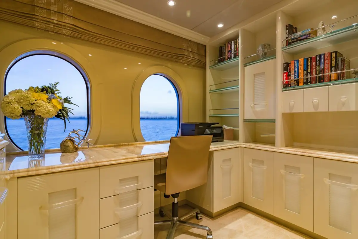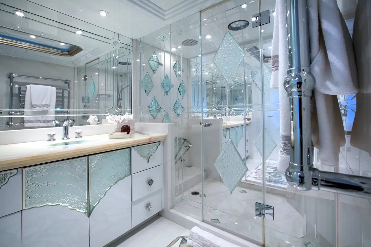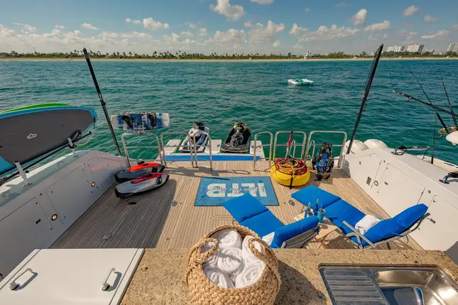 Another great asset is the extended, mezzanine main deck aft whose upper level is a relaxed lounge bar in deep shade while the lower level is an excellent beach club area where you can lounge at the water’s edge with big umbrellas for shade and there’s a floating dock for jet skis and a wide array of other watersports toys. Her main guest tender is a 9-metre (33ft) Boston Whaler fitted with gyro stabilisers and fully equipped for deep-sea fishing excursions. Her inventory also includes an 18ft RIB, SeaBobs, Hobie pedal/sail kayaks, waterskis, a wakeboard and inflatable tows, a full beach party setup and more.