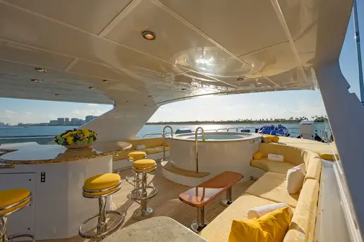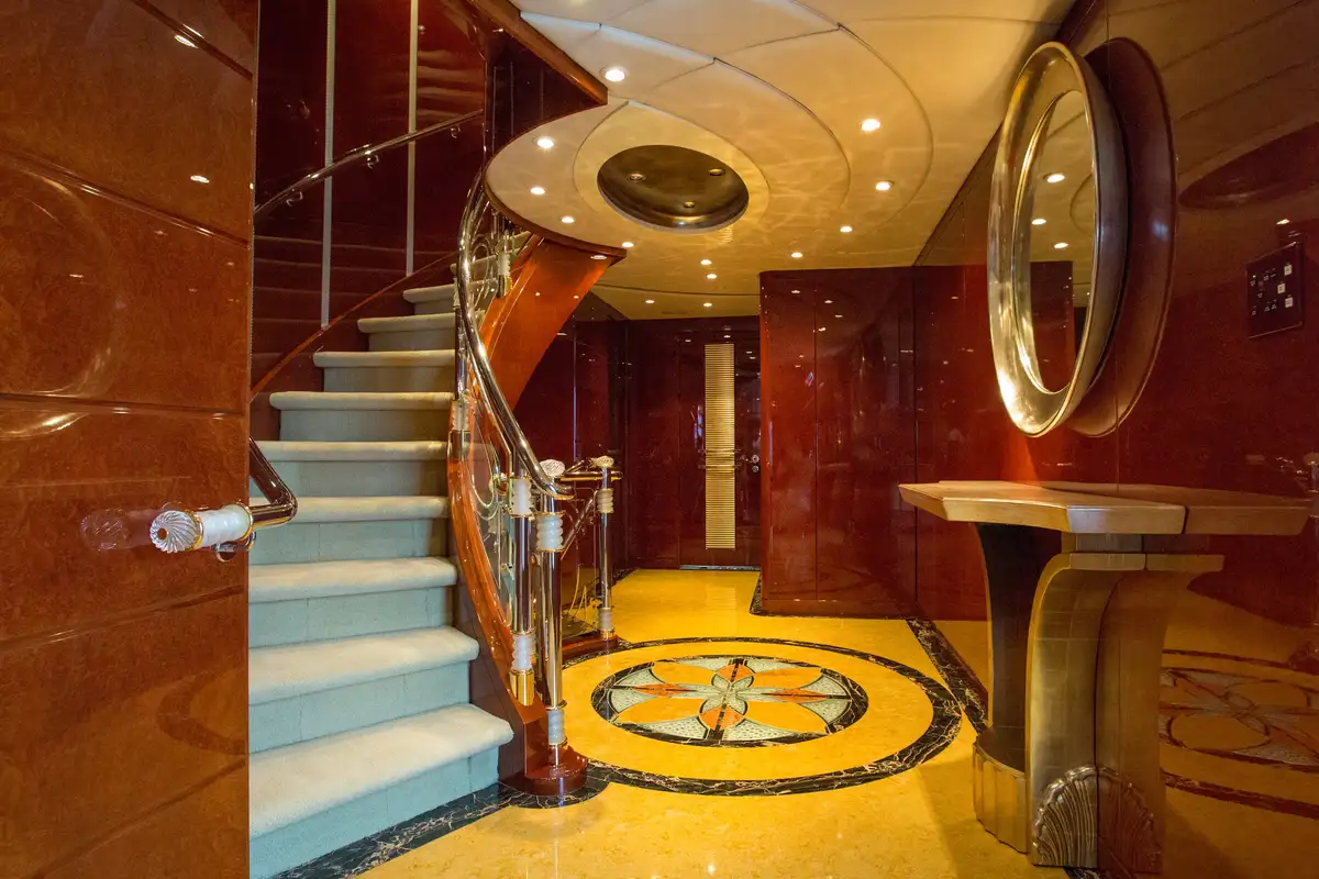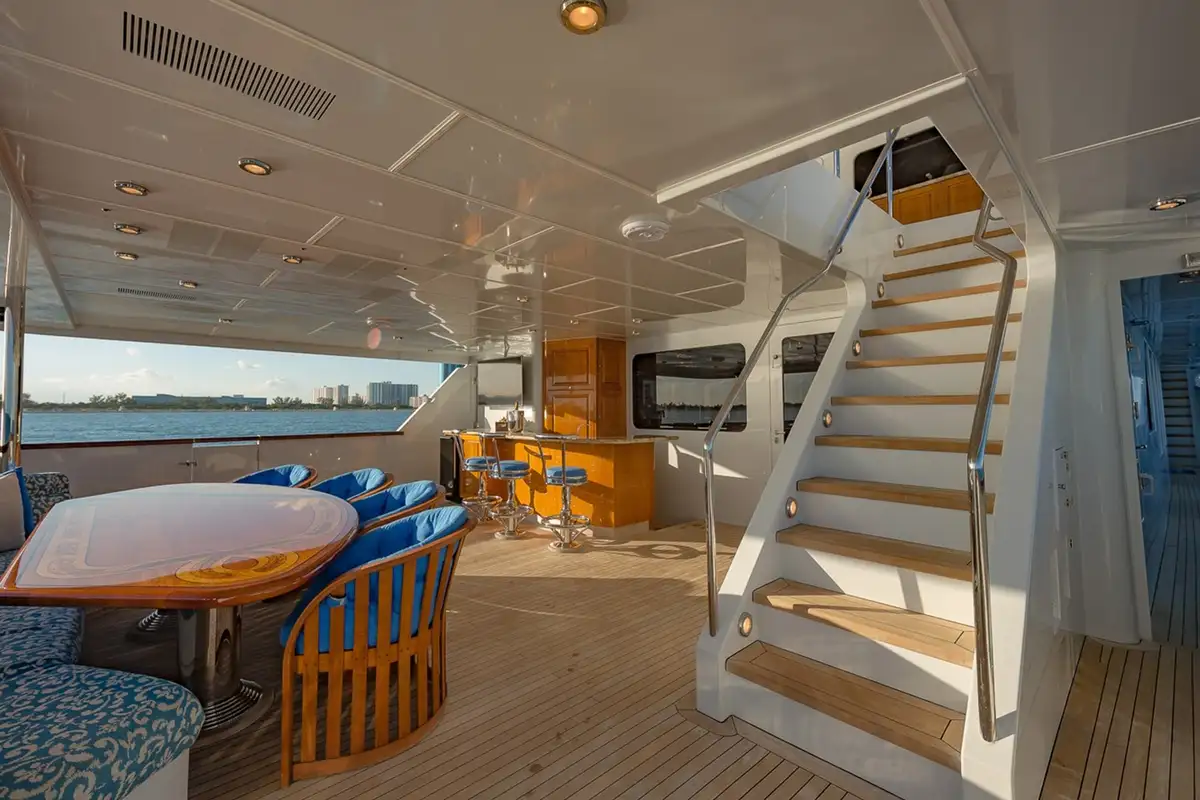 Her key features include an extra-large sundeck with a 10-person jacuzzi pool and a full-size bar that seats six guests, plus lounge areas in sun and shade – and a giant water slide for instant access to the sea. The upper aft deck is an elegant setting for outdoor dining with a big round table and a Portuguese bridge leads down from the forward end of the upper deck to a secluded sunbathing area on the foredeck for private relaxation.