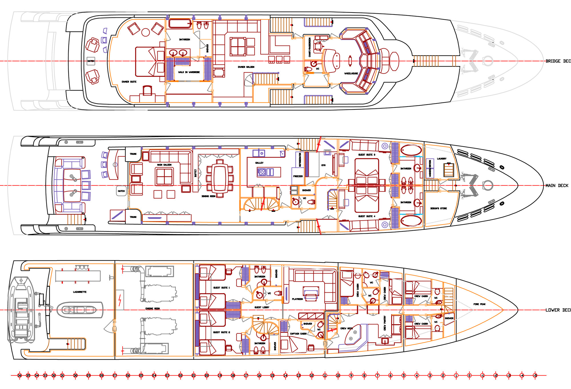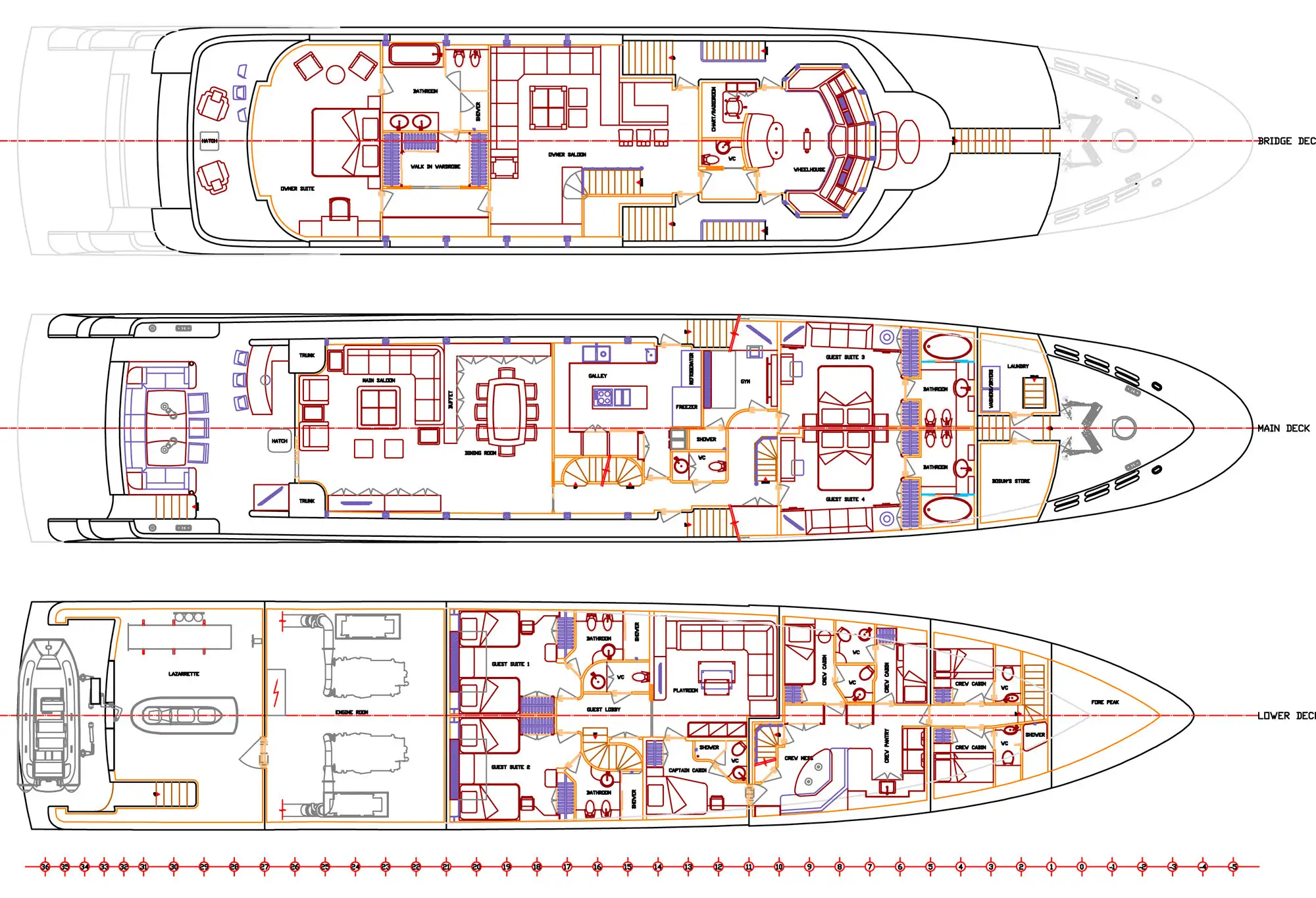 With delightful generously-sized guest suites over three decks, I SEA can offer you and your guests the perfect spaces to relax and unwind while enjoying an unforgettable cruise on this stunning yacht. With an upper deck master suite, two main deck double VIP suites, and two more twin berth suites on the lower deck – each with an additional pullman berth, I SEA’s versatile sleeping arrangement is perfect for groups of friends and families with children. Combine that with stunning contemporary lounge areas and wonderful deck spaces, and I SEA, her captain and crew assure you of an extraordinary experience.