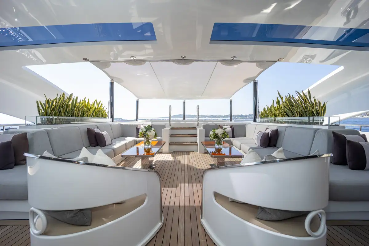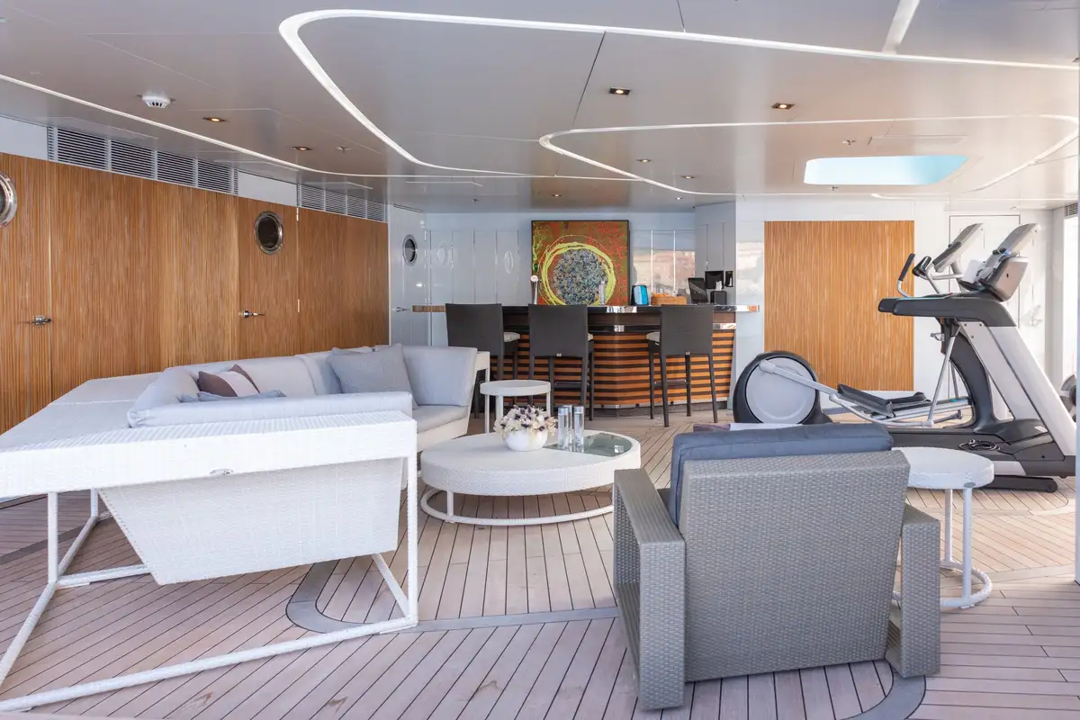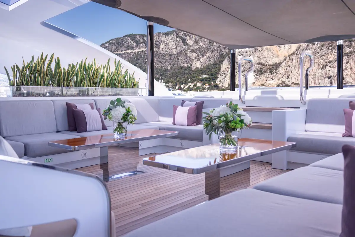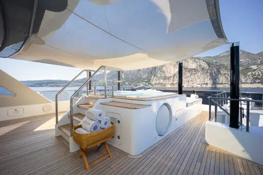 Delivered in 2013 and fresh from a full refurbishment in 2019, this 65m (213.3ft) yacht has a sizeable 106sqm (1,141sqft) sun deck that guests love, with two lounge areas, one shaded and one sunny, a fully equipped sit-up bar and a large jacuzzi with sun pads aft. Surrounded by wraparound tinted windscreens, the calm and cool sun deck dining area can be utilized even on the windiest of days.