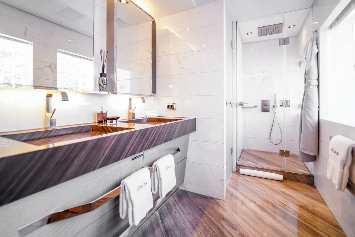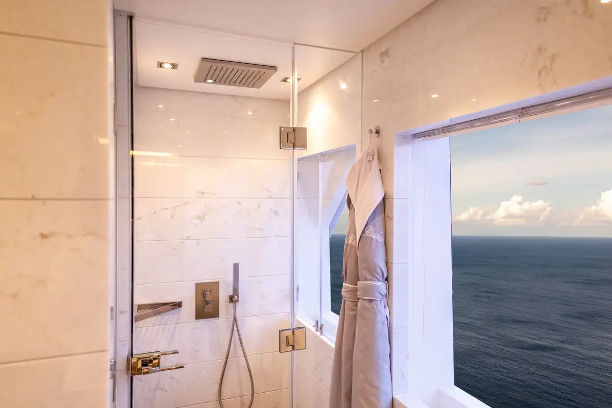 As popular as the sun deck undoubtedly is, the real star of this spectacular show is the spacious air-conditioned beach club with fully equipped bar, sauna, day head and shower. A 22sqm (237sqft) fold-out swimming platform and a 10sqm (108sqft) drop-down sea terrace to port, bring guests a genuine sense of the outdoors enhanced by the natural light shimmering through the glass-bottomed pool on the main deck aft. It's a stunning space. With additional lounging, sunbathing, and nine other dining areas on the foredeck, bridge deck and main deck, she has abundant options for social and intimate al fresco relaxation, fun and entertainment.