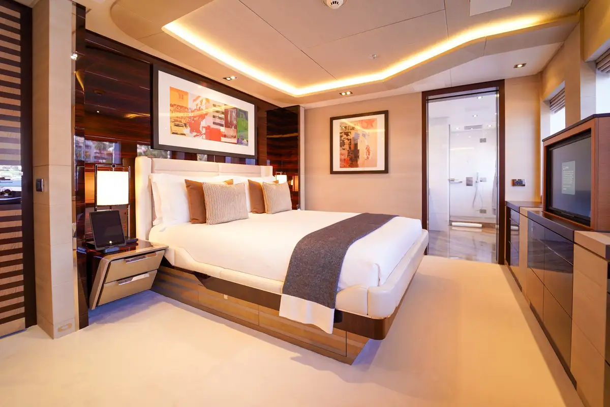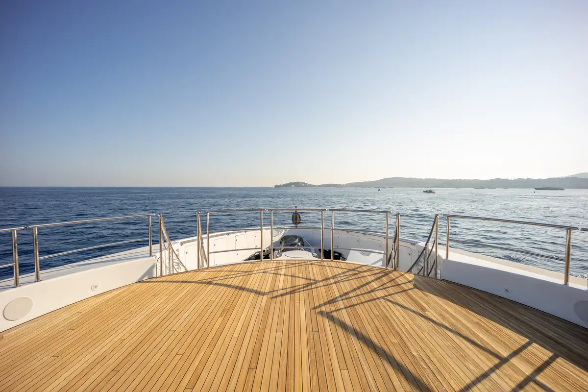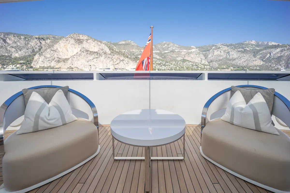 She welcomes 12 guests in six double cabins, a full-beam master suite on the main deck with study and full-height glass sliding doors opening onto a private breakfast balcony to starboard, a VIP suite on the bridge deck and four lower deck double cabins.
