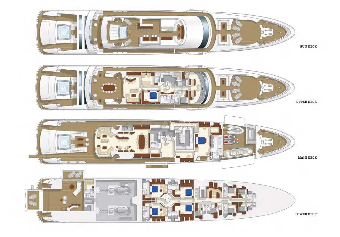 - Six guest cabin layout with full beam main deck master including a private study and balcony