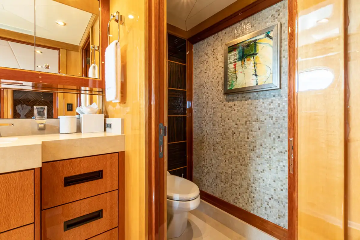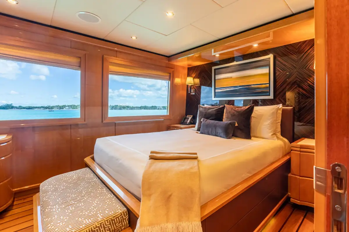 IMPROMPTU accommodates 12 guests in six stunning staterooms. The split-level master stateroom features a king-size bed, an elevated lounge with 180-degree views, and his-and-hers en-suite bathrooms featuring a steam shower, Jacuzzi tub, vanity and walk-in closet adjacent. A private study with a desk is located at the entrance. The bridge deck offers a VIP stateroom surrounded by large windows. On the lower deck, you'll find three king staterooms and a twin cabin with a Pullman, each with desk areas and shower en-suites. The charter yacht’s versatile accommodation layout makes her primed family-friendly voyages.