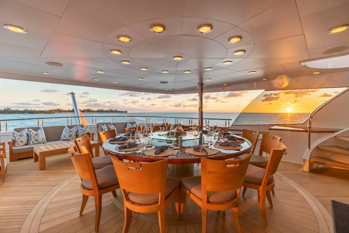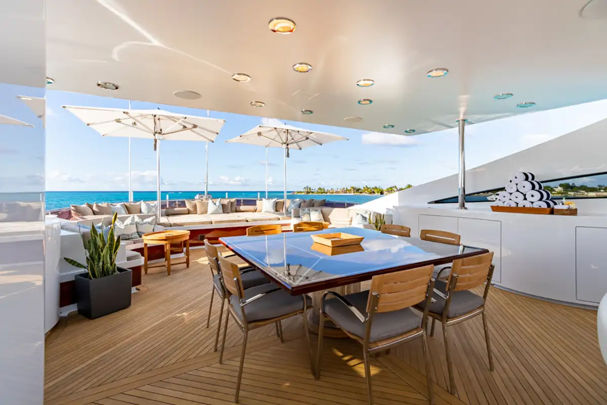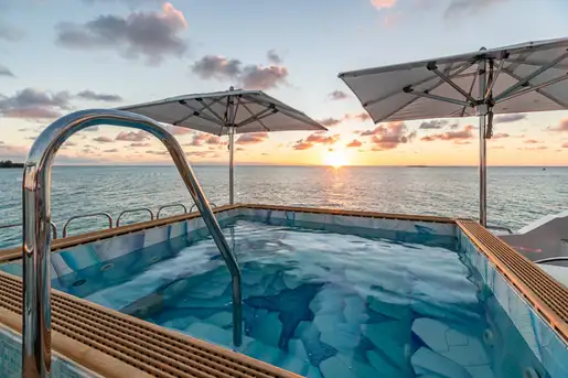 The sundeck is a highlight of IMPROMPTU, offering a central custom-raised waterfall Jacuzzi for 12 guests, complemented by beautiful blue intricate tilework. The area also includes a large outdoor bar, a barbeque, and a dayhead. The dining table invites alfresco meals under the stars, while chaise loungers, an oversized sunpad and built-in seating areas provide ample space for relaxation. Additionally, the outdoor cinema with surround sound sets the stage for movie nights under the stars, creating unforgettable moments with family and friends.