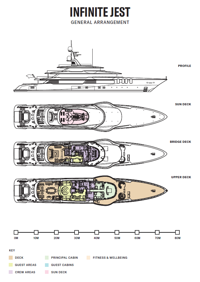 Step aboard 74.9m (245.8ft) INFINITE JEST and discover a yacht that doesn’t just cruise the world – it makes you feel at home while doing it. With five decks of expansive, elegant living, she combines the sophistication of high design with the warmth and ease of a private residence.
