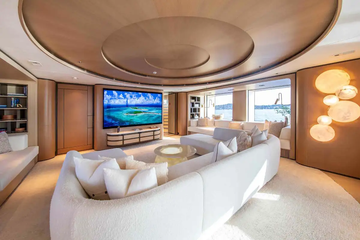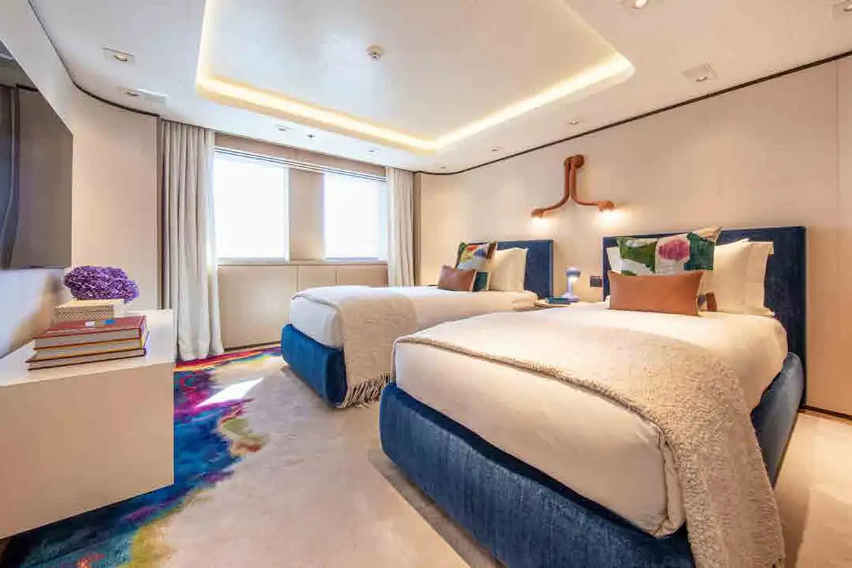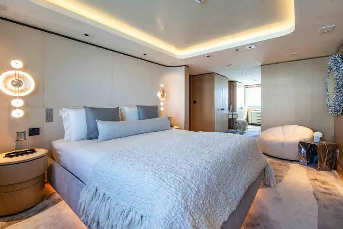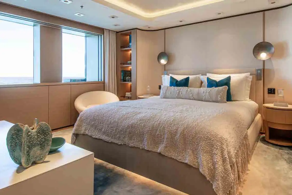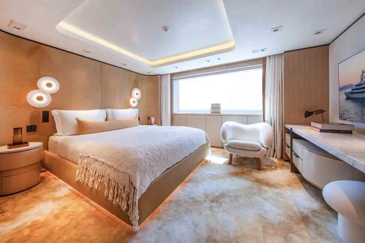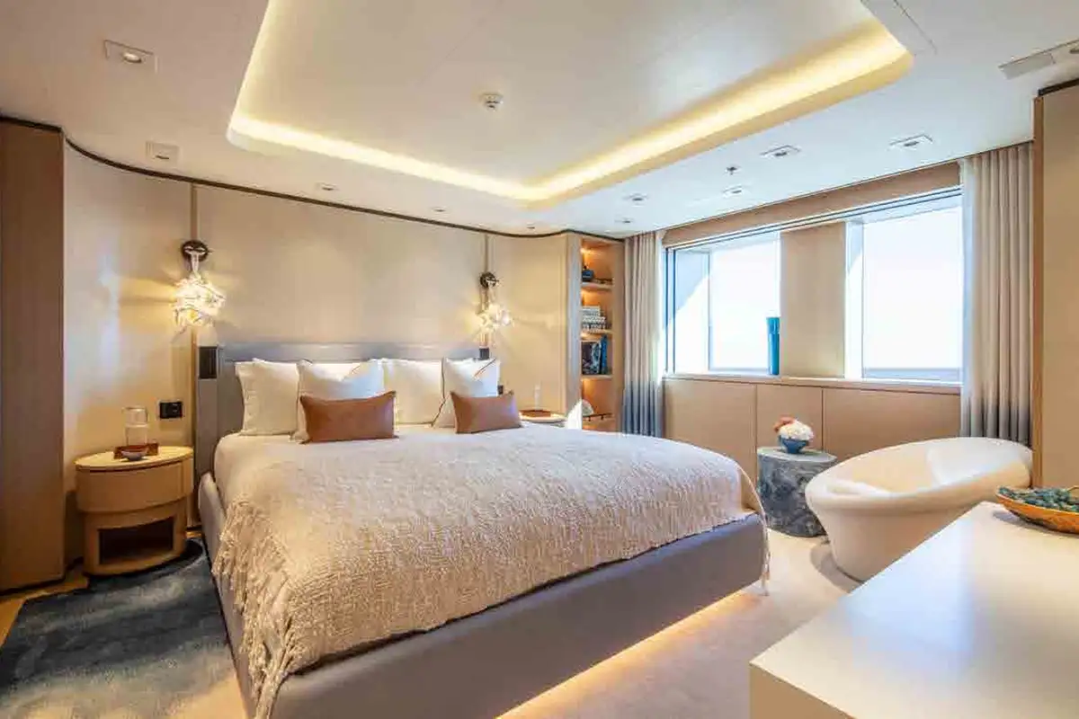 From sunrise dips in the main deck pool to sunset cocktails on the bridge deck, INFINITE JEST offers unparalleled versatility. Relax in the beach club, work out in the gym, or enjoy one of several al fresco dining and entertaining spaces designed for every mood and moment. Her adaptable cabin layout sleeps 12 guests plus two staff in refined comfort. The vast principal suite boasts direct access to a private deck – perfect for peaceful mornings and spectacular views.