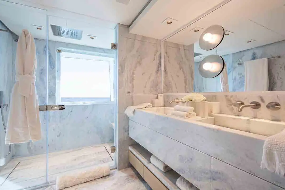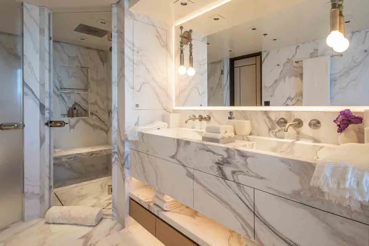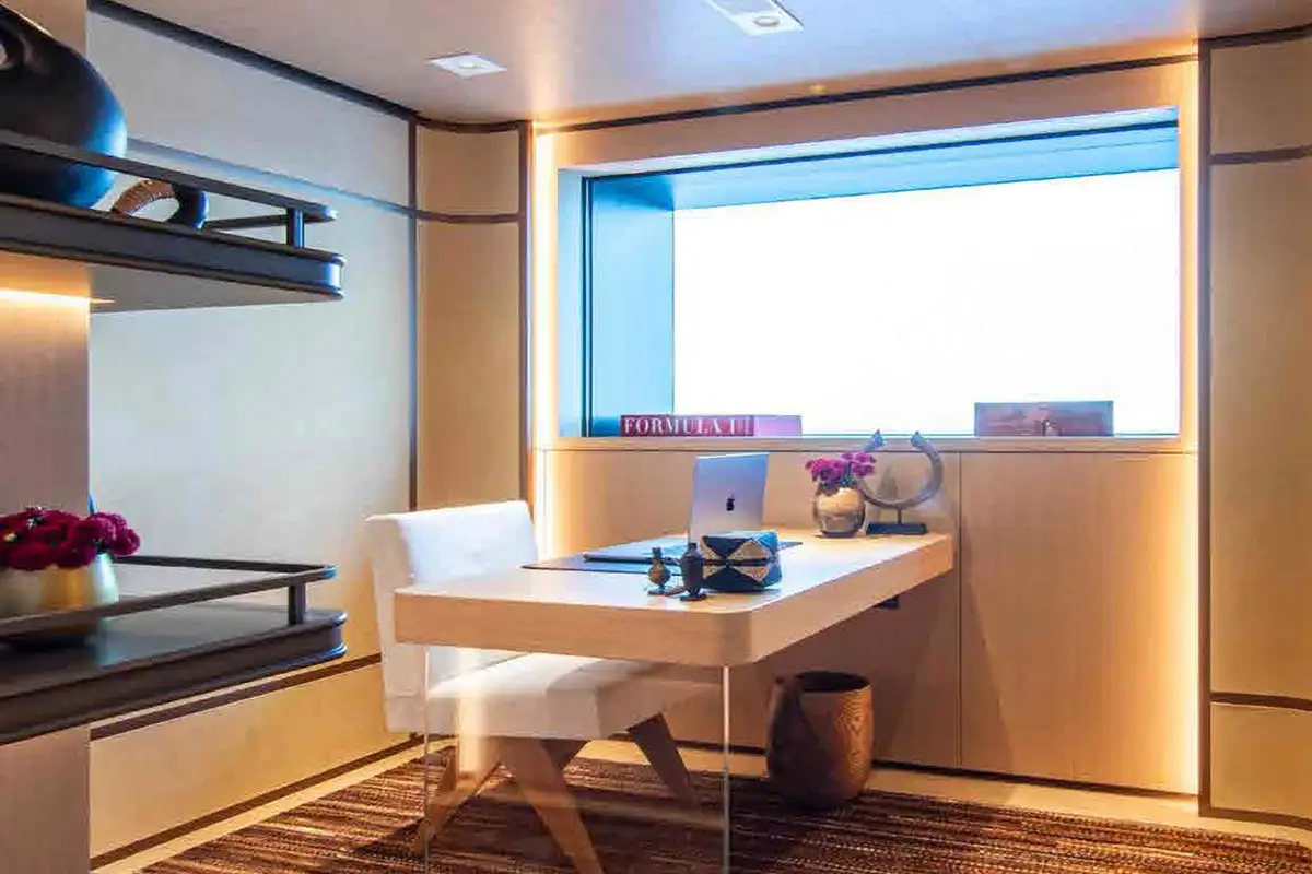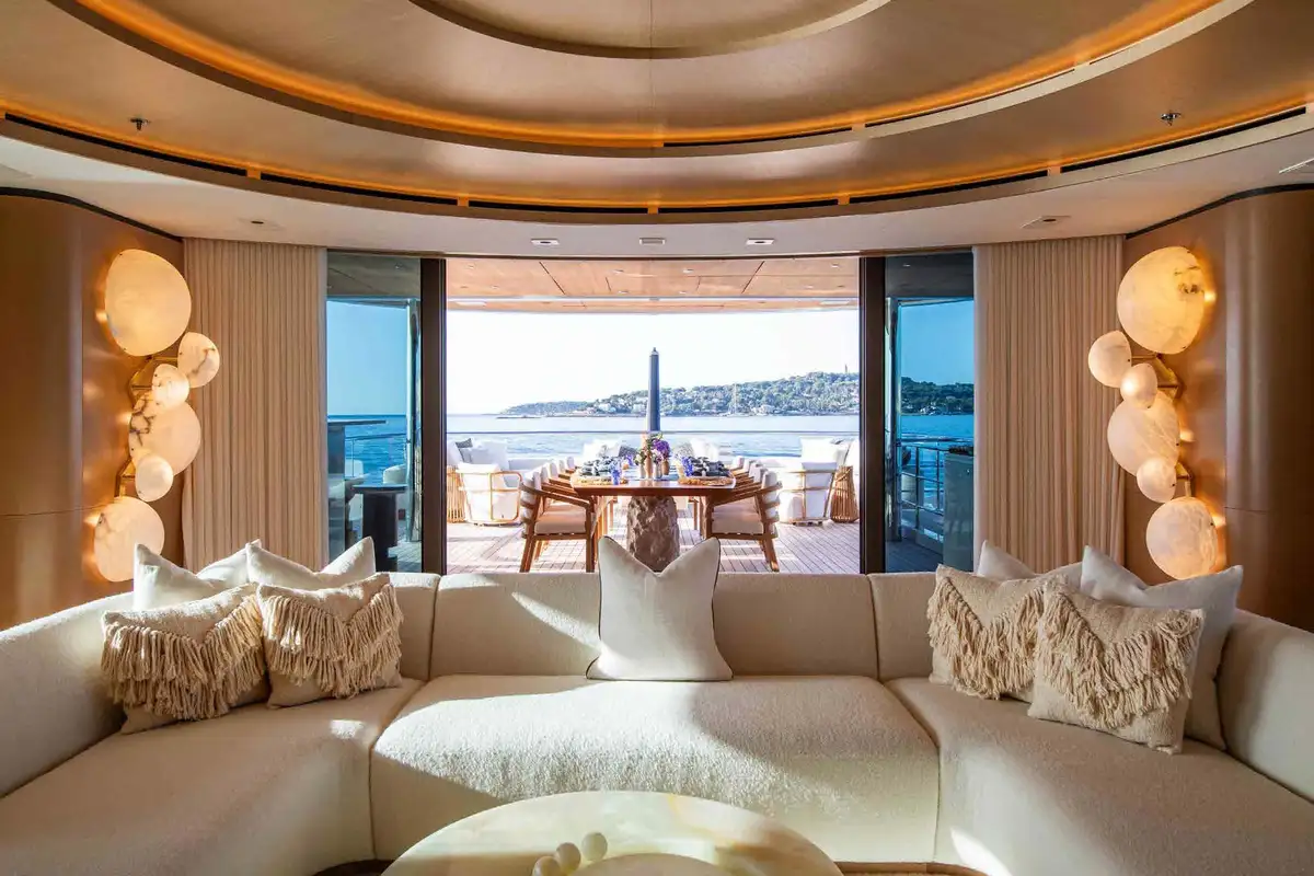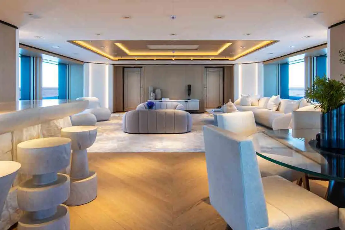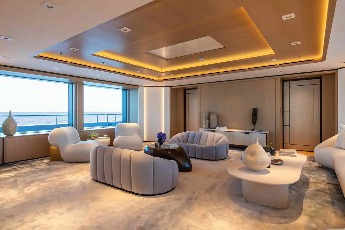 From sunrise dips in the main deck pool to sunset cocktails on the bridge deck, INFINITE JEST offers unparalleled versatility. Relax in the beach club, work out in the gym, or enjoy one of several al fresco dining and entertaining spaces designed for every mood and moment. Her adaptable cabin layout sleeps 12 guests plus two staff in refined comfort. The vast principal suite boasts direct access to a private deck – perfect for peaceful mornings and spectacular views.