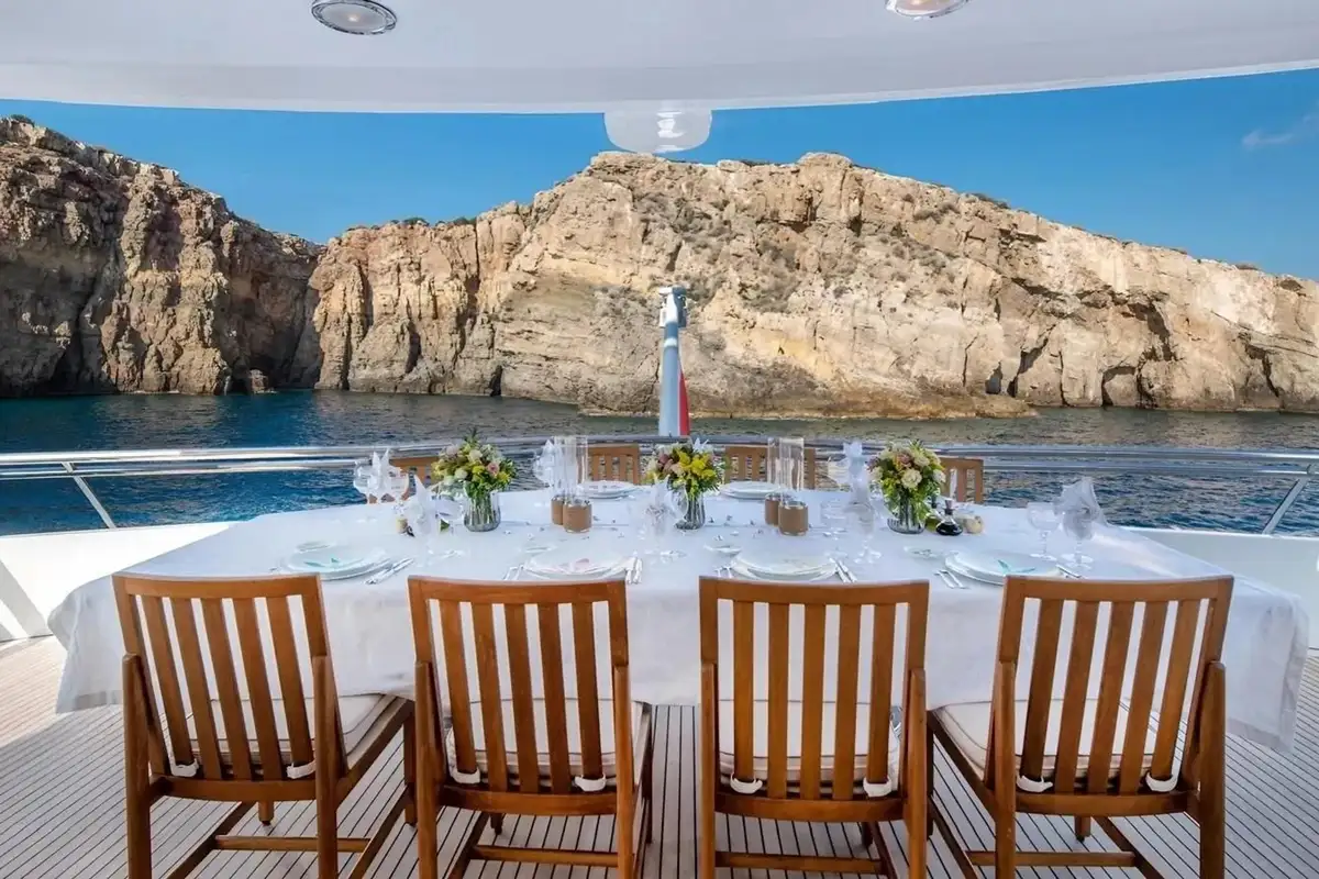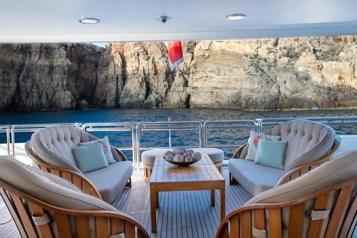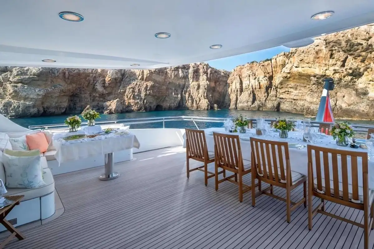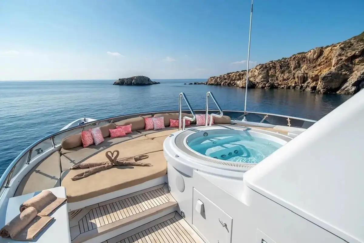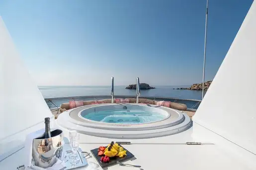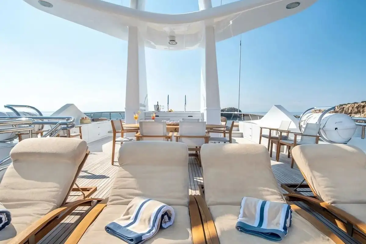 Returning to the aft deck the sundeck above beckons. A serene retreat with a jacuzzi and vast forward sunpads. An al fresco dining area and free-standing sun loungers on the aft deck complete the outdoor offerings, ensuring ample space for basking in the sun or enjoying a meal with a view.