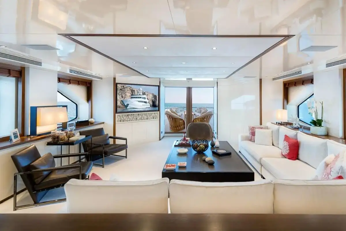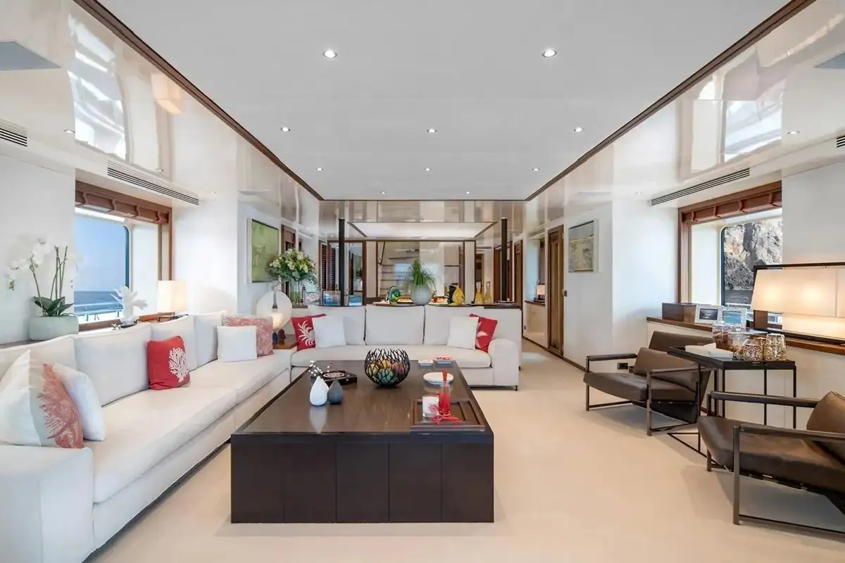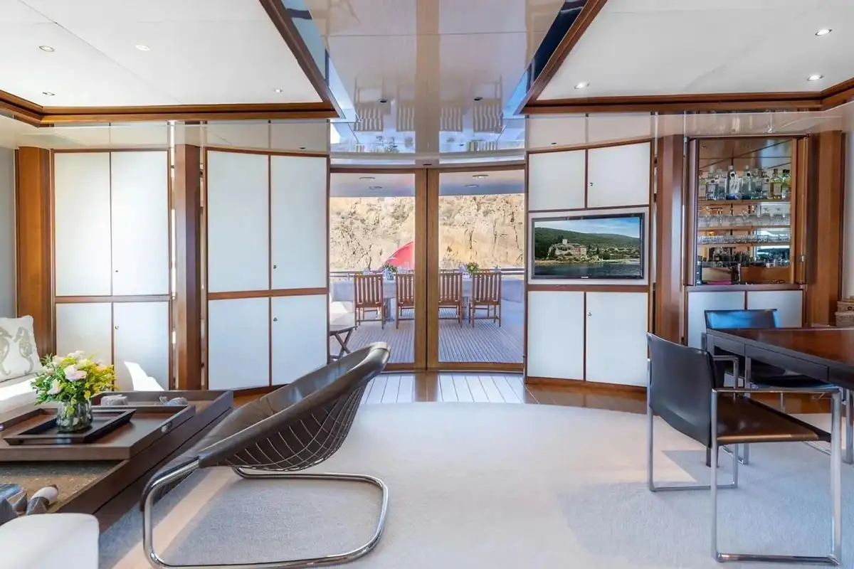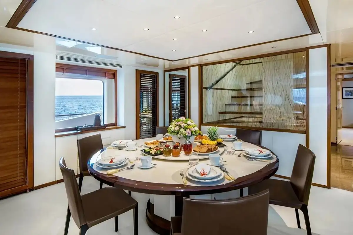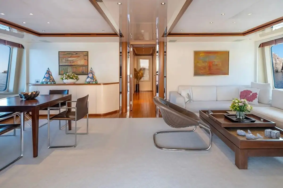 On the main deck, a staircase from the swim platform leads to the cockpit, where free-standing furniture sets the tone for relaxation. The main deck lounge has an L-shaped sofa to port accompanied by armchairs to starboard the space exudes elegance with its light furnishings and wooden countertops. The formal dining area is ahead and provides a perfect setting for exquisite meals.