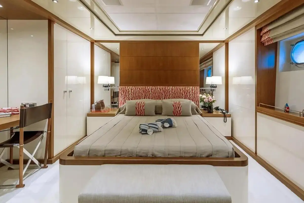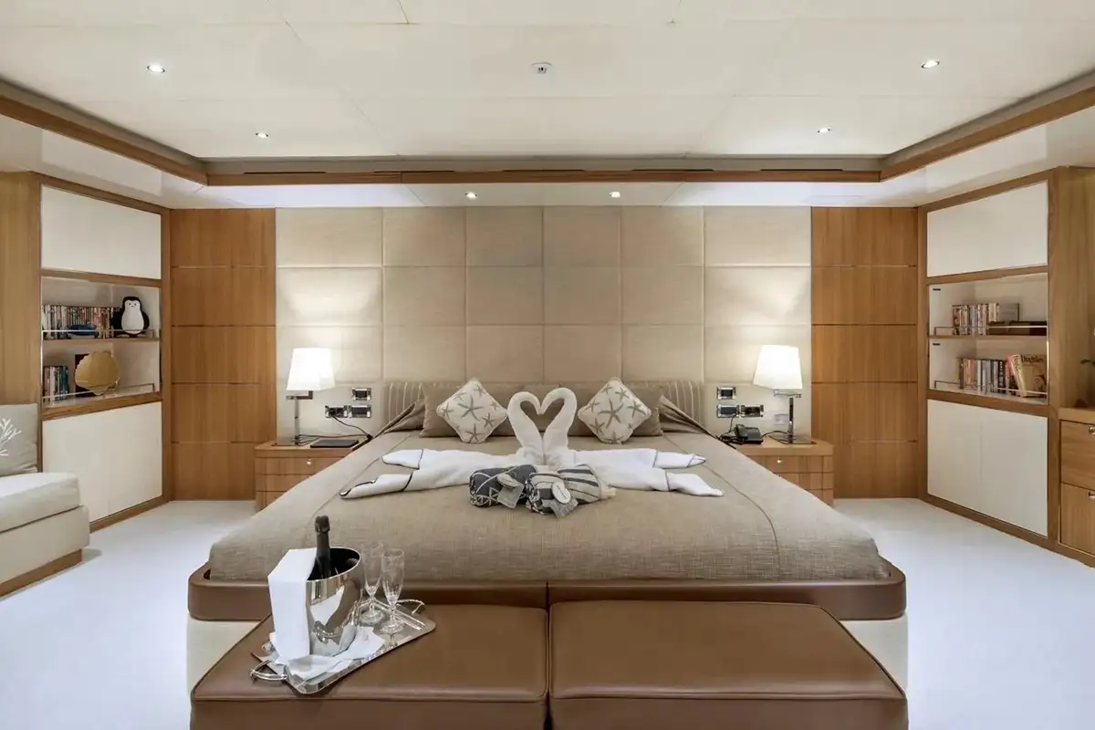 A dedicated lobby area precedes the entrance to the master suite, which features a private office, separate his and hers en suite bathrooms, and a large aft-facing king-sized berth. The suite makes a sumptuous retreat to relax and unwind.