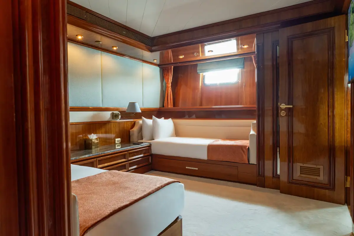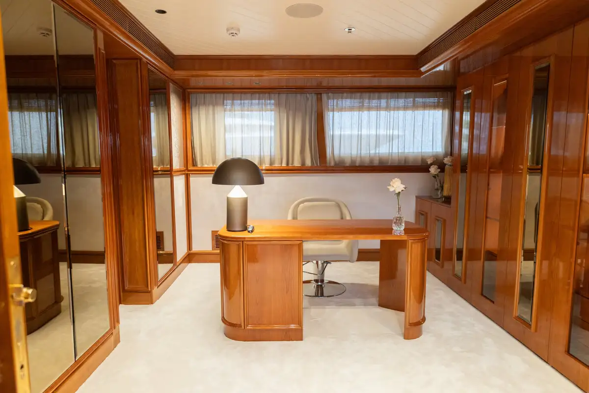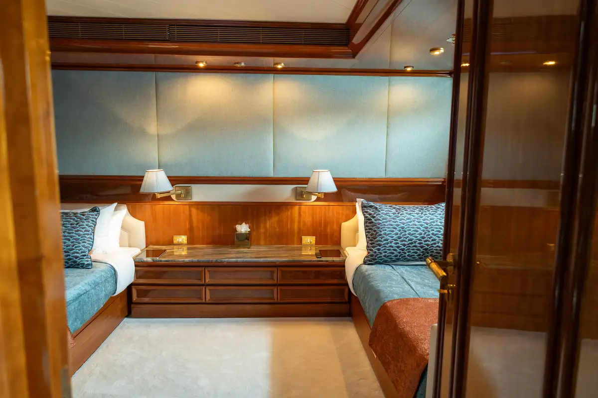 The master cabin is a haven of luxury, featuring a spacious main bedroom with dedicated lounge and vanity area, an expansive walk-in wardrobe equipped with storage for clothing and footwear, a well-appointed office space, and his and hers bathrooms. The bridge deck boasts a charming VIP cabin, while the lower deck houses four cabins - two doubles and two twins, each offering pullman beds.