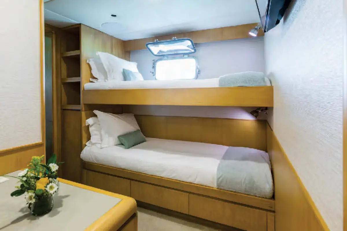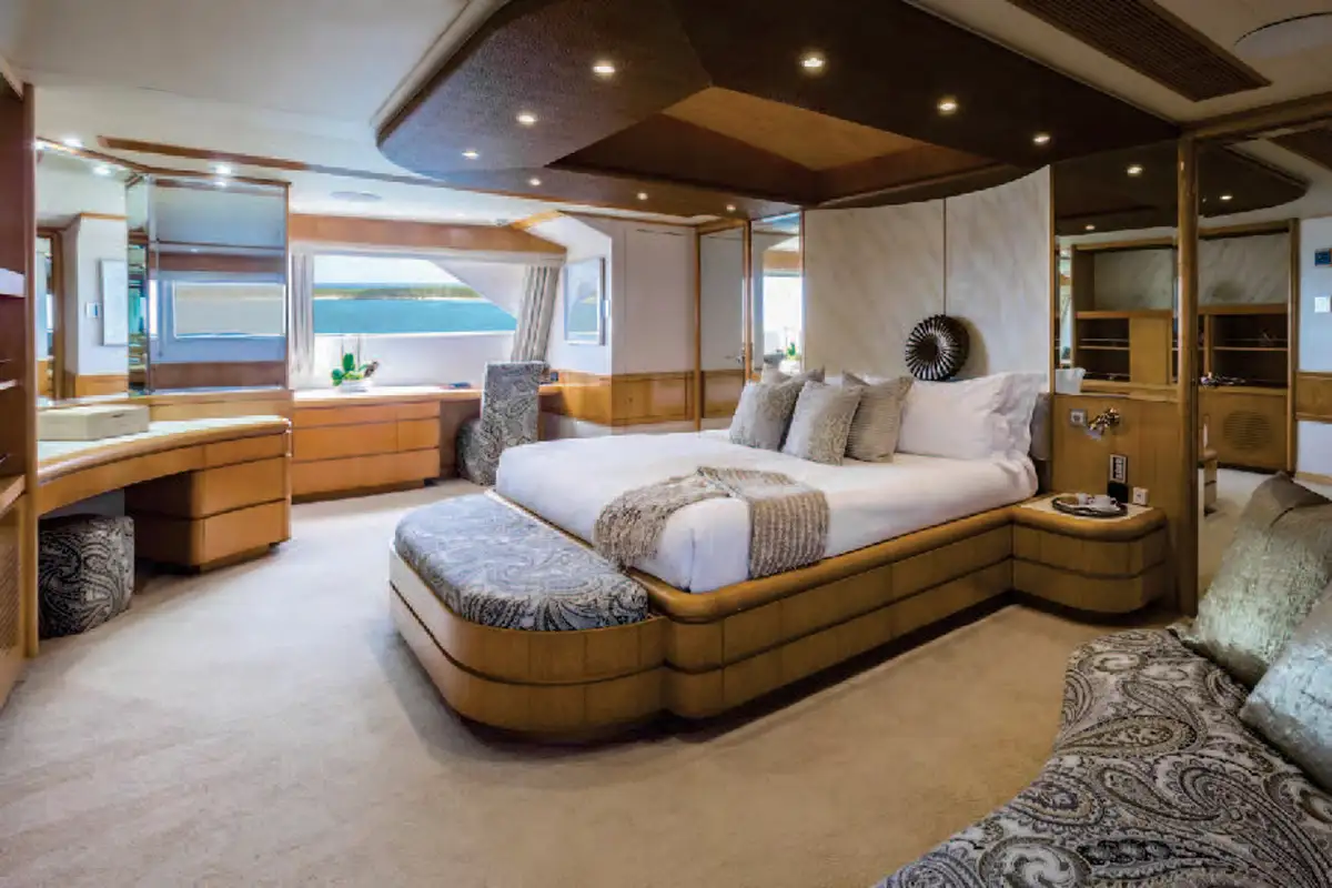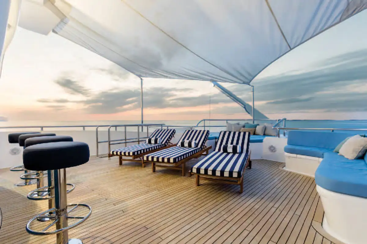 When you’re anchored in a coral lagoon, her sundeck is a wonderful place to be. There’s a jacuzzi pool, plenty of seating, a cocktail bar, classic sun loungers and a large day bed, all with a commanding view out over the sea.